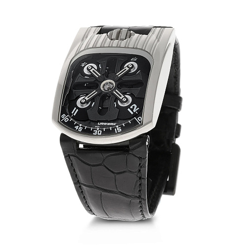 - Никаких стрелок, цифр и циферблатов в привычном понимании. Urwerk переворачивает само понятие времени — вы не смотрите на часы, вы наблюдаете за движением архитектурной системы.