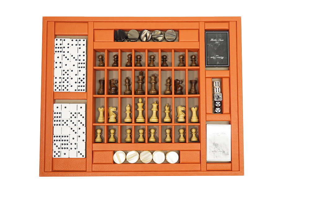 2 колоды карт,1 игра в домино,30 ацетатных фишек для нардов,4 кубика из смолы,1 металлический куб.Набор из 32 деревянных шахматных фигур.