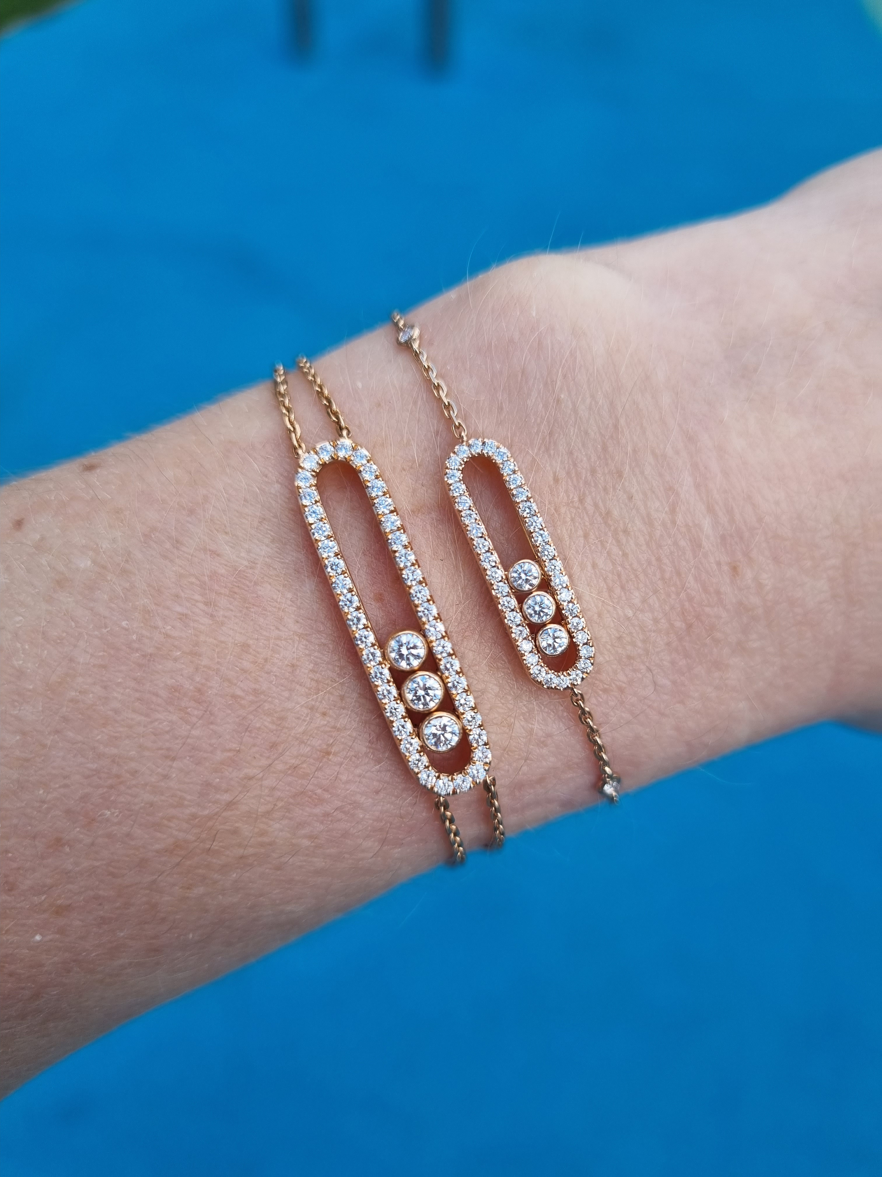 Браслет имеет размер 20х5 мм, а его длина регулируется от 14 до 17,5 см, что позволяет ему идеально подходить к любому запястью. Особое внимание привлекает вставка из трех подвижных бриллиантов и бриллиантовое паве общим весом 0,30 ct. G/VS, которое добавляет браслету игривости и изящества.
