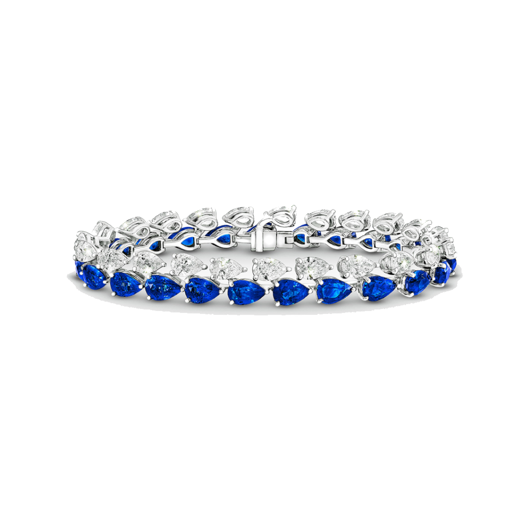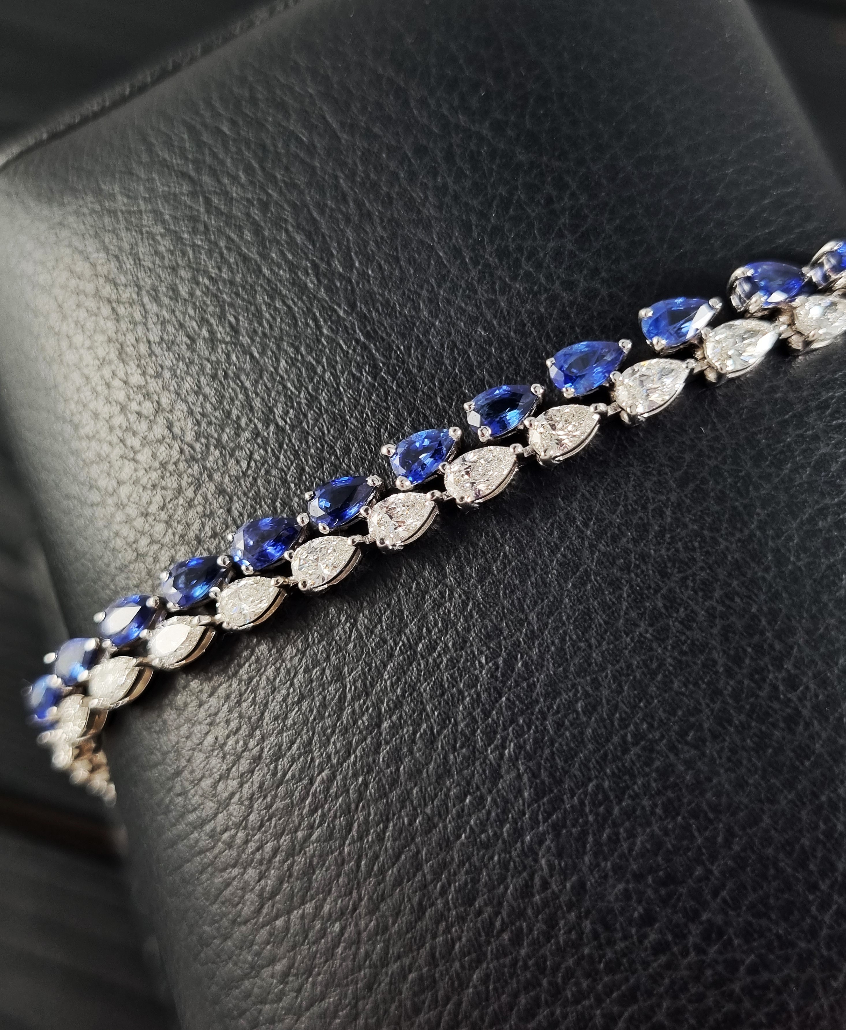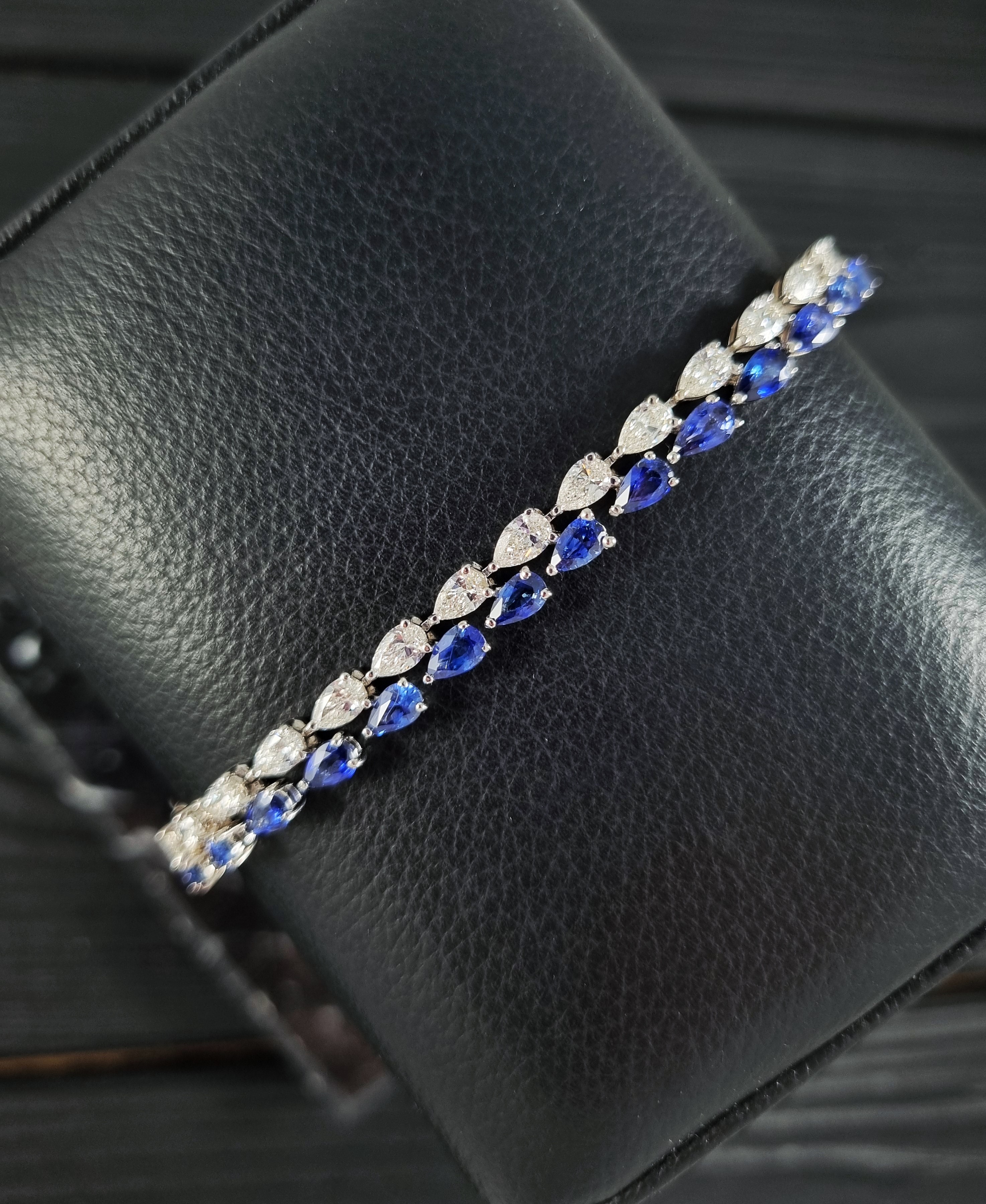 Браслет изготовлен из высококачественного белого золота 750°, что обеспечивает ему долговечность и изящество. Размер изделия составляет 17,5 см, что делает его универсальным для любого запястья. Особое внимание привлекает вставка из бриллиантов огранки "Груша" общим весом 4,61 ct. G/VS+, которые сверкают на фоне сапфиров огранки "Груша" общим весом 7,41 ct. Это сочетание драгоценных камней создает неповторимый блеск и роскошь.
