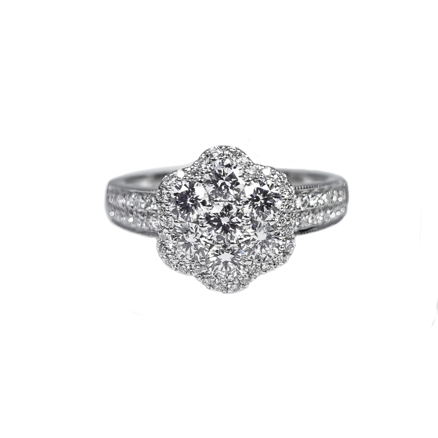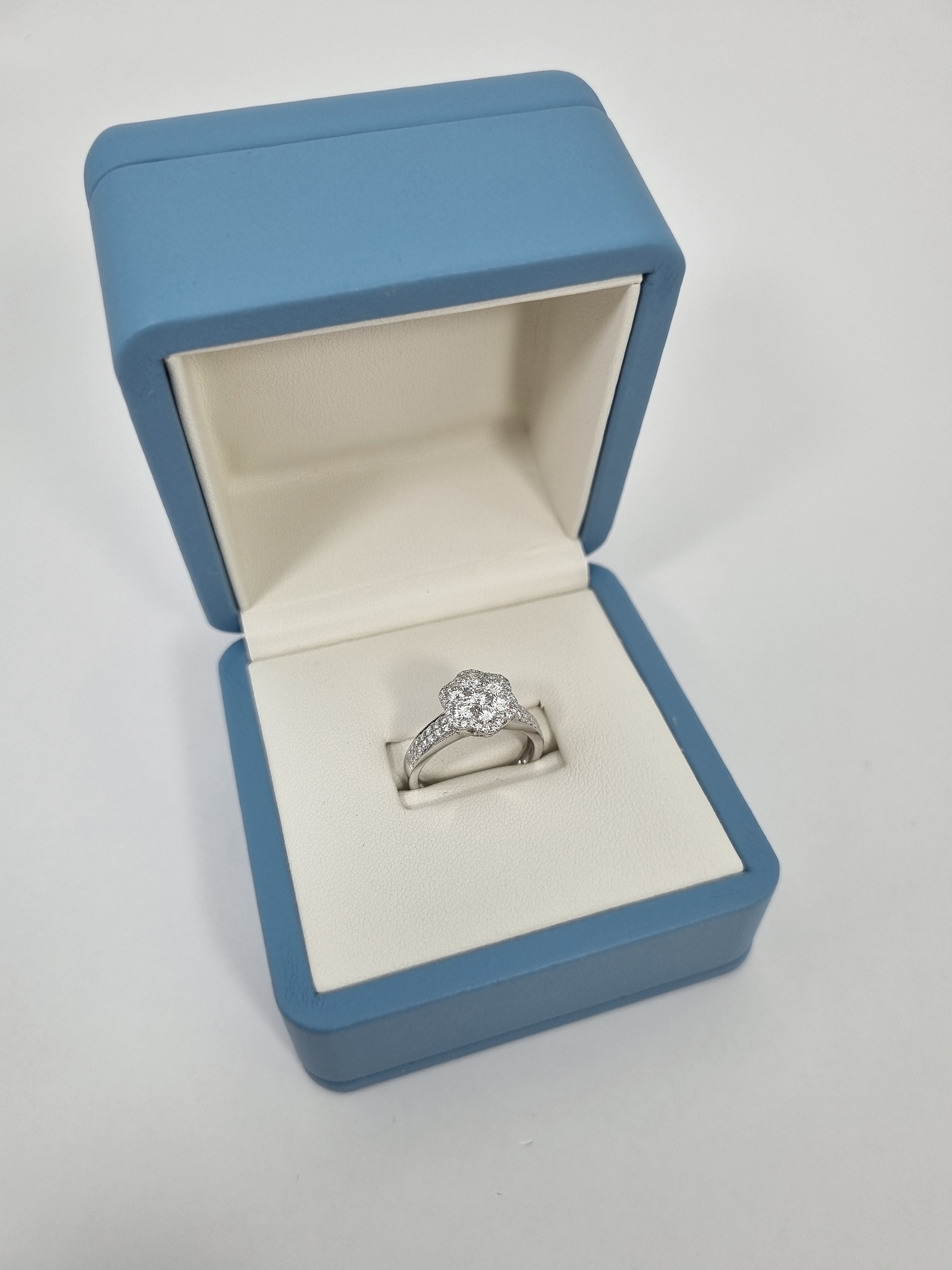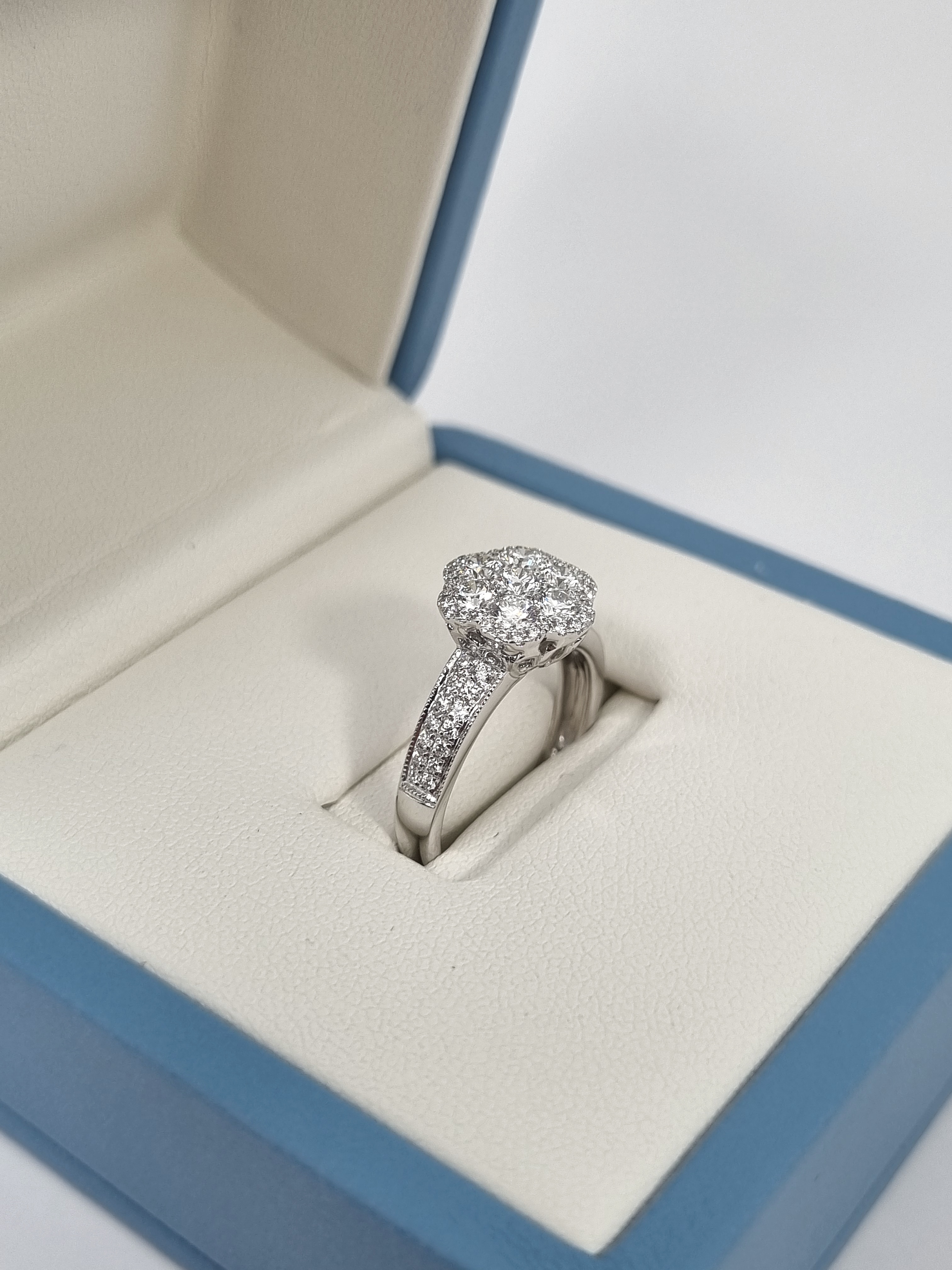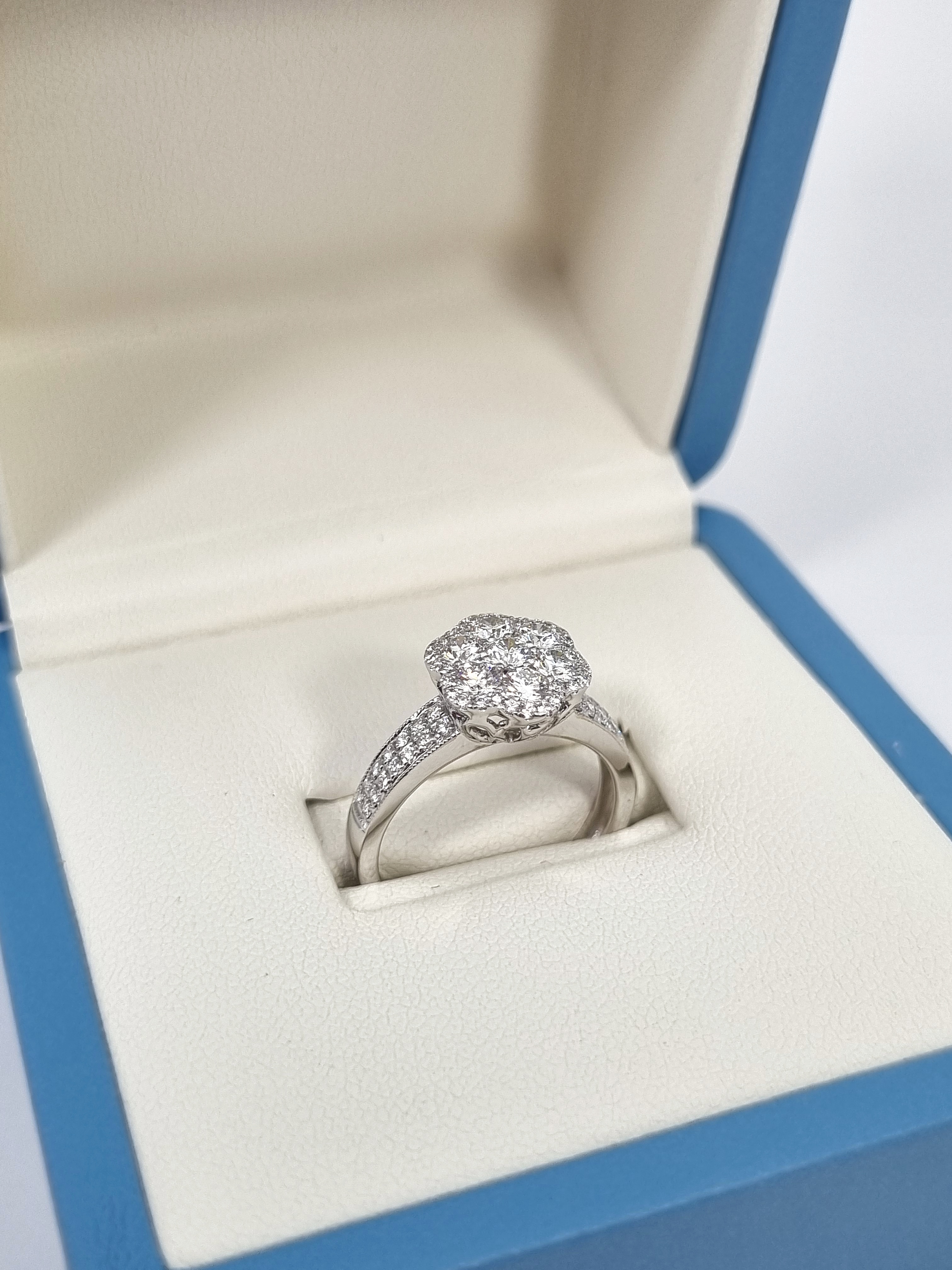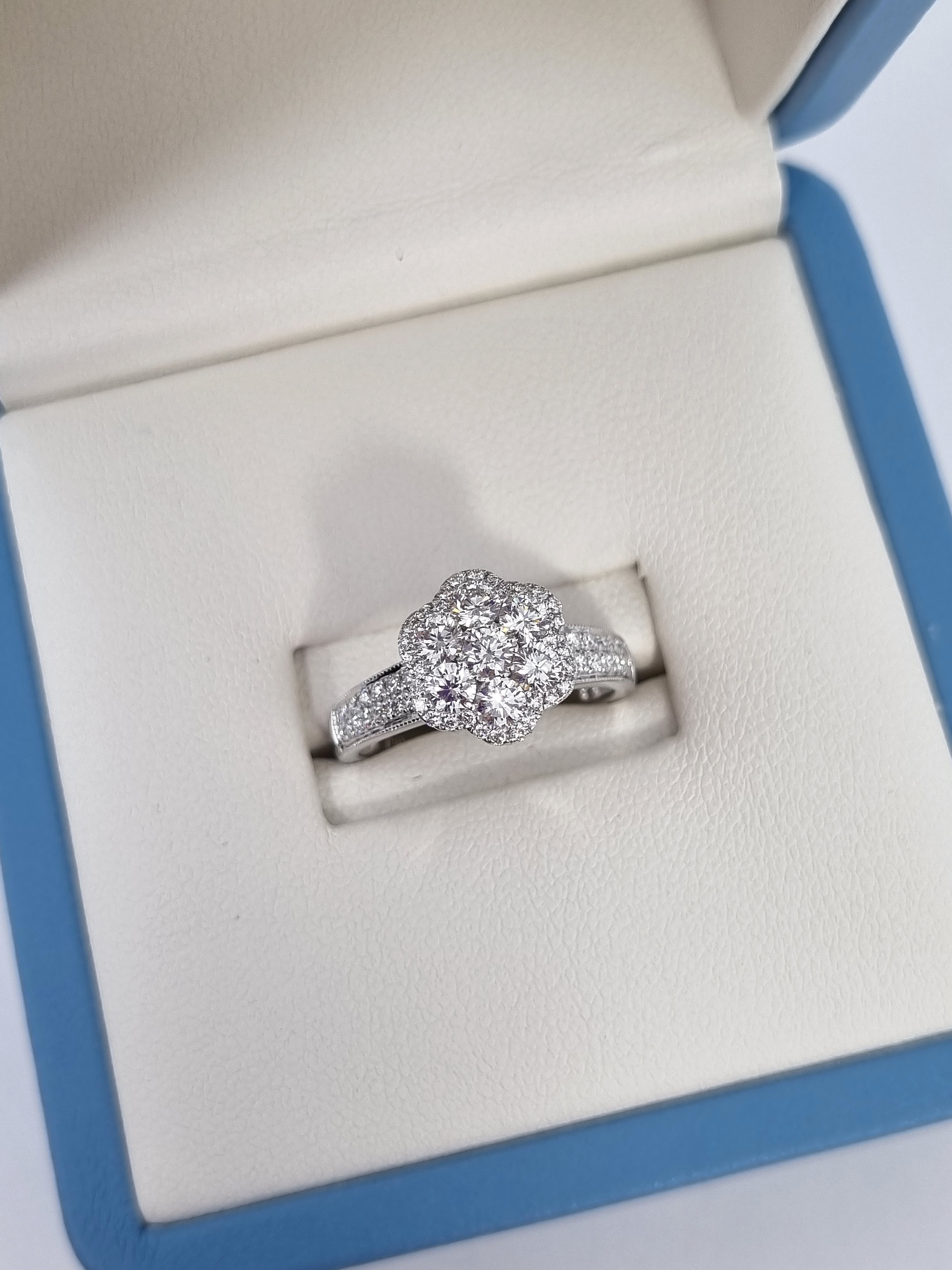 Кольцо Ring Flower выполнено из высококачественного белого золота 750°, что обеспечивает ему долговечность и изящество. Размер кольца составляет 16,5, что делает его идеальным выбором для тех, кто ценит комфорт и элегантность. Особое внимание привлекает вставка из 7 бриллиантов общей массой 1,05 ct, выполненная в технике Fine White/VS+, что придает кольцу неповторимый блеск и роскошь.