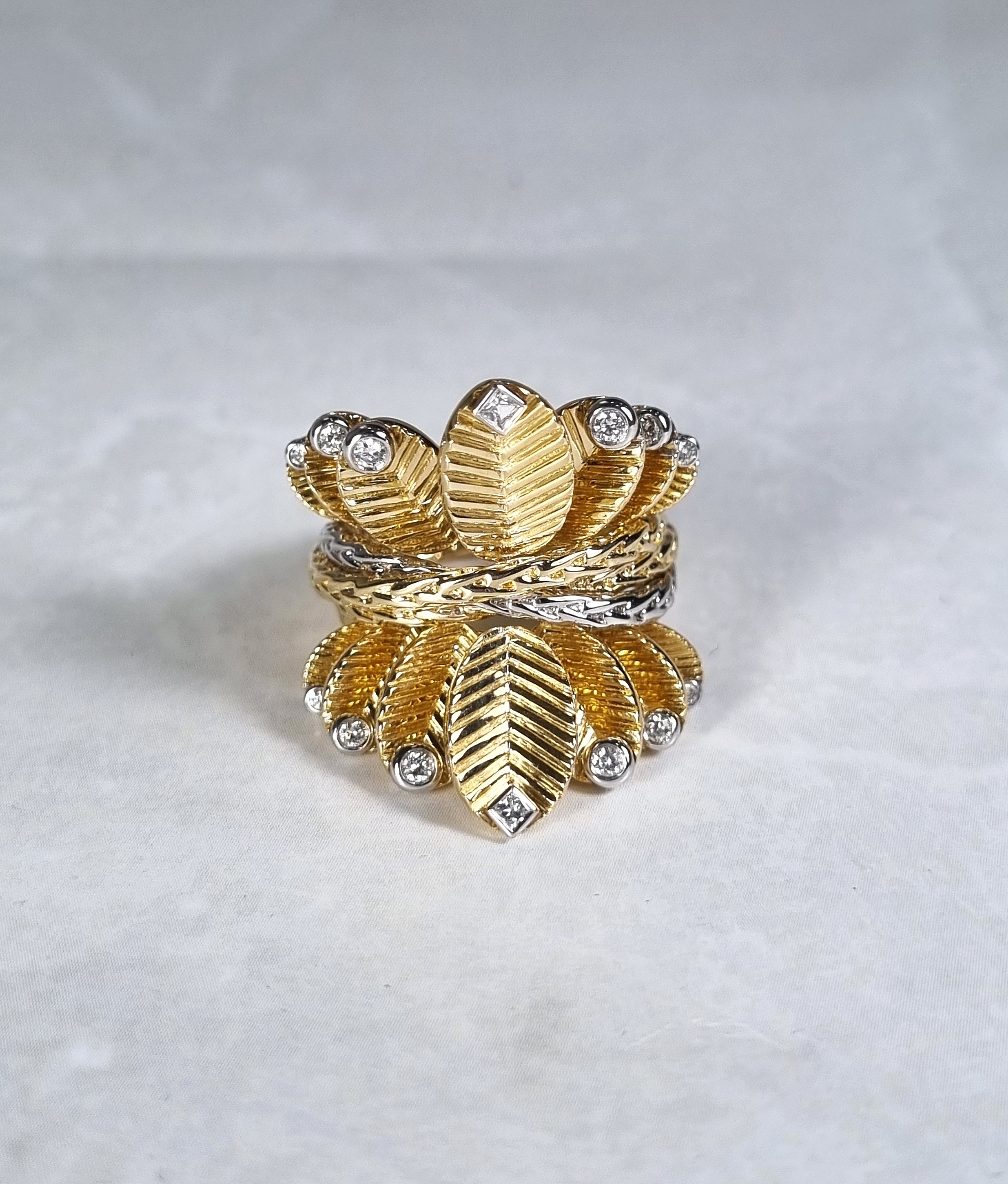 Grain de Café Ring – это изысканный и утонченный дизайн, который поражает своей красотой и изяществом. Этот великолепный перстень выполнен из белого и желтого золота 750 пробы, что придает ему особую глубину и насыщенность цвета. Но главное украшение этого шедевра – 12 бриллиантов бриллиантовой огранки и 2 бриллианта огранки принцессы общим весом 0,24 ct. Эти драгоценные камни играют на свету, создавая неповторимую игру бликов и отражений, которая будет завораживать всех вокруг.