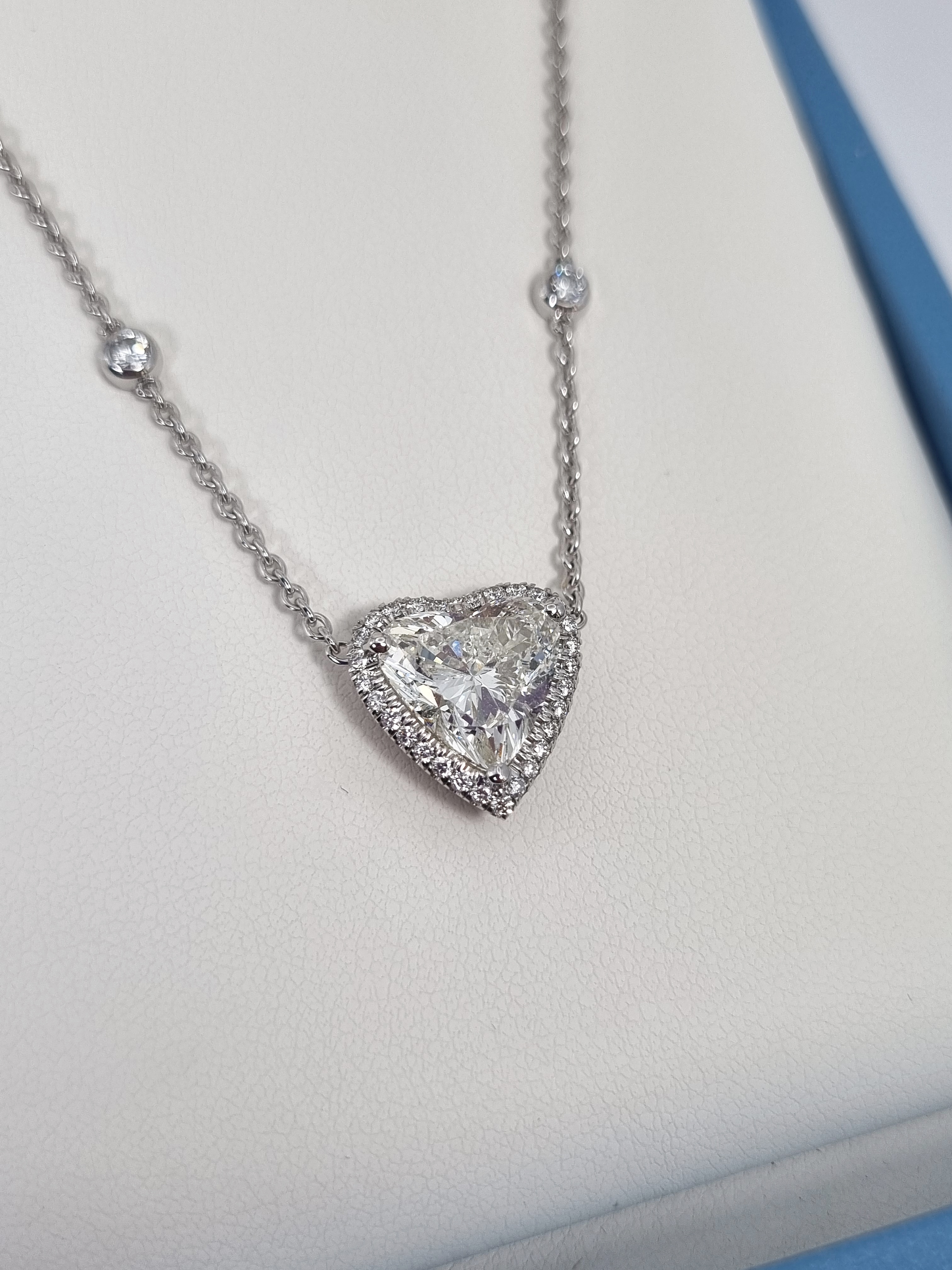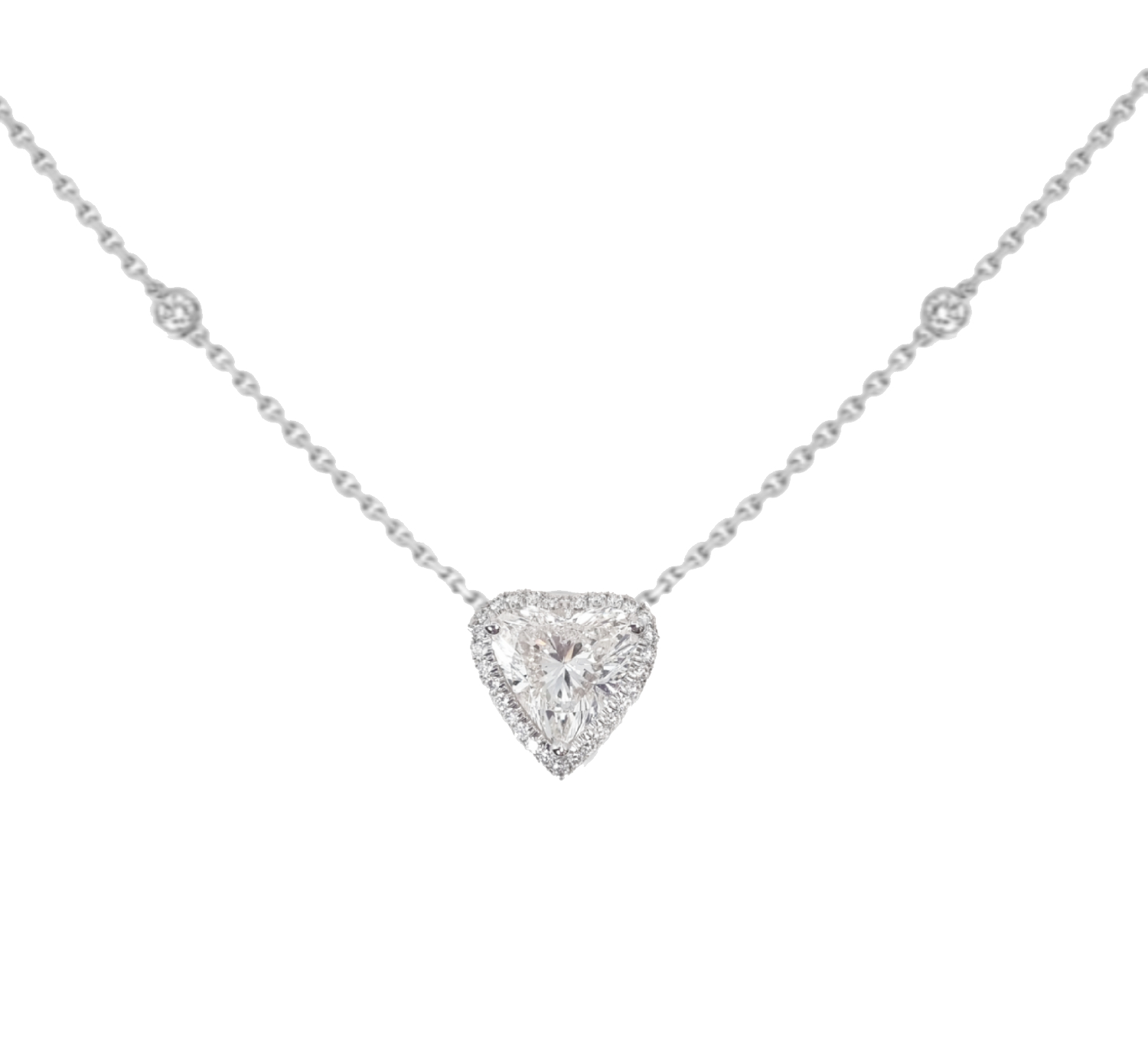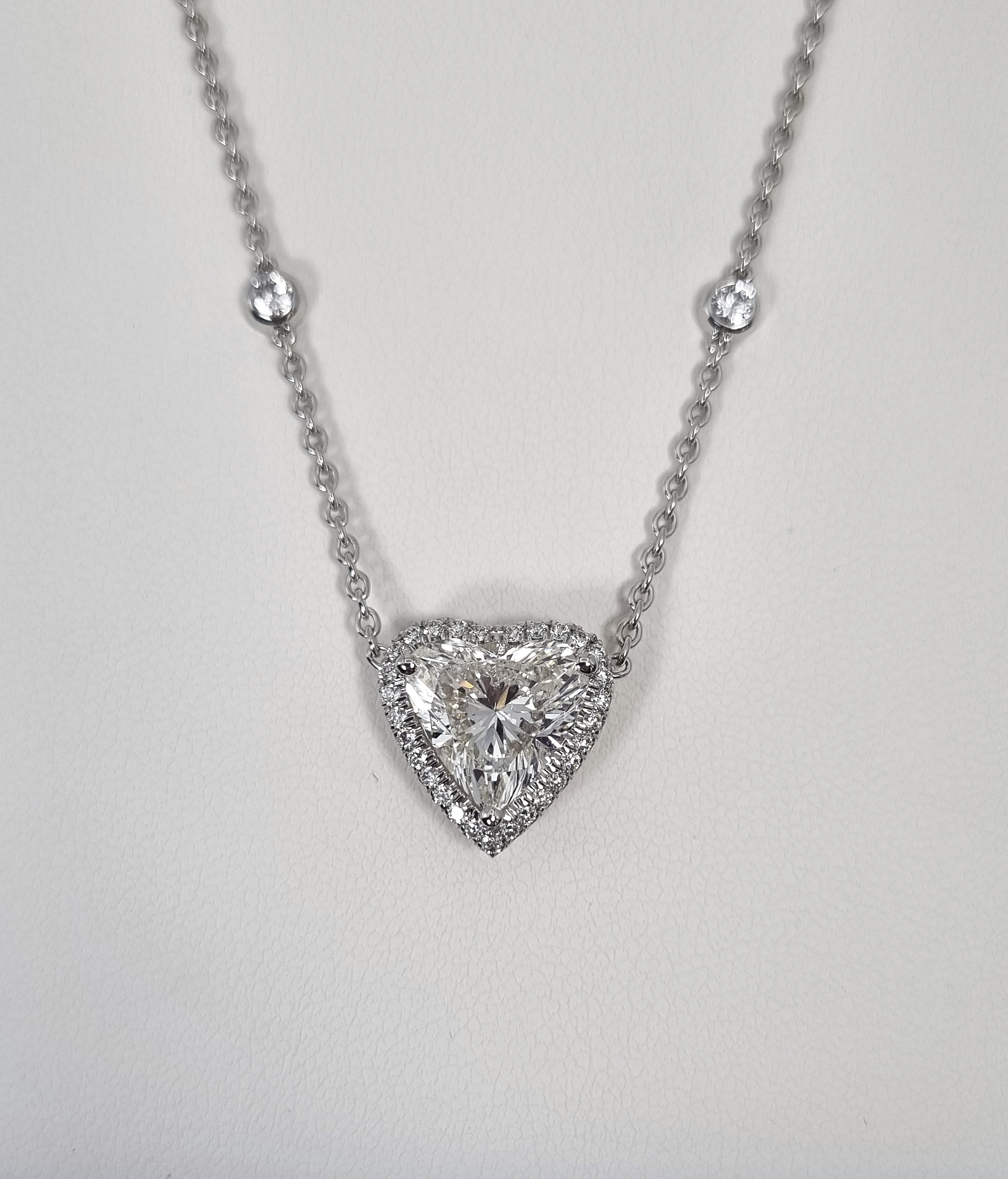 Центральным элементом колье является уникальный бриллиант "Heart" весом 3,19 ct. с сертификатом от авторитетного института GIA. Этот камень поражает своей чистотой и блеском, благодаря которому колье будет сиять на вашей шее, привлекая к себе внимание и восхищение окружающих.