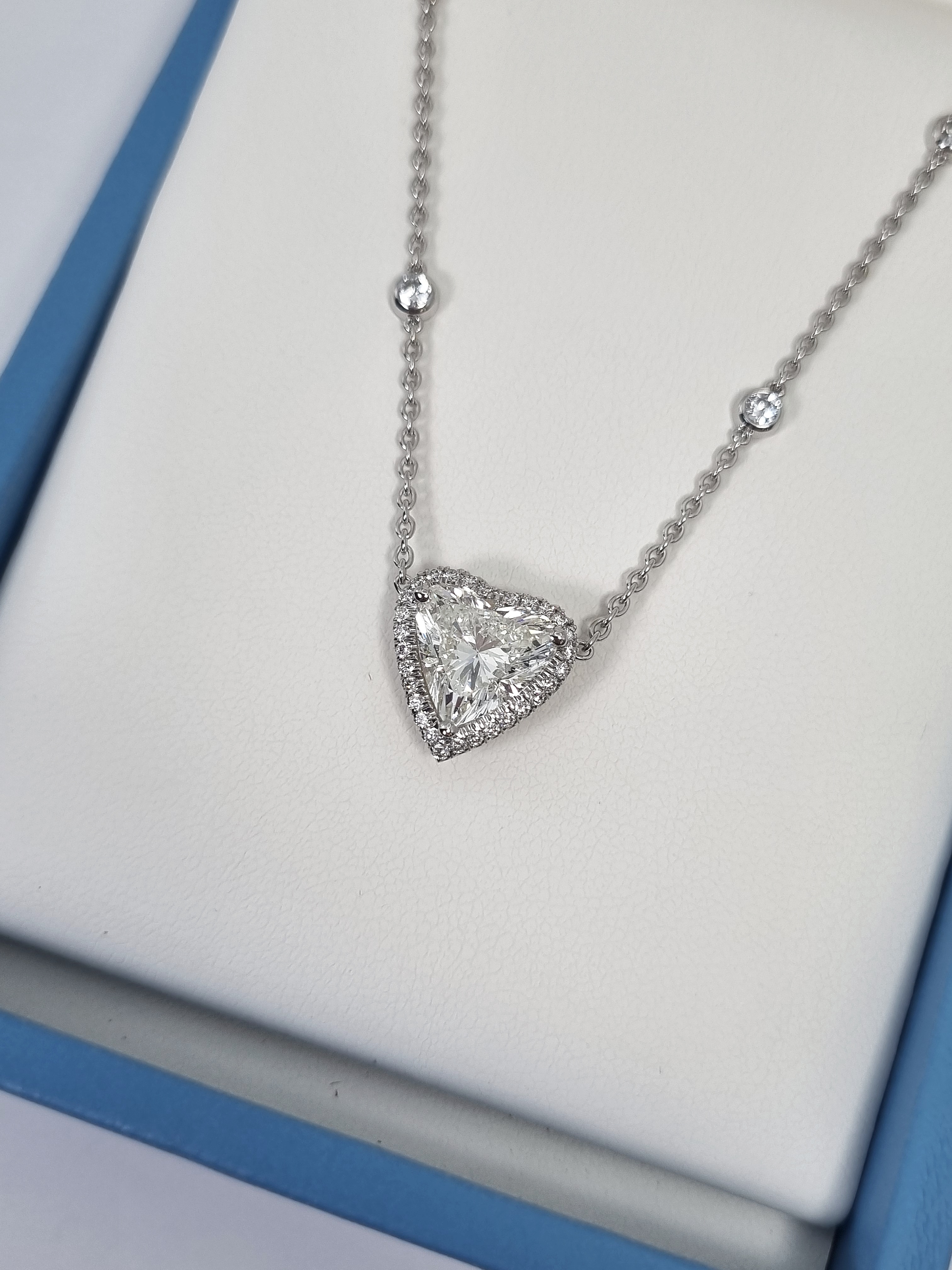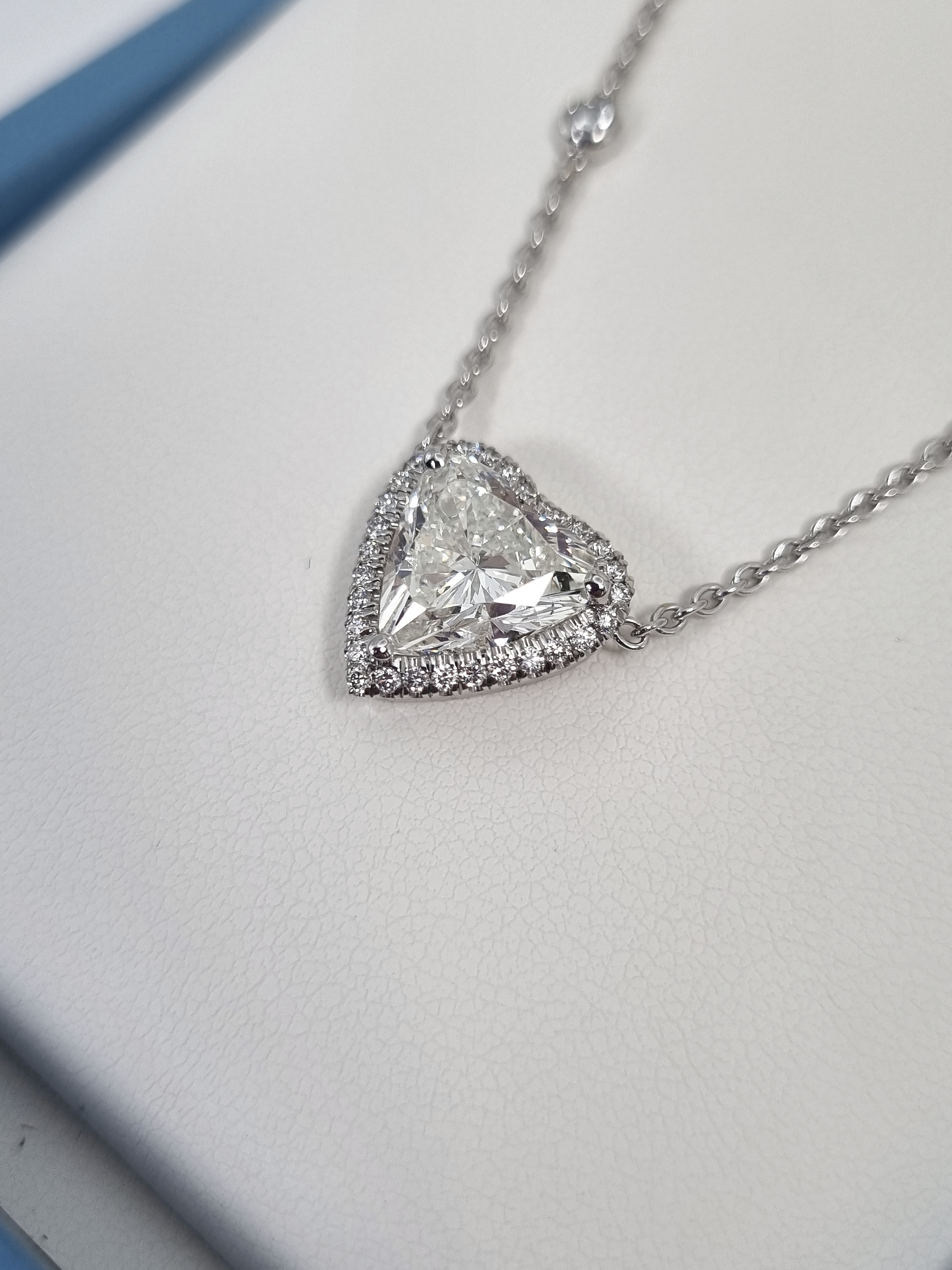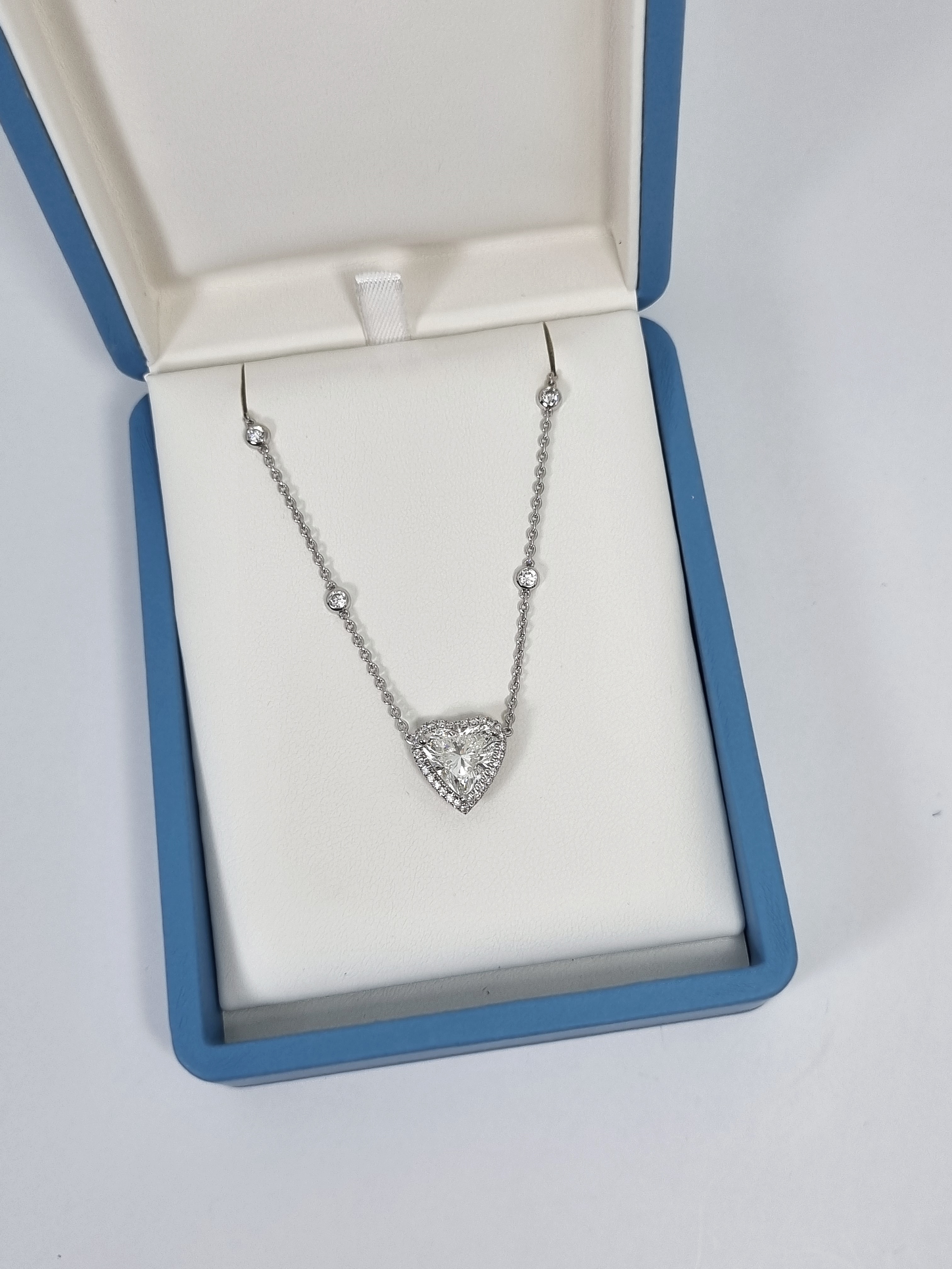 Центральным элементом колье является уникальный бриллиант "Heart" весом 3,19 ct. с сертификатом от авторитетного института GIA. Этот камень поражает своей чистотой и блеском, благодаря которому колье будет сиять на вашей шее, привлекая к себе внимание и восхищение окружающих.