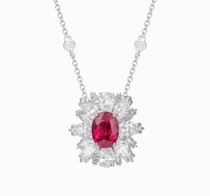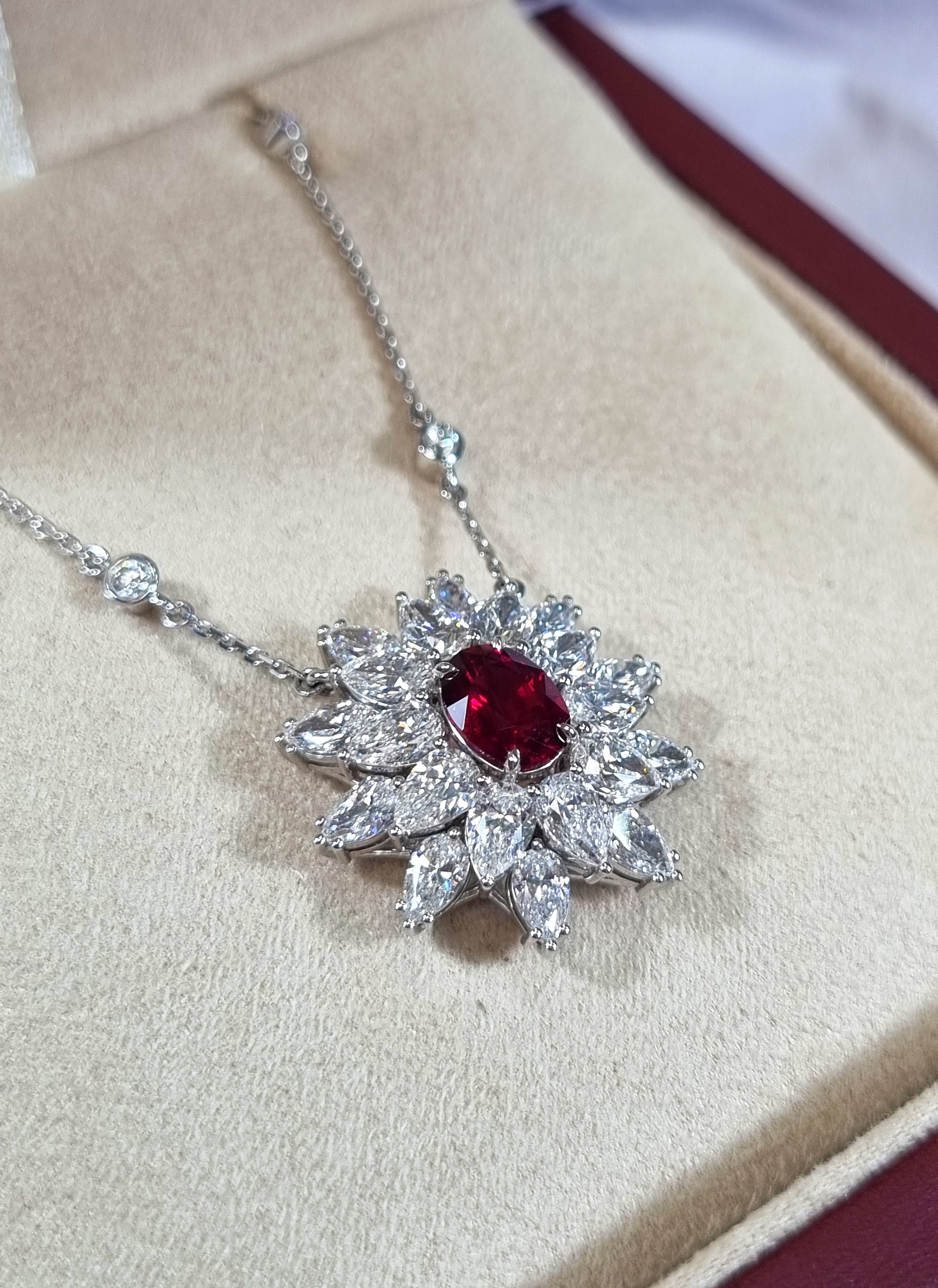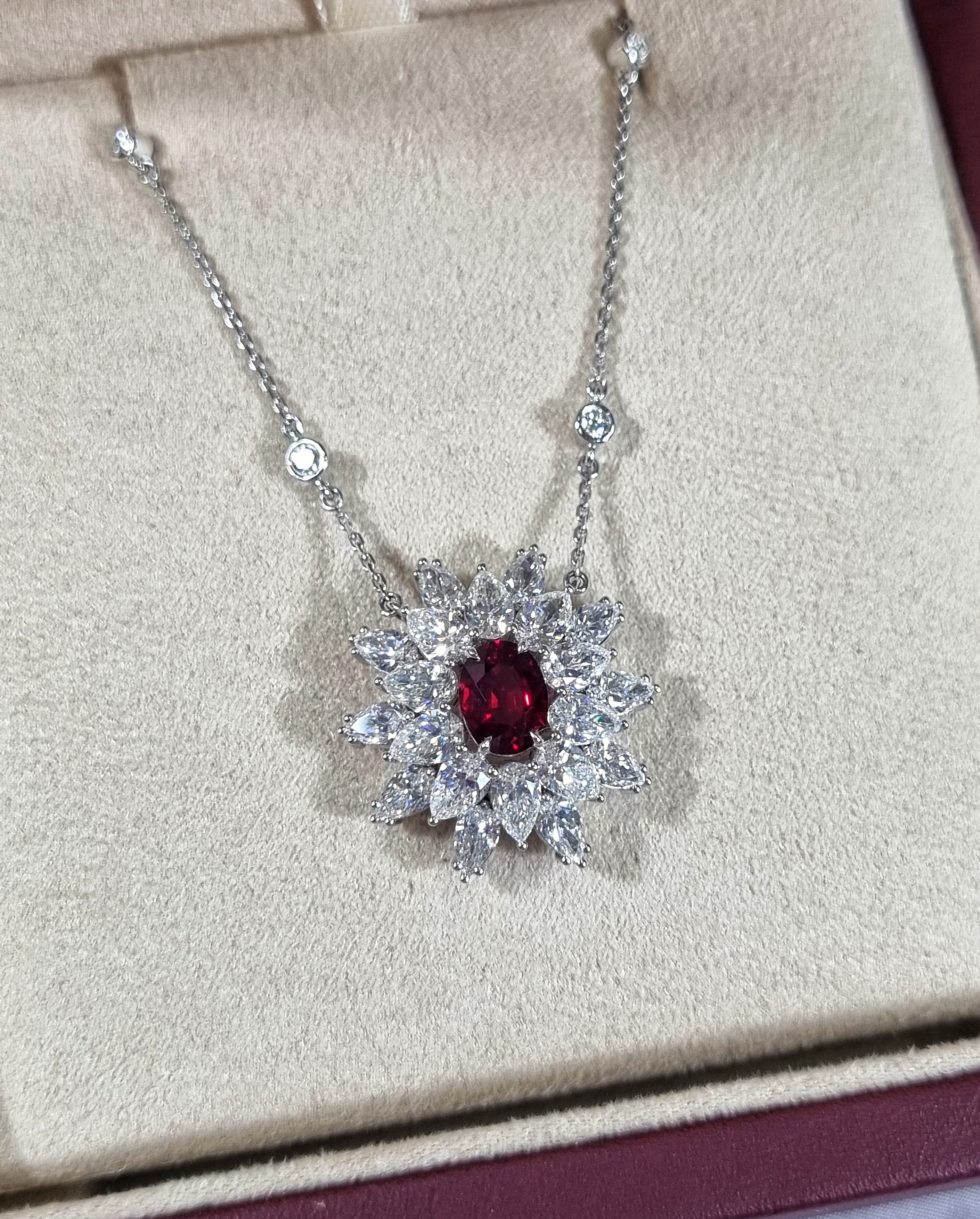Это колье - не просто украшение, а настоящее произведение искусства, созданное из белого золота 585 пробы. Длина цепочки составляет 42 см, что делает его идеальным выбором для любого случая. Но главное украшение этого колье - это вставка из рубина весом 1,52 карата, имеющего глубокий красный цвет, и 24 бриллианта общей массой 4,29 карата, которые добавляют ему особую изысканность и блеск.