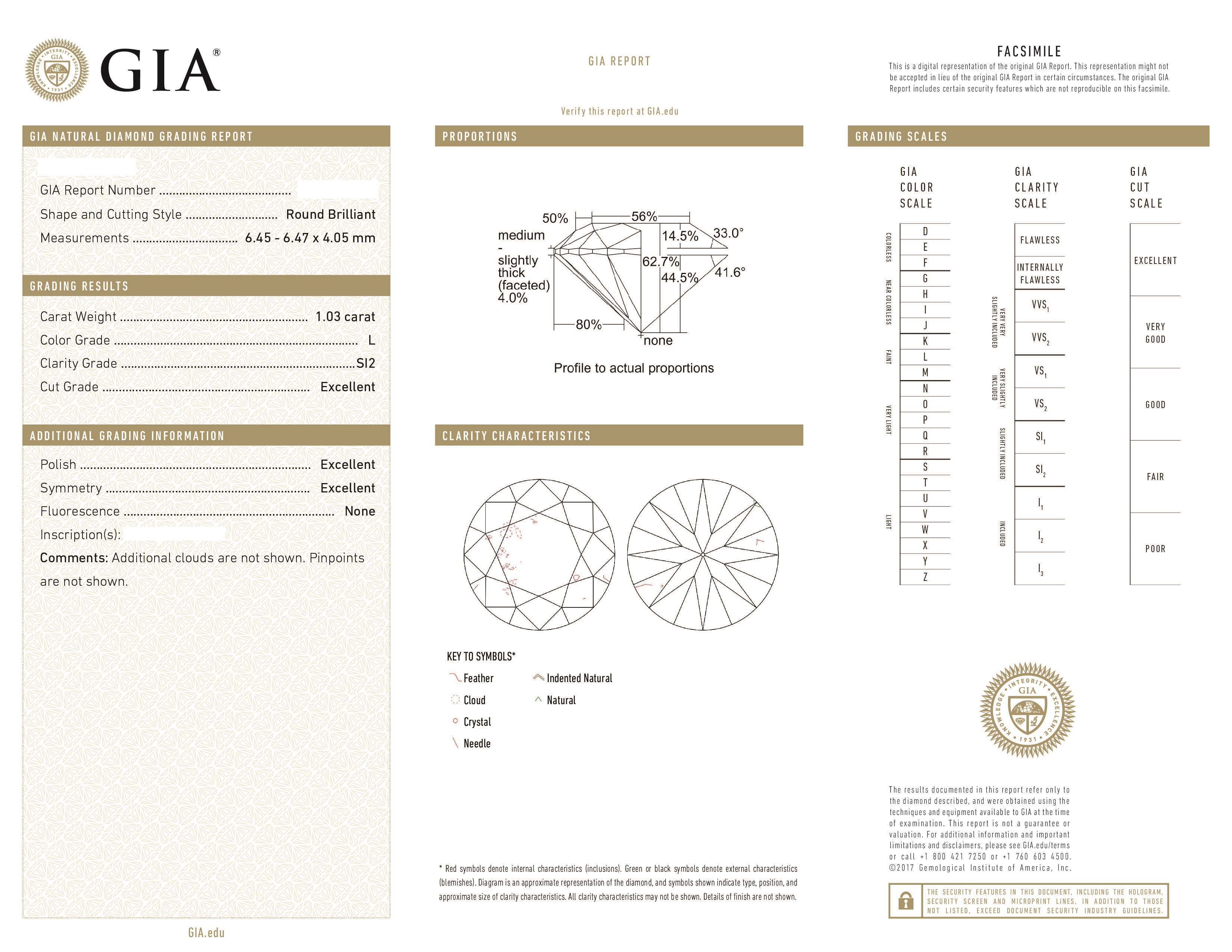 GIA Кольцо 1,03 Ct. L/si2 (3 Excellent) "round Diamond"
