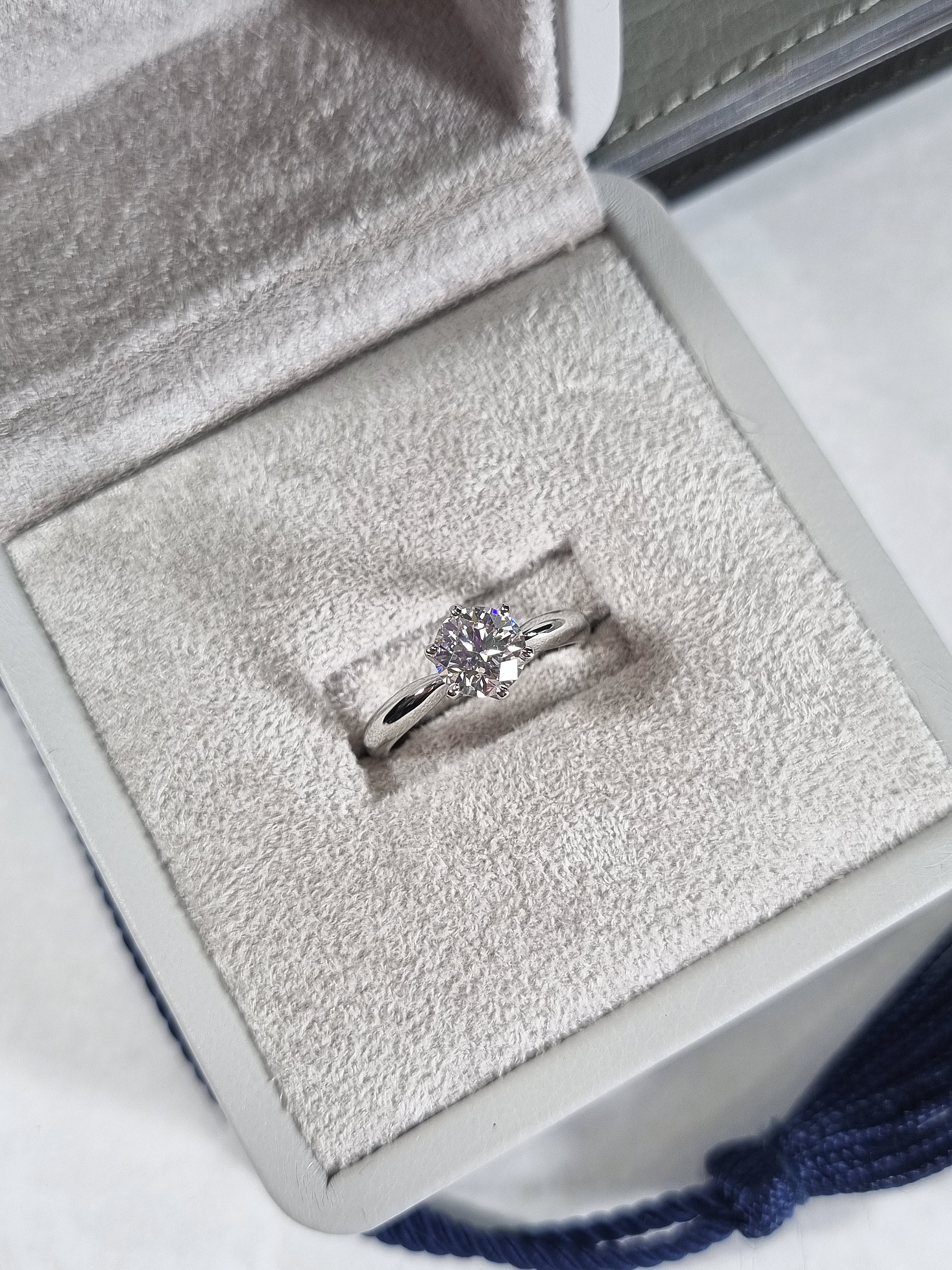 Кольцо изготовлено из платины 950°, что обеспечивает его долговечность и устойчивость к коррозии. В центре изделия находится бриллиант весом 1,05 карата, имеющий характеристики E/VVS2, что делает его одним из самых ценных и редких камней в мире. Бриллиант обладает непревзойденным блеском и игрой света, что делает его настоящим украшением для любого случая.