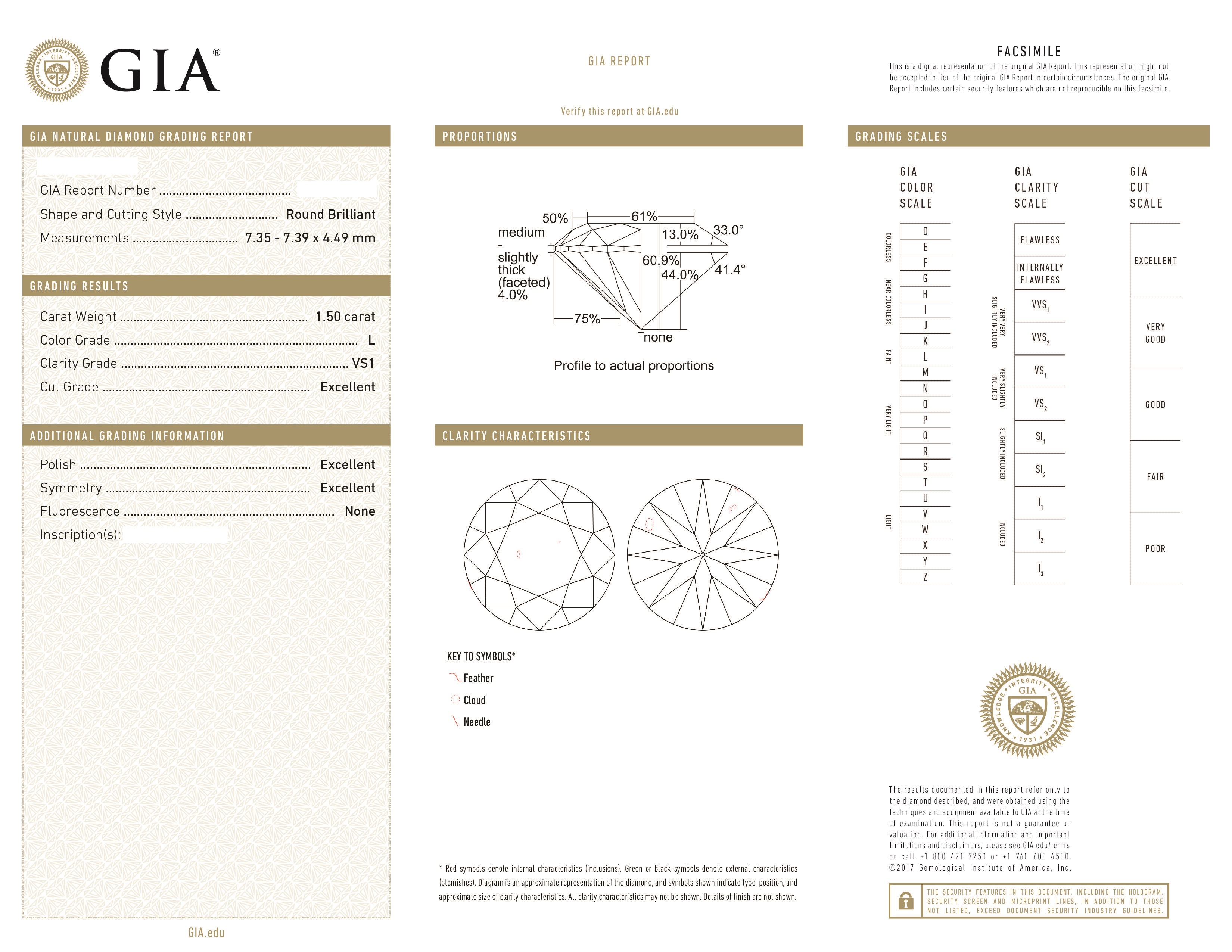 GIA Кольцо 1,50 Ct. L/vs1 (3 Excellent) Round Diamond