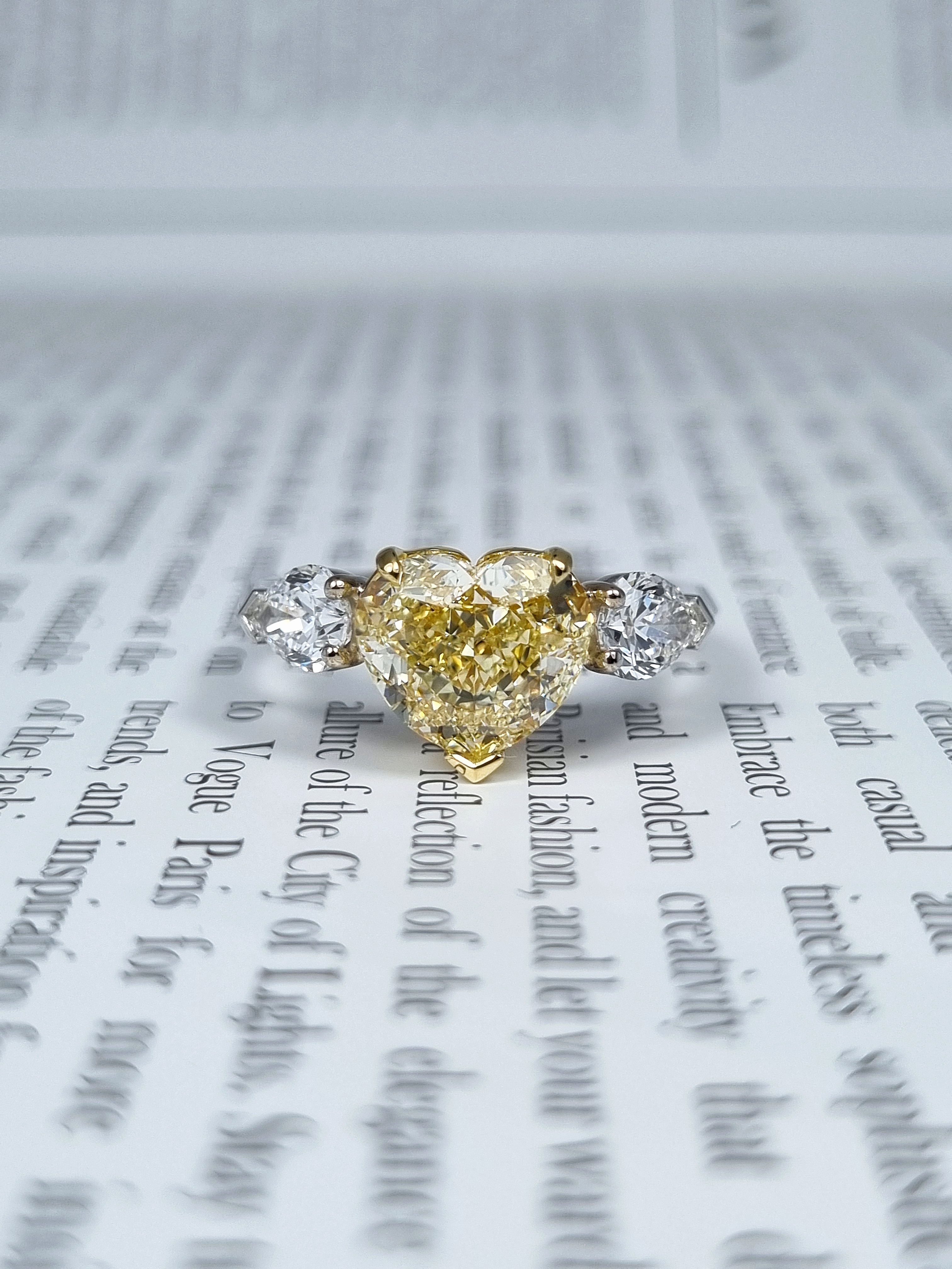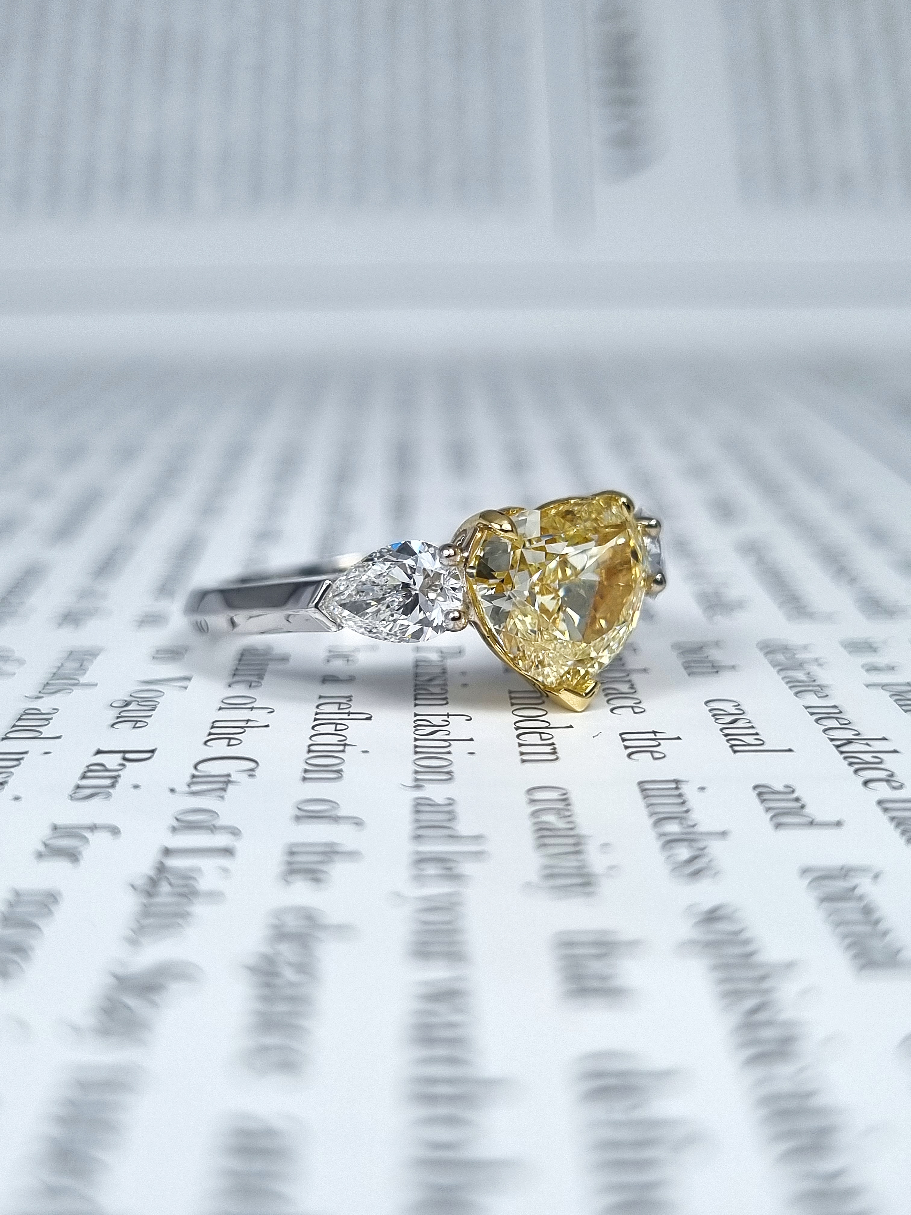 Вставка Центральный бриллиант 3,06 сt. Fancy Light Yellow/VS1; 2 боковых бриллианта общей массой 0,82 ct. E/VVS2