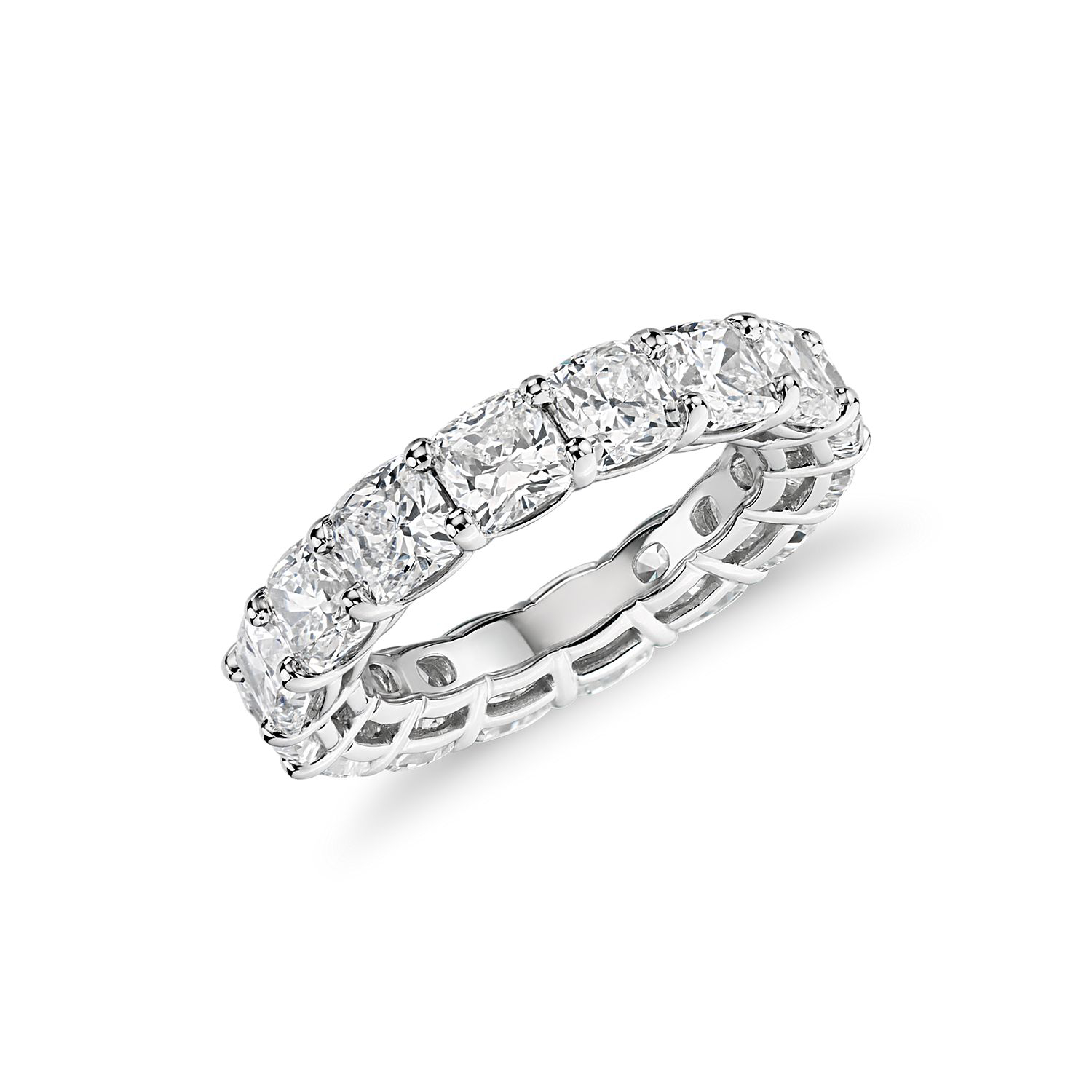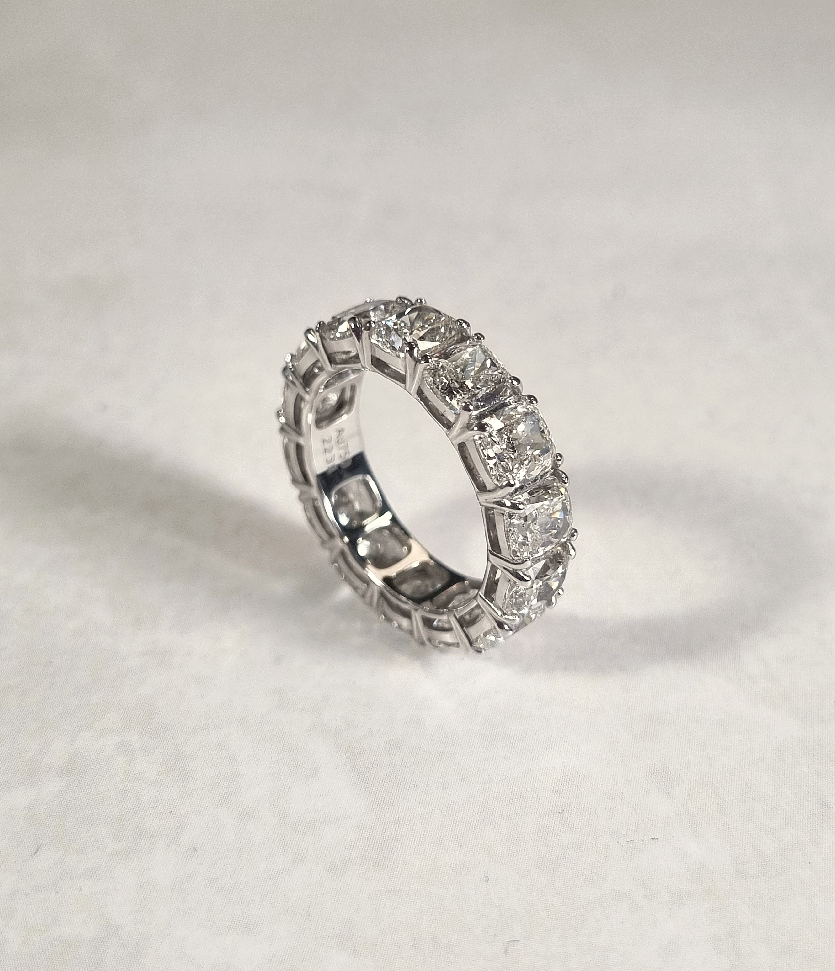 Кольцо изготовлено из высококачественного белого золота 750°, что обеспечивает ему долговечность и изящество. Особое внимание привлекает вставка из 14 бриллиантов огранки кушон, каждый из которых имеет массу 0,7 ct. и обладает сертификатом GIA, подтверждающим их подлинность и качество. Общая масса бриллиантов составляет 9,8 ct., что делает это кольцо поистине уникальным и ценным приобретением.