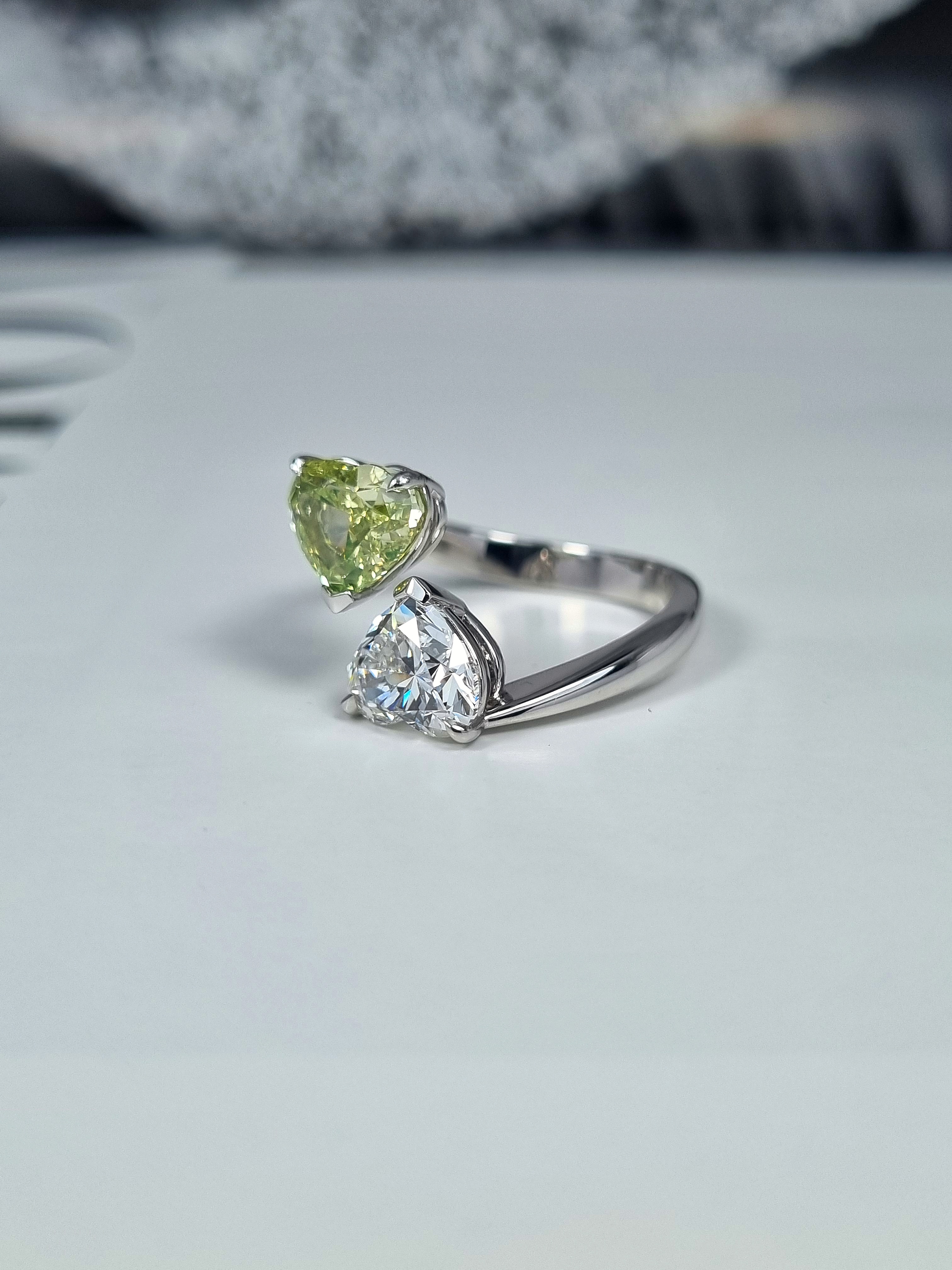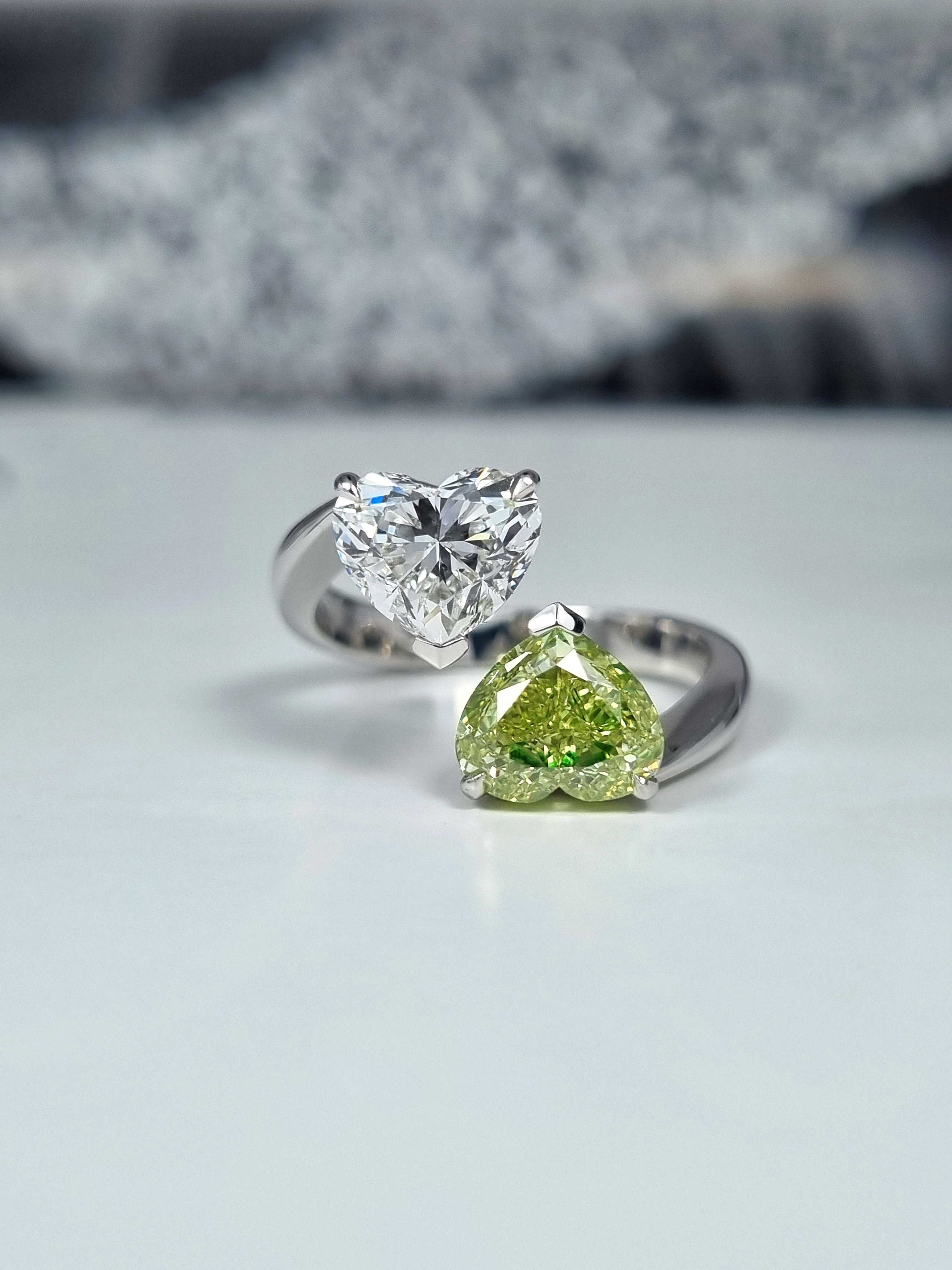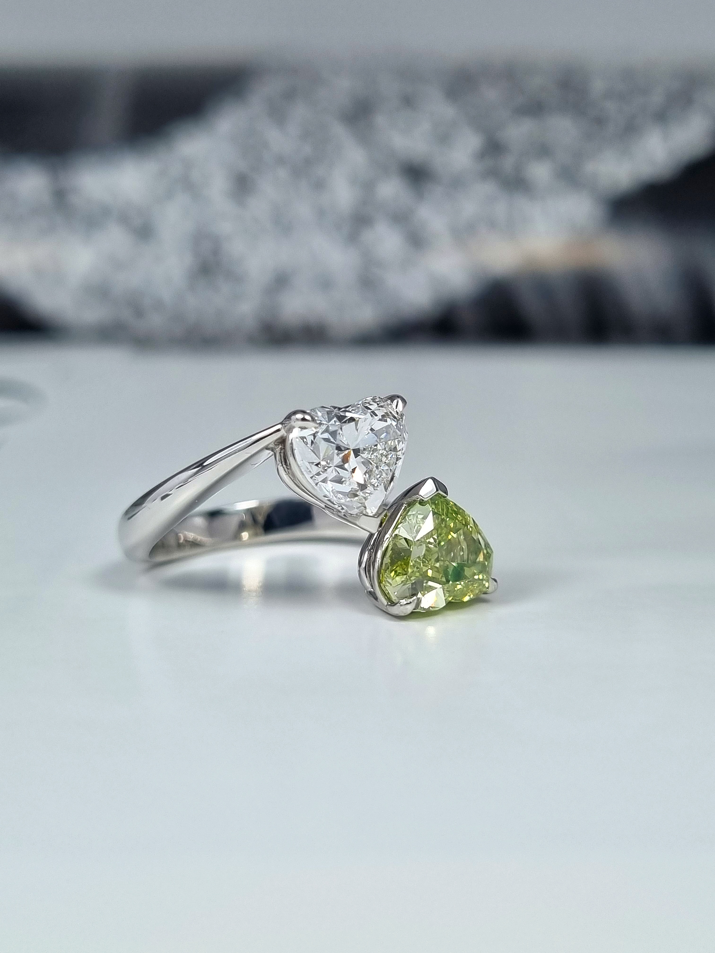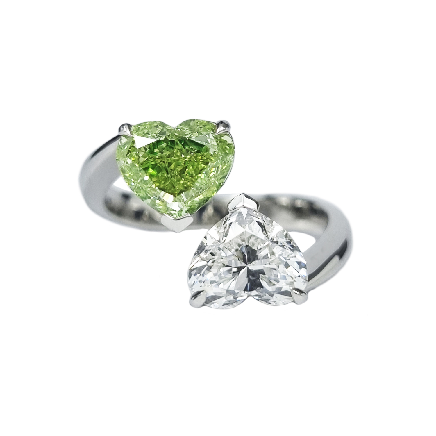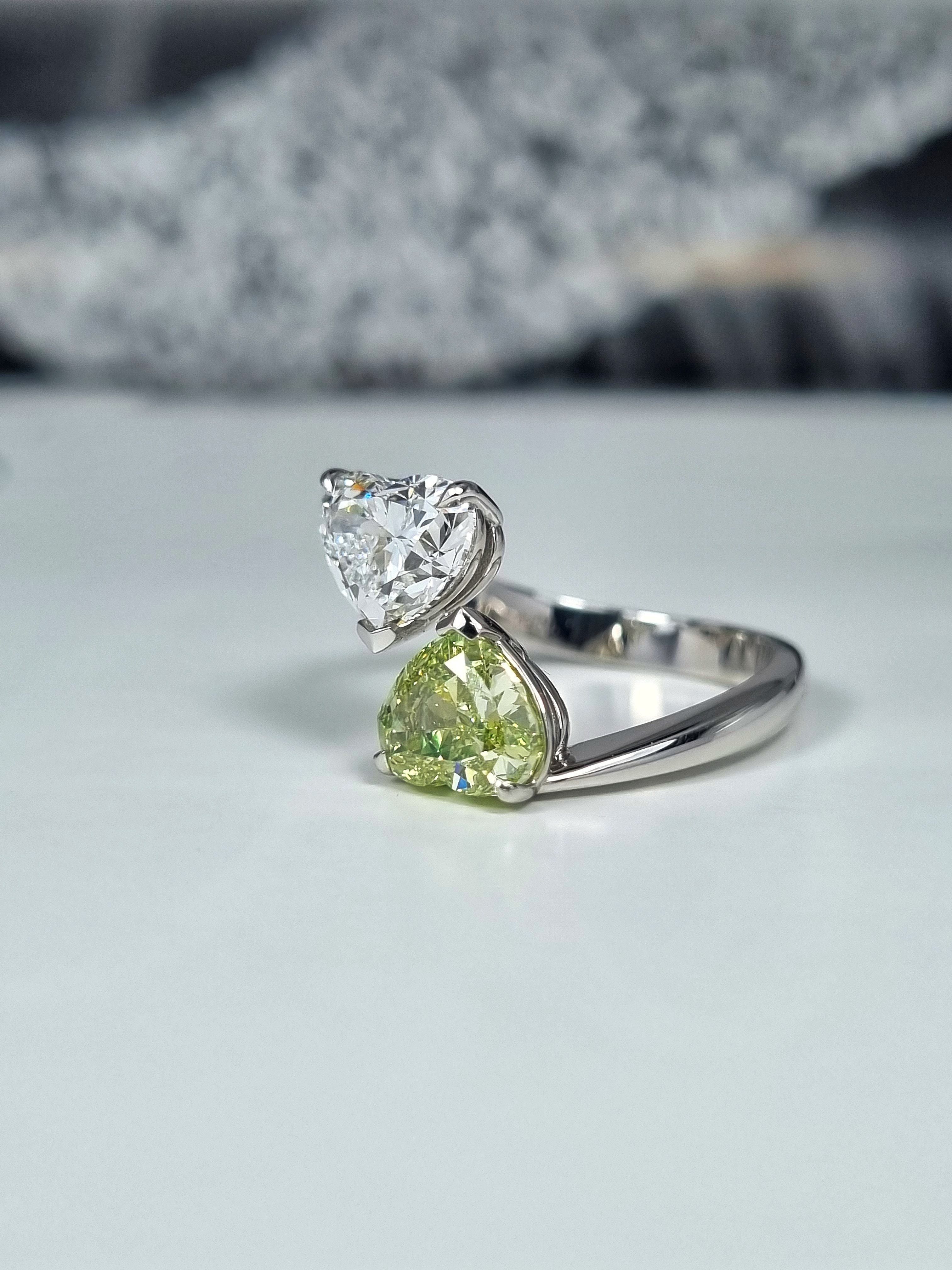 Вставка 1 бриллиант 1,52 ct. "Heart" F/VVS2; 1 бриллиант 1,51 ct. "Heart" Fancy Brownish Greenish Yellow/VS1
