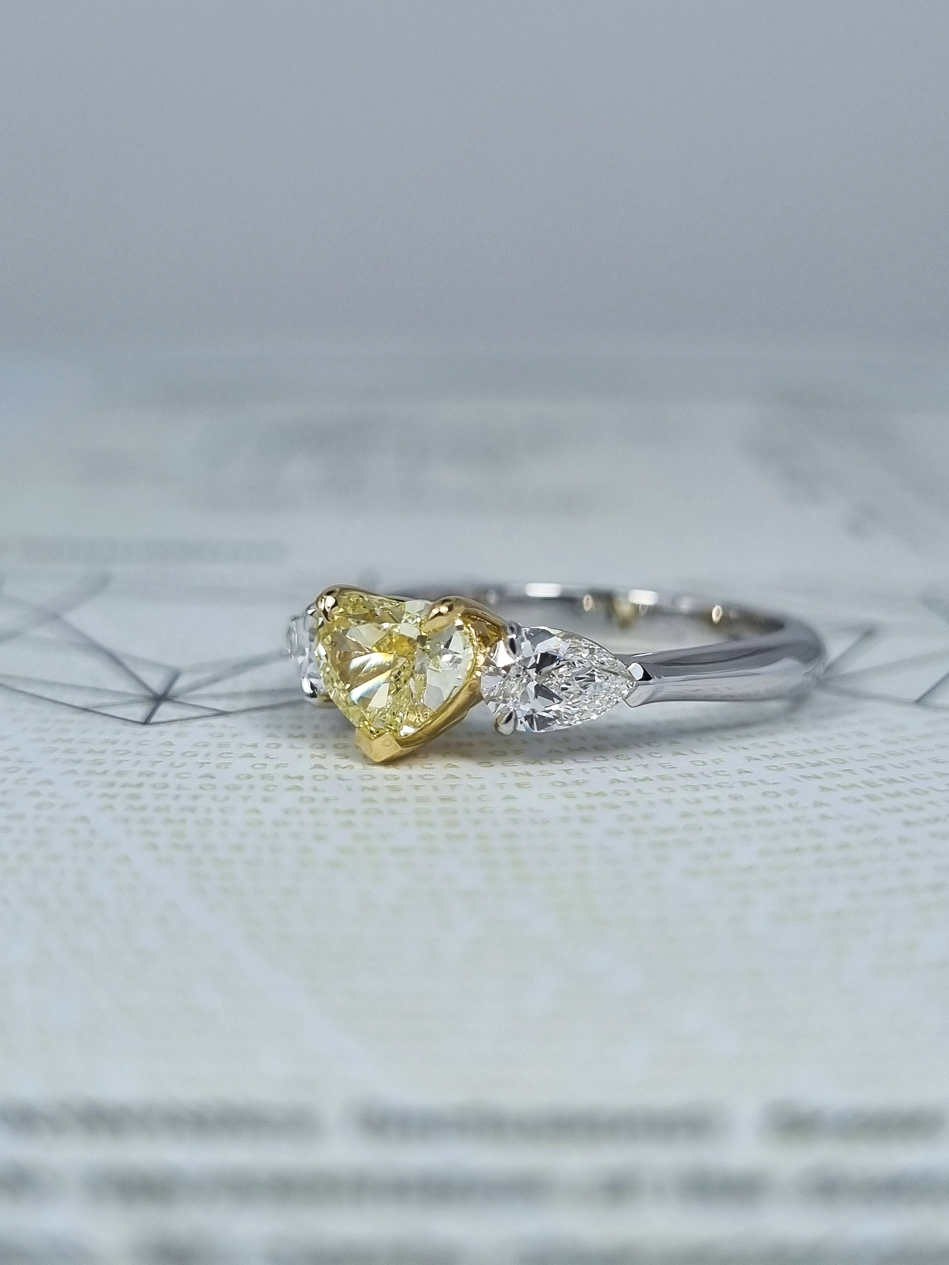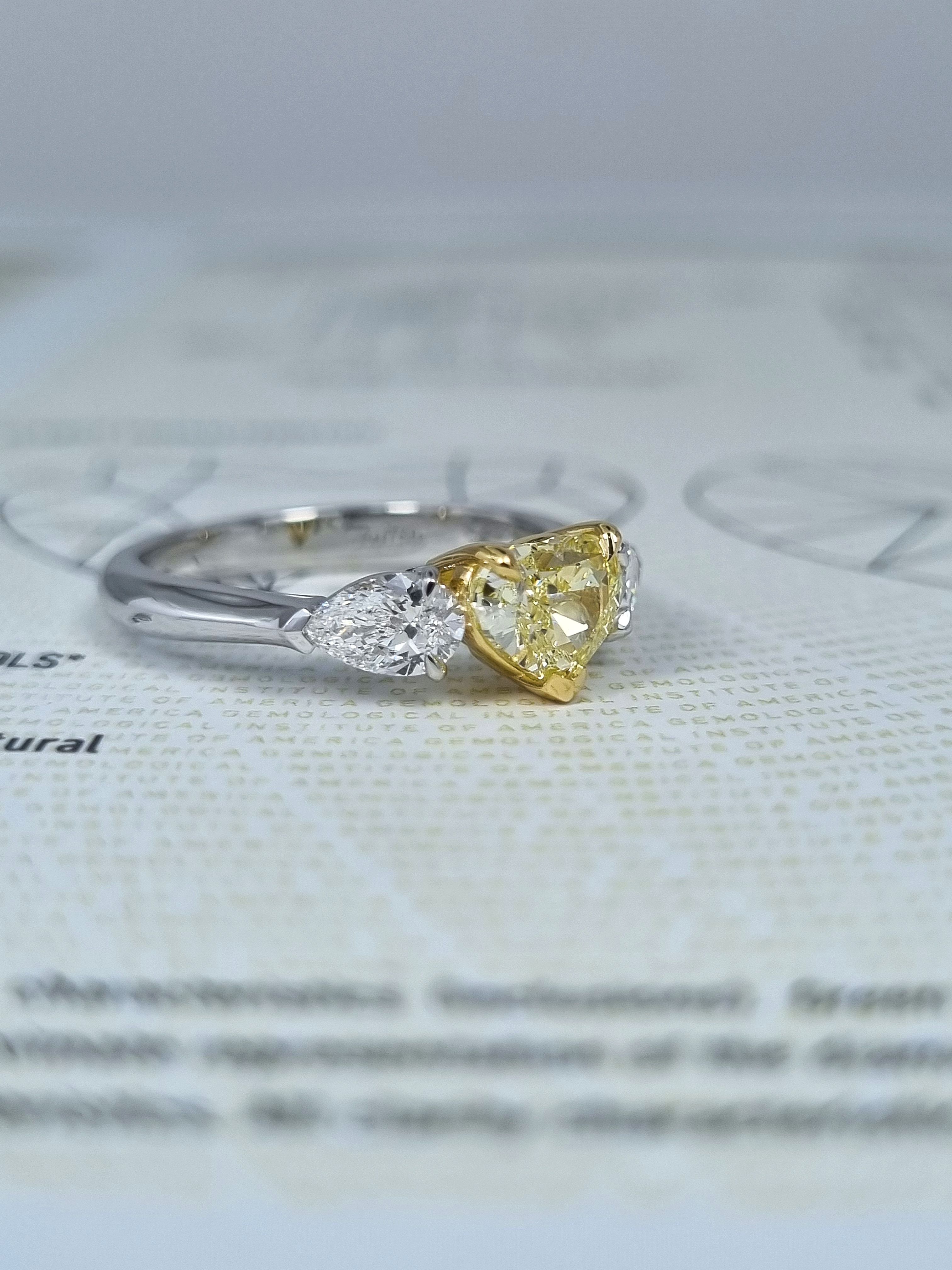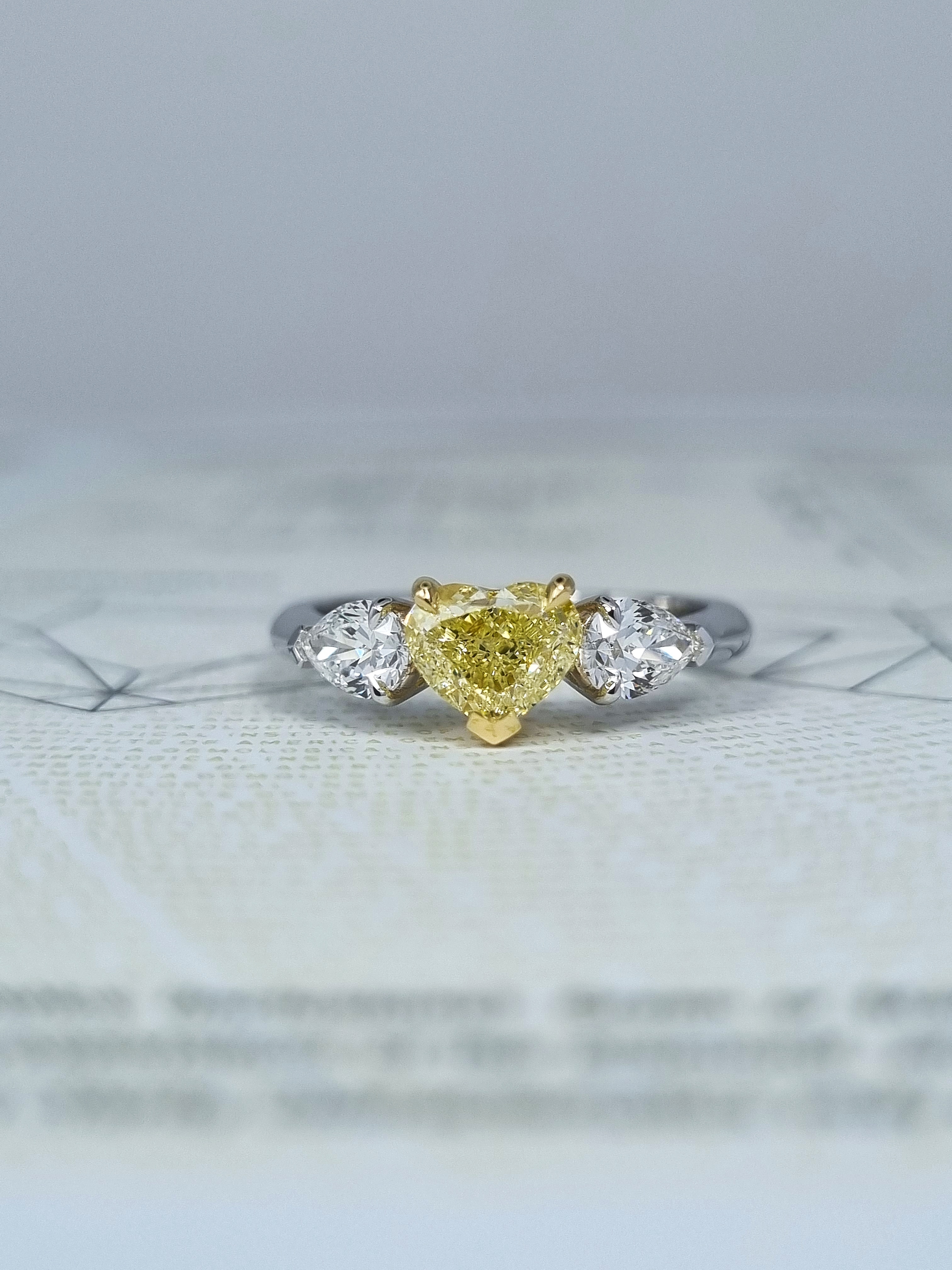 Вставка Центральный бриллиант 1,02 ct., "Heart" Fancy Yellow/VS1; 2 бриллианта огранки "Груша", общей массой 0,63 ct. D/VS