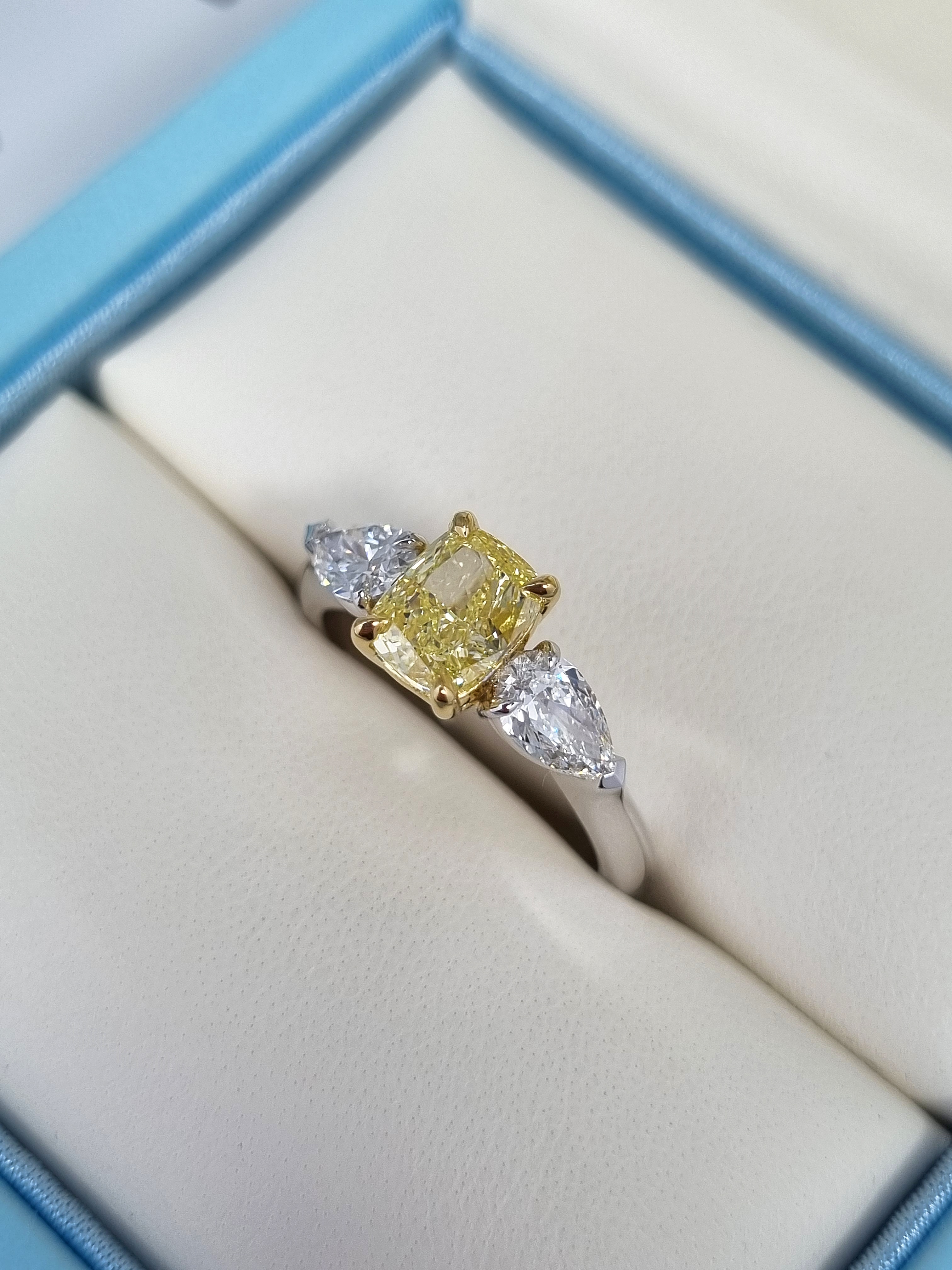 Вставка Центральный бриллиант 1,11 ct., Cushion, Fancy Yellow/ VVS2 (Lucky Number); 2 боковых бриллианта общей массой 0,63 ct. D/VS