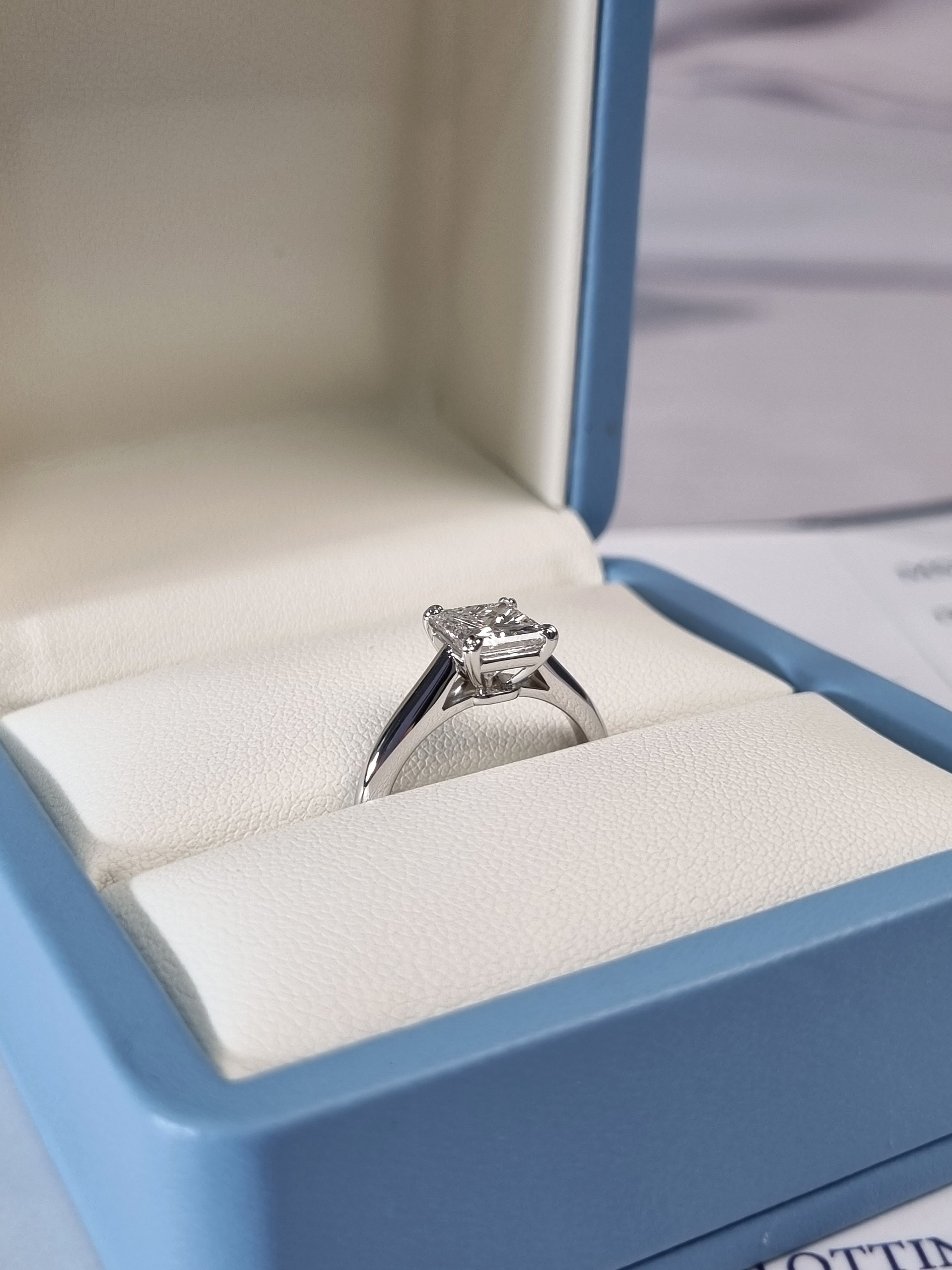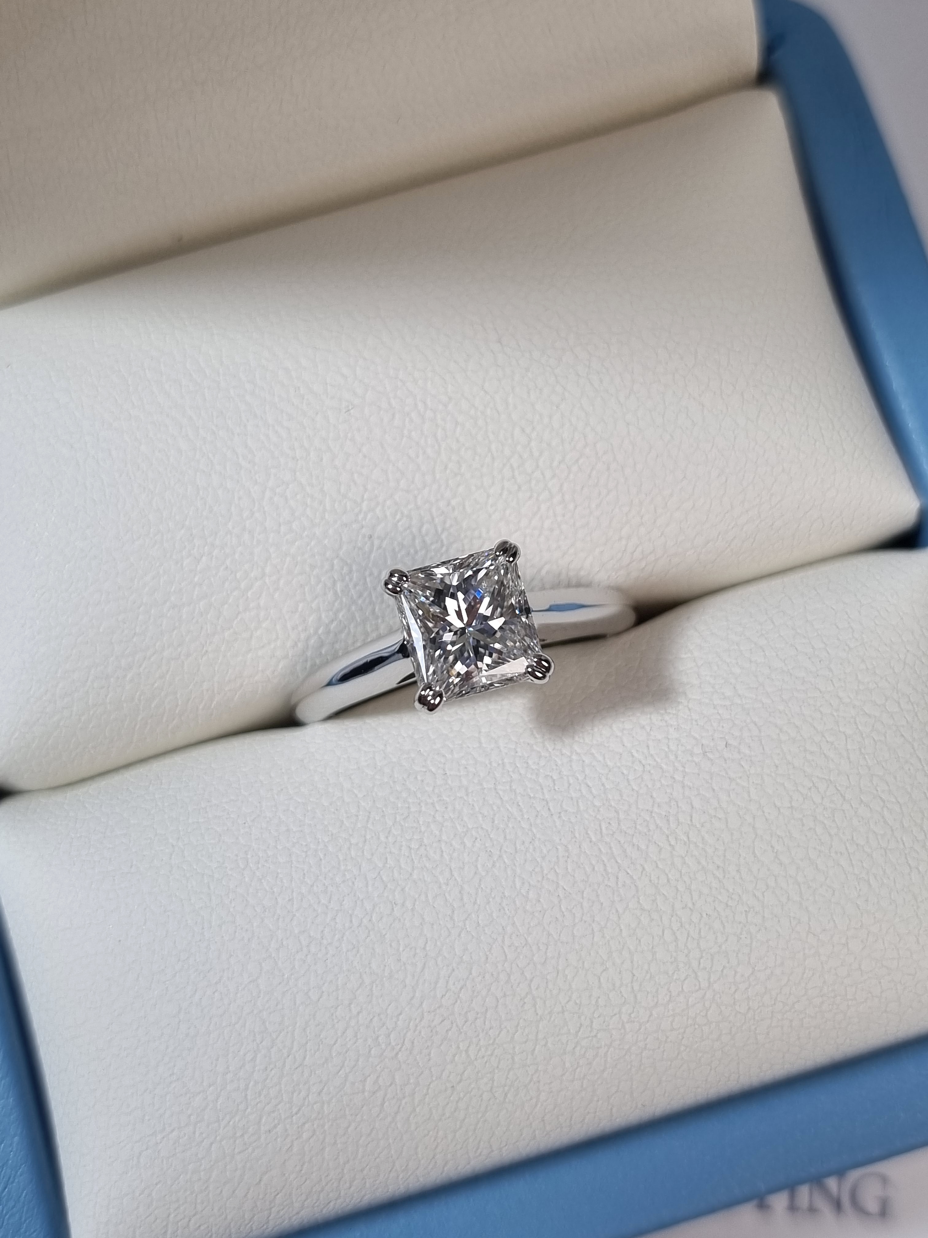 Кольцо выполнено из высококачественного белого золота 750°, что обеспечивает ему долговечность и изящество. В центре изделия находится бриллиант "Princess" D/VS2, который благодаря своему уникальному срезу и непревзойденной прозрачности, будет сиять на вашей руке, привлекая к себе внимание и восхищение окружающих.