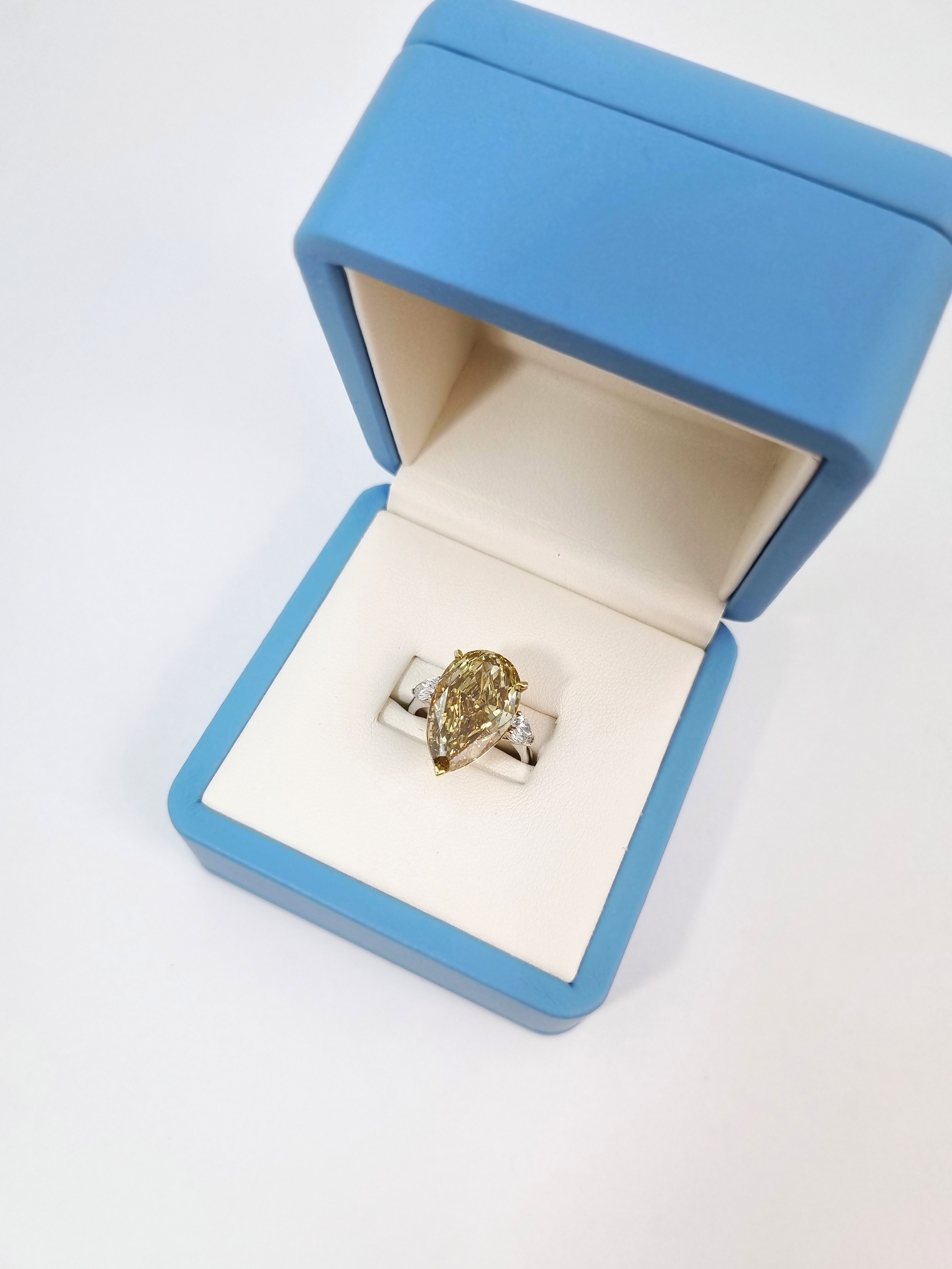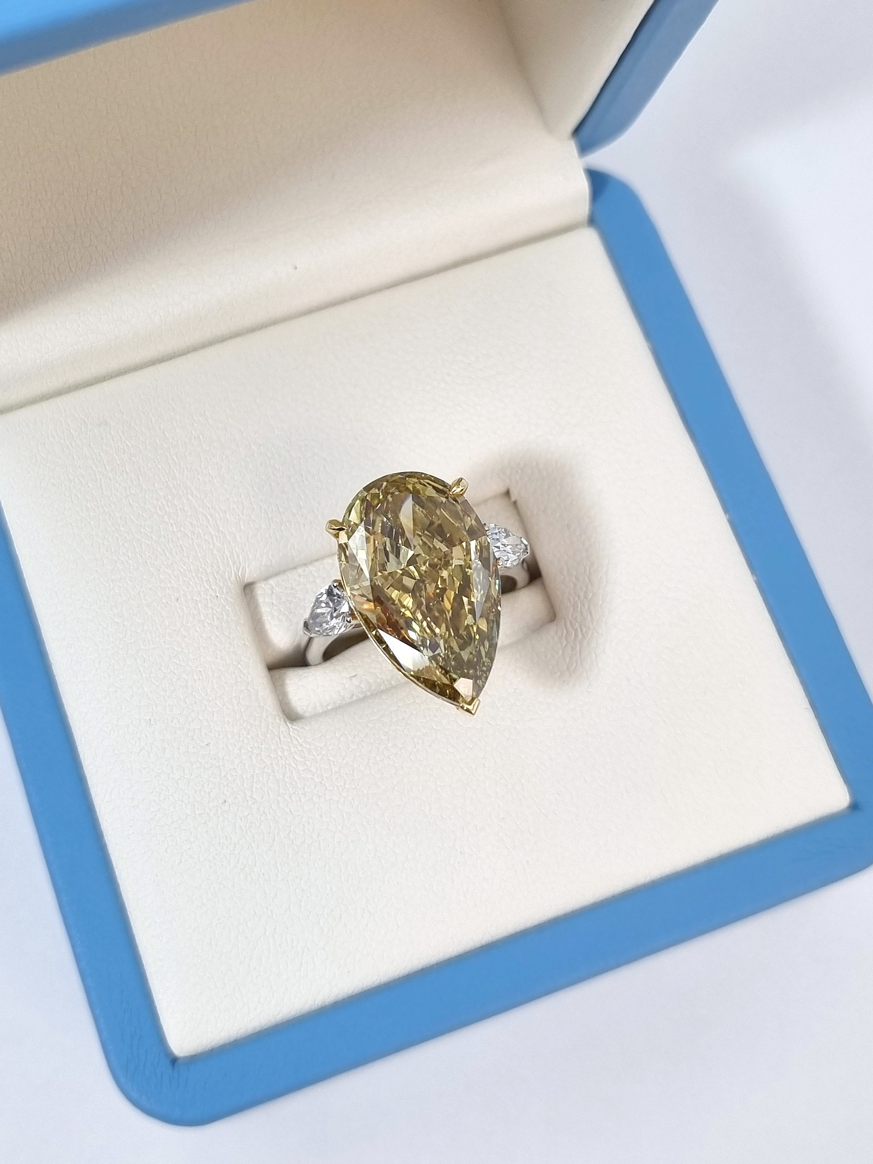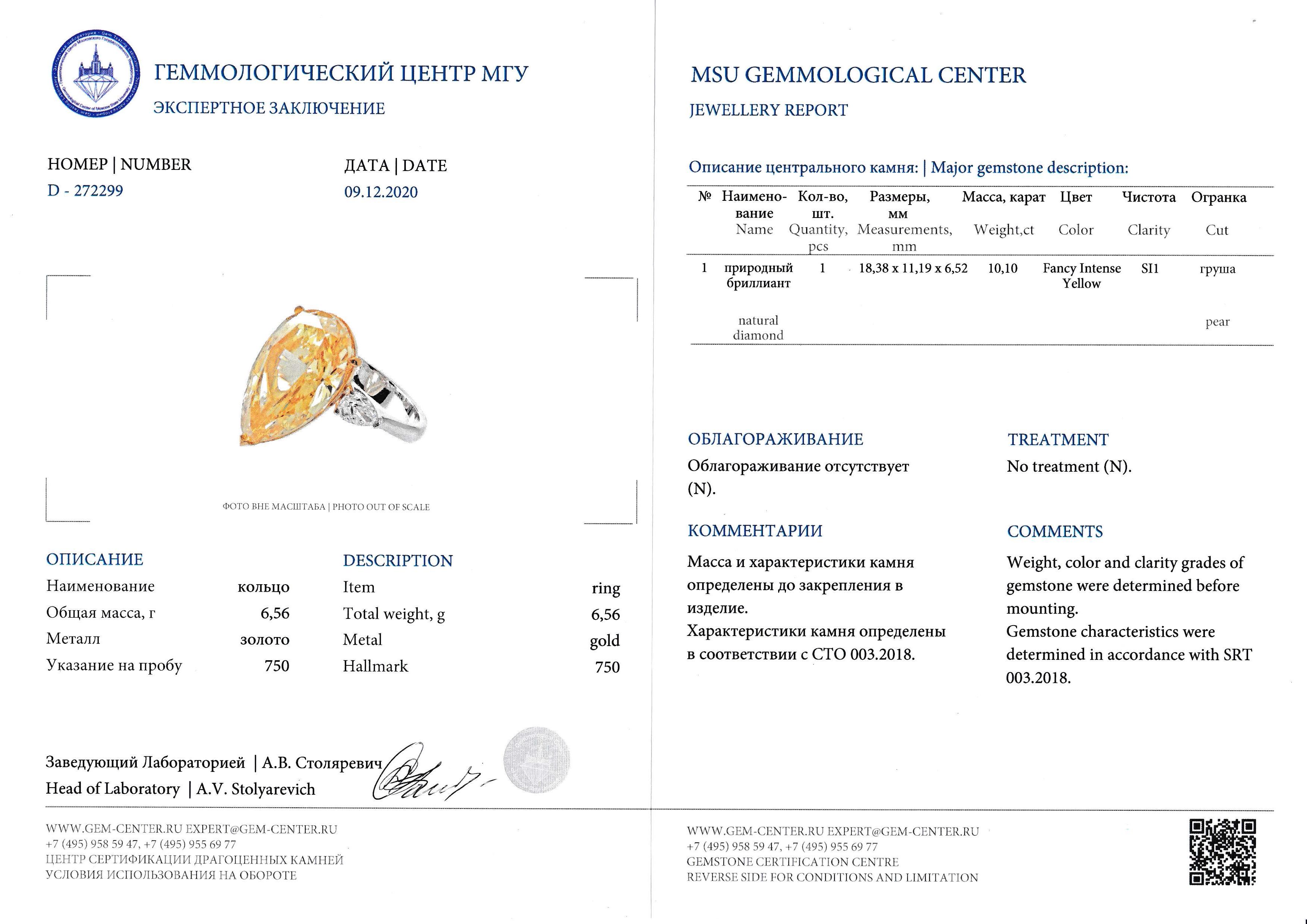 Центральный бриллиант "Pear" с весом 10,10 ct, имеющий сертификат МГУ, является настоящим украшением этого кольца. Его форма, напоминающая грушу, добавляет изделию особую изящность и элегантность. Боковые бриллианты Fine White/VS, вставленные в белое золото 750°, создают эффектное сочетание, которое делает кольцо неповторимым.
