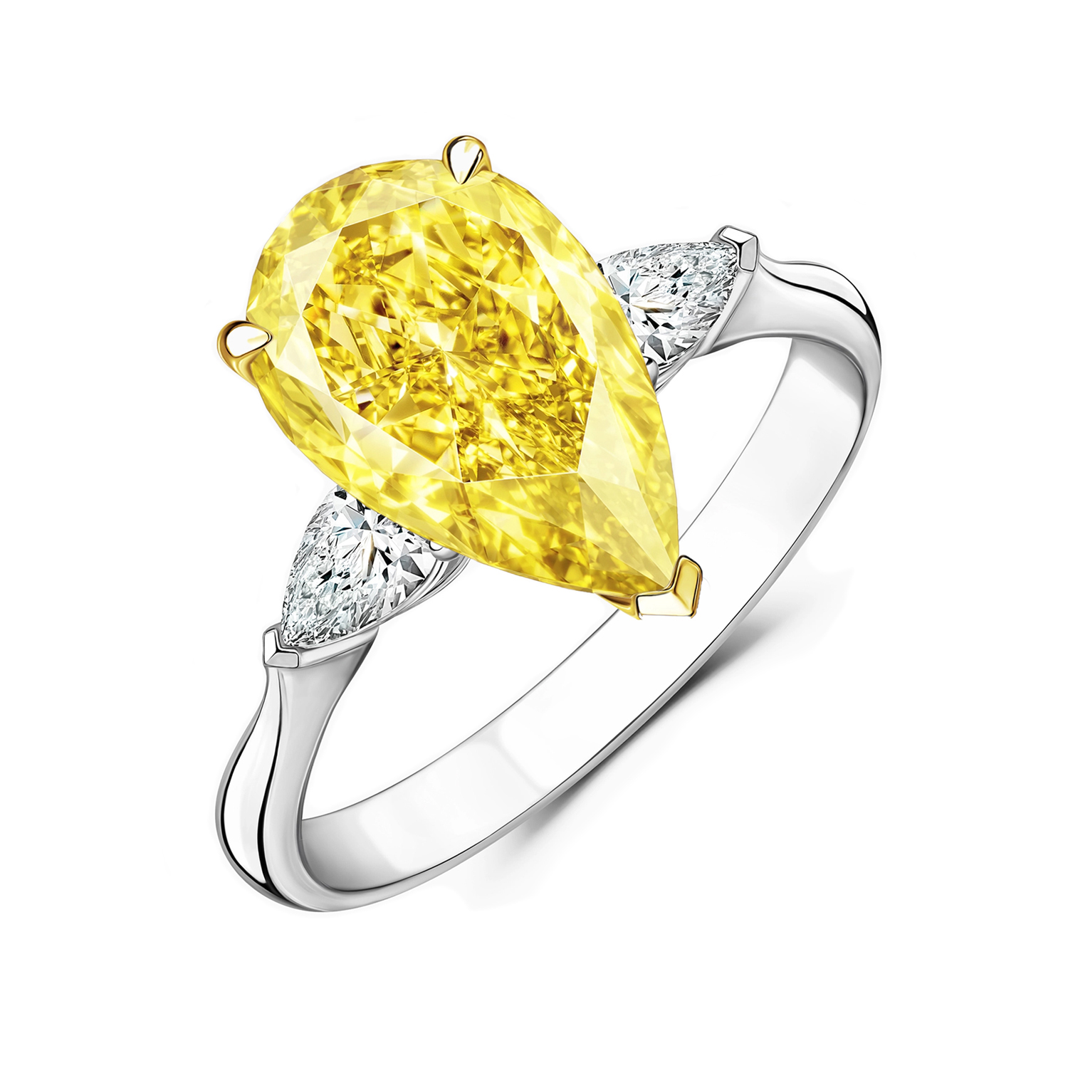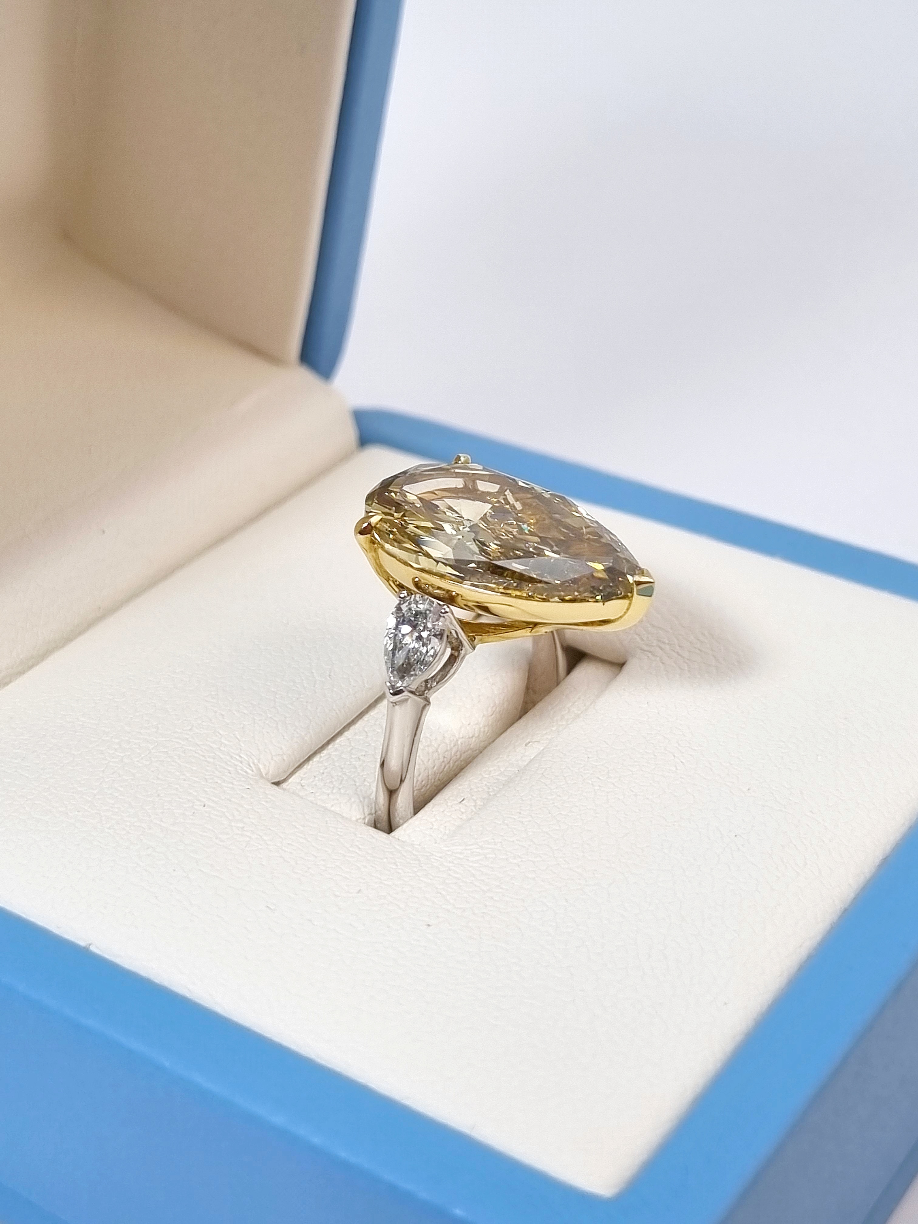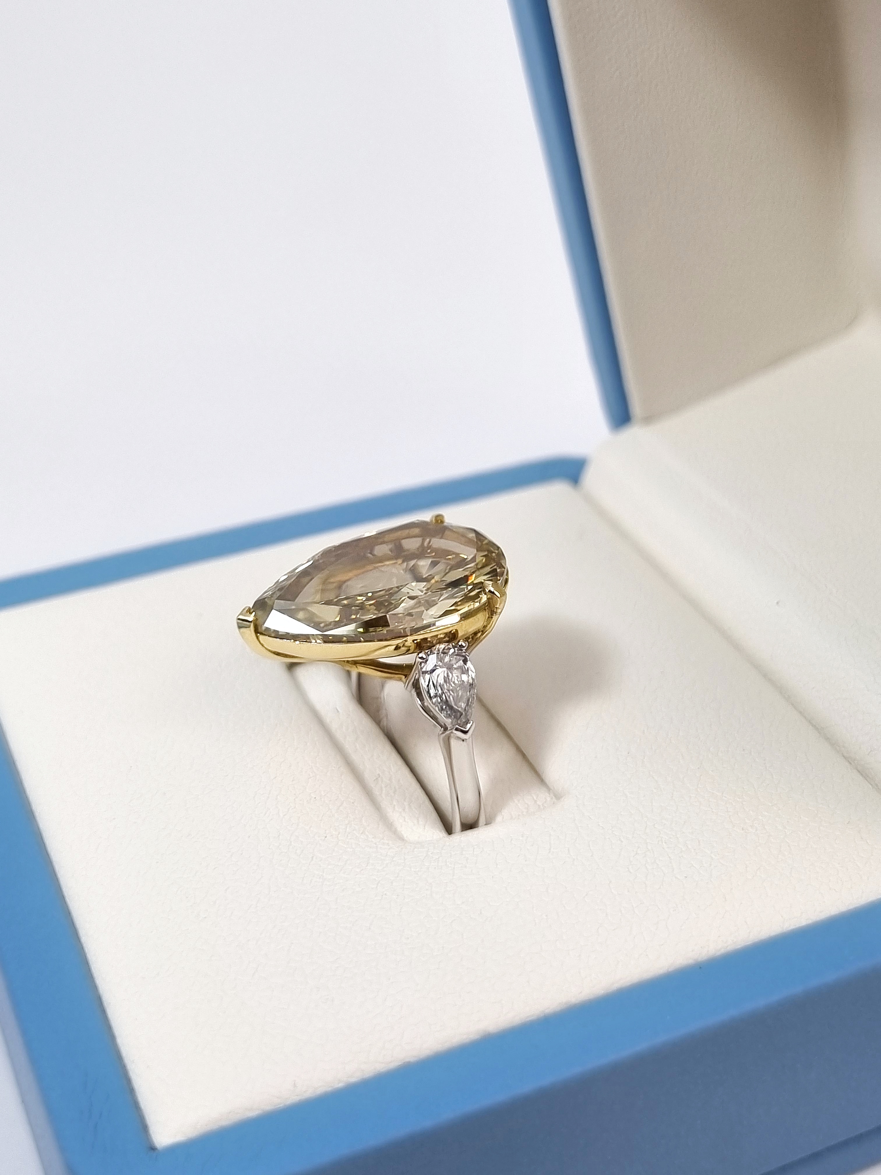 Центральный бриллиант "Pear" с весом 10,10 ct, имеющий сертификат МГУ, является настоящим украшением этого кольца. Его форма, напоминающая грушу, добавляет изделию особую изящность и элегантность. Боковые бриллианты Fine White/VS, вставленные в белое золото 750°, создают эффектное сочетание, которое делает кольцо неповторимым.