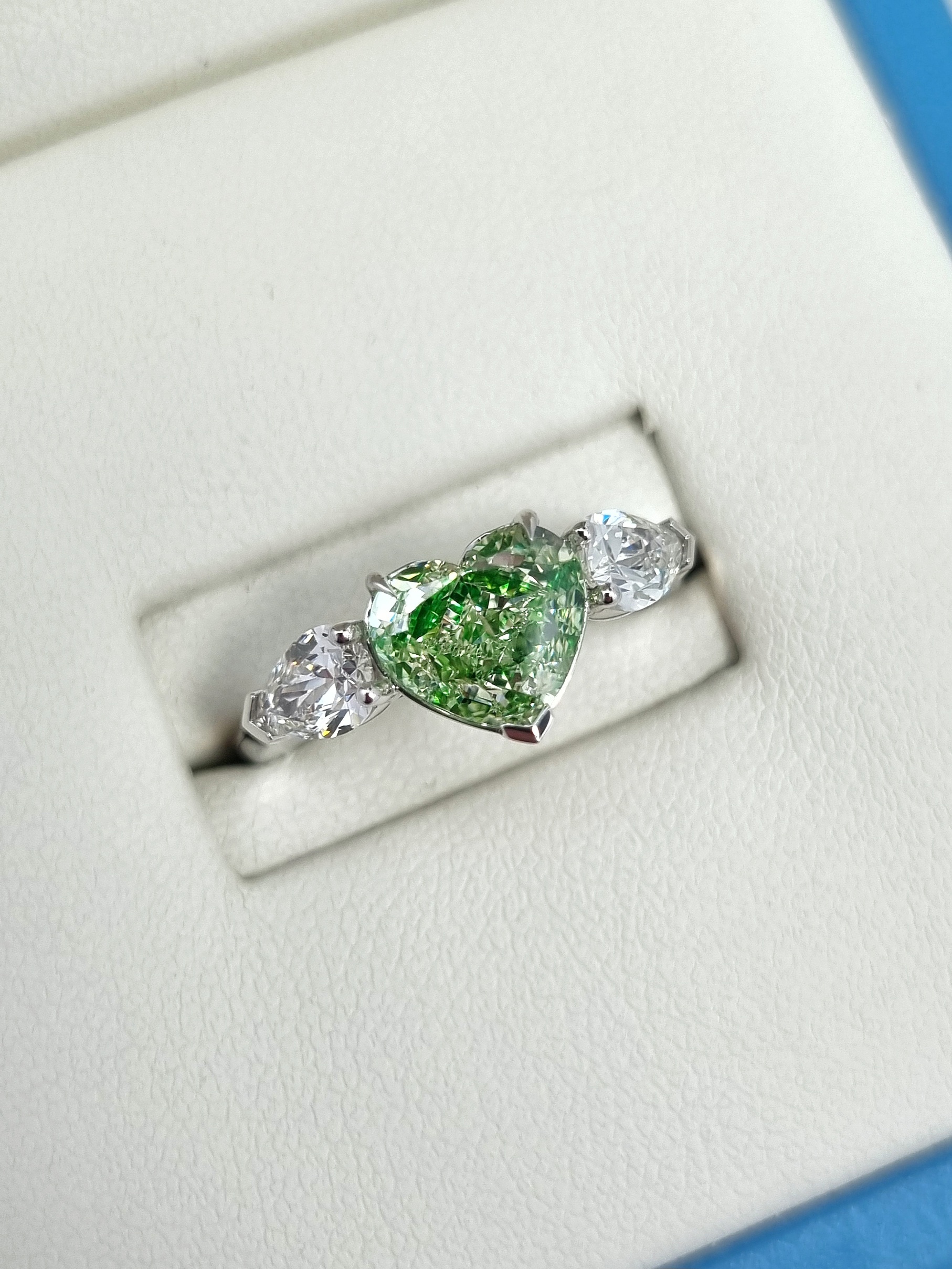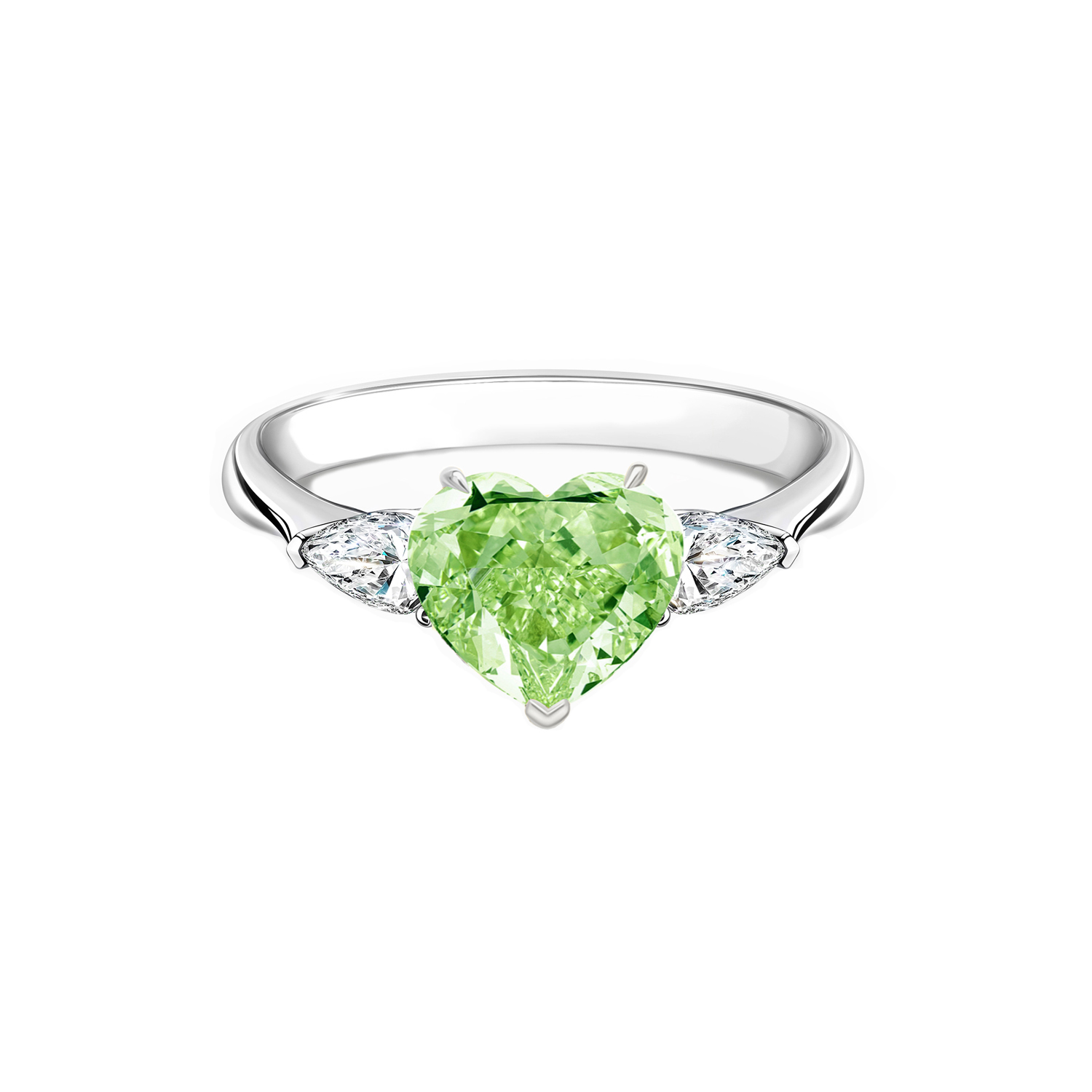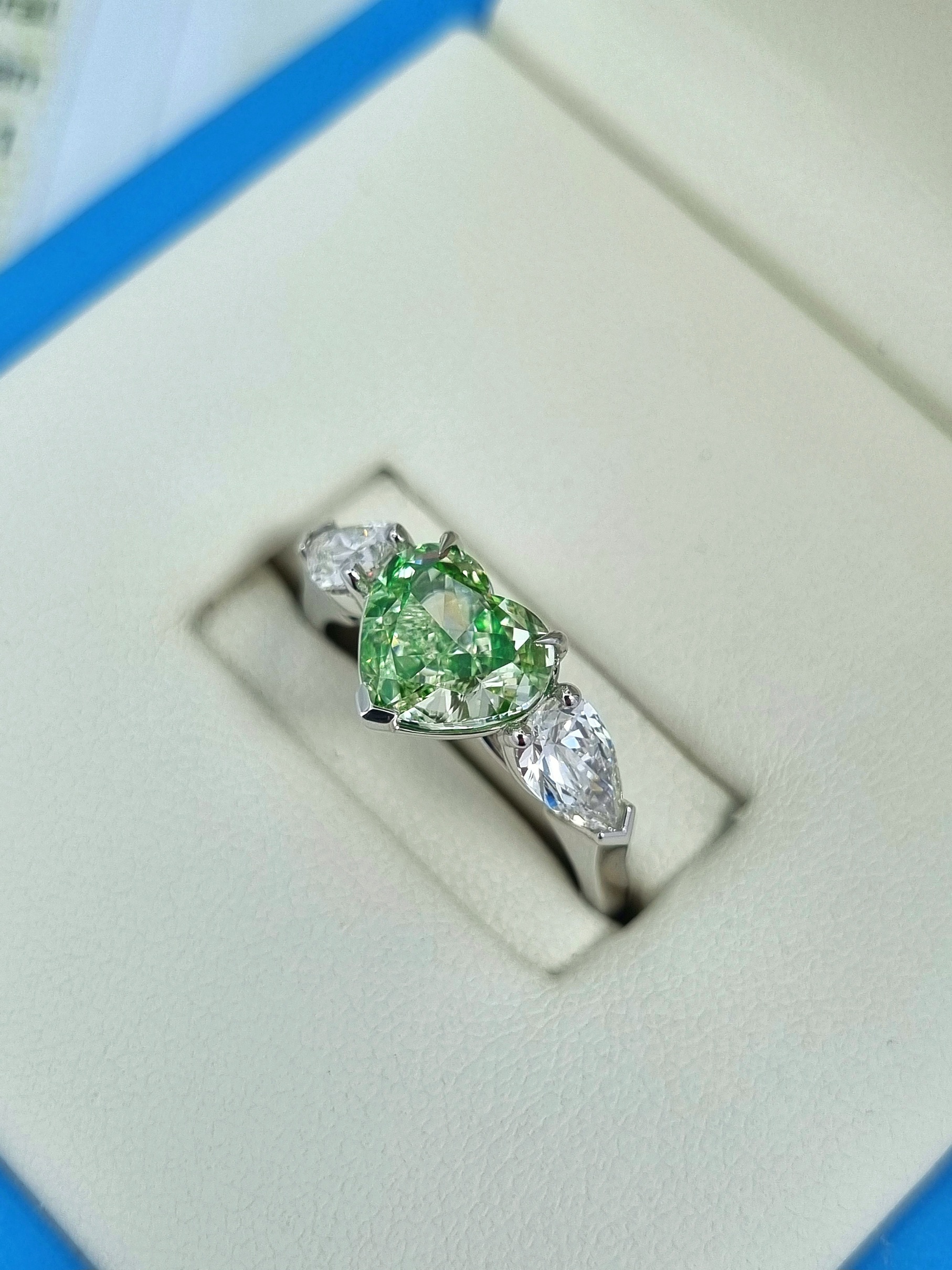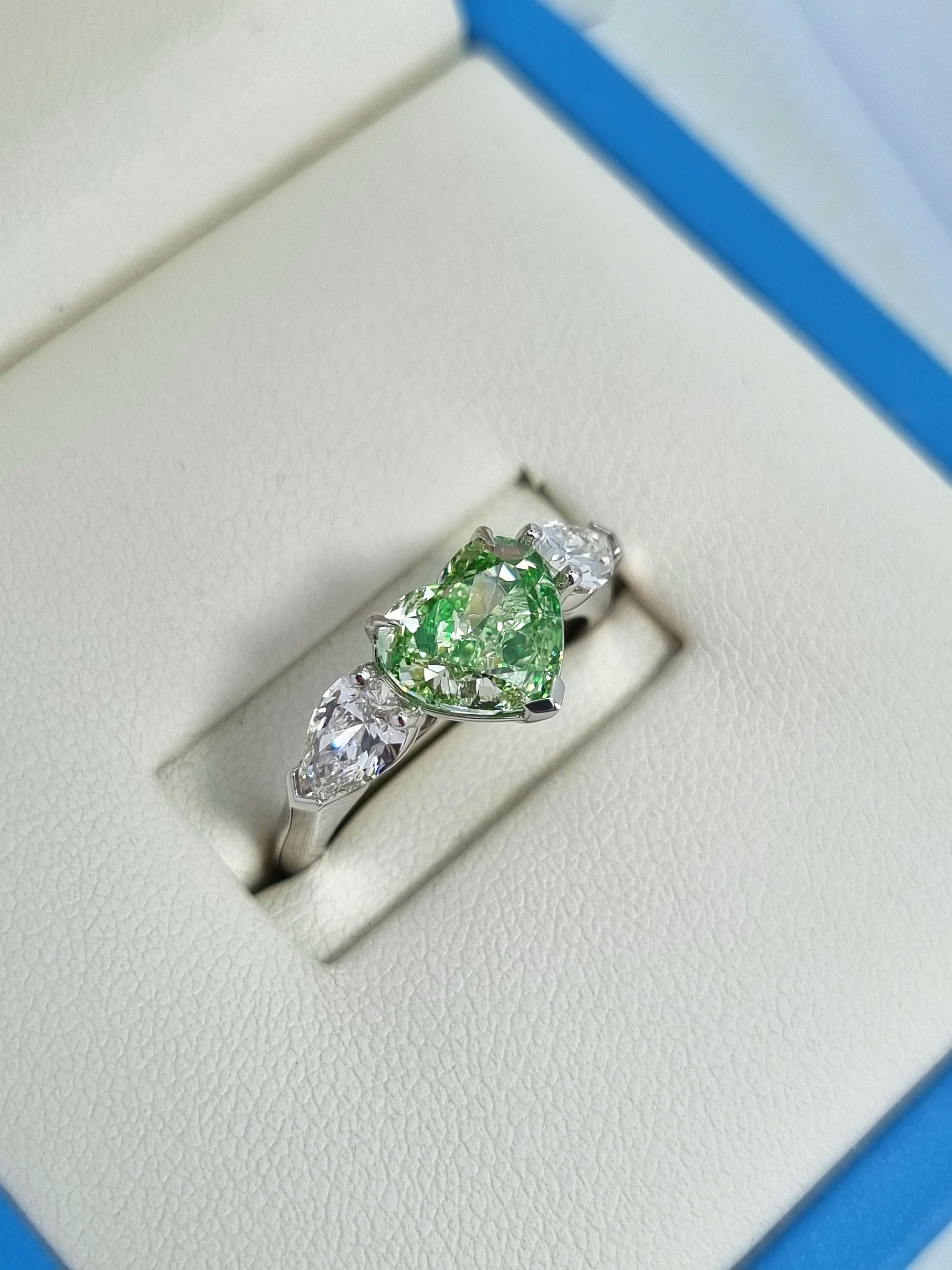 Вставка Центральный бриллиант 2,01 ct. Fancy Light Greenish Yellow/VS1, 2 боковых бриллианта общей массой 0,81 ct. H/VS2