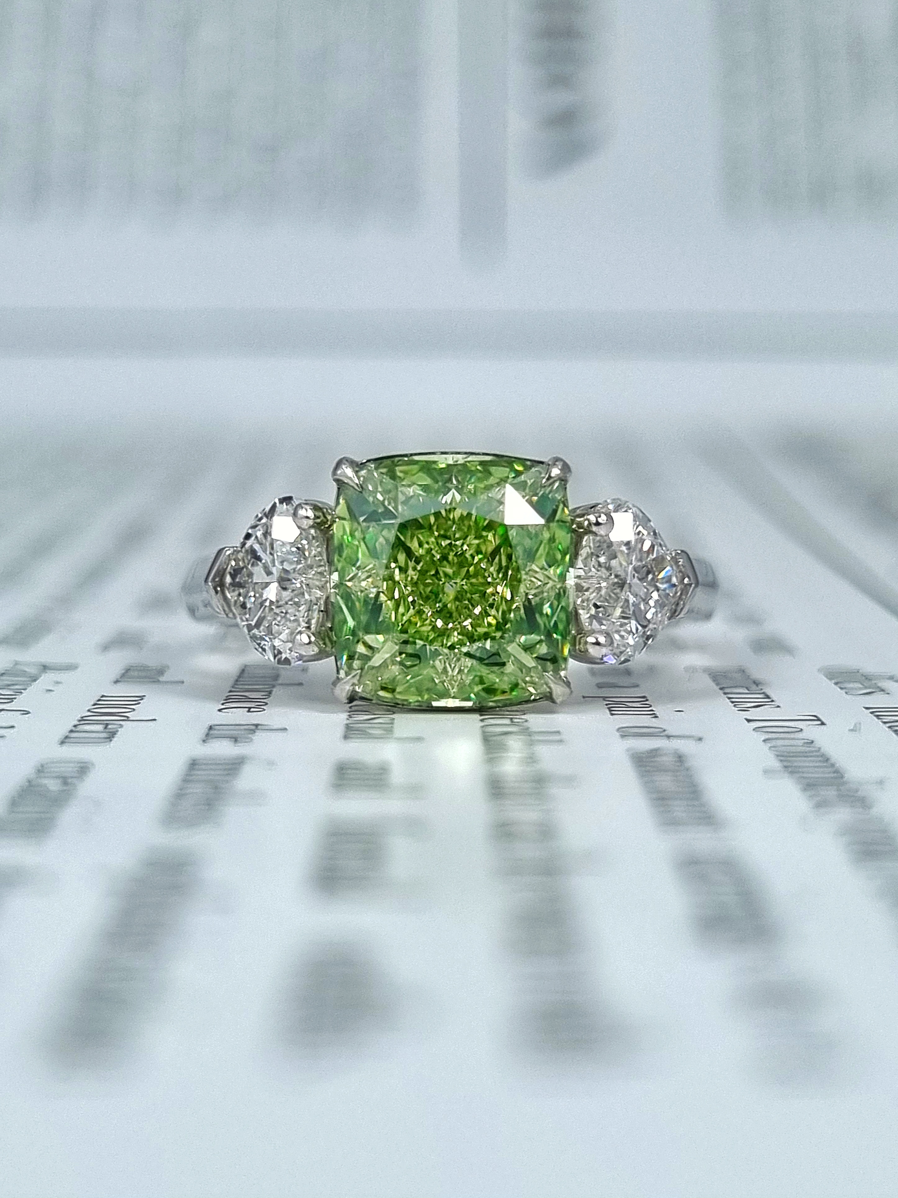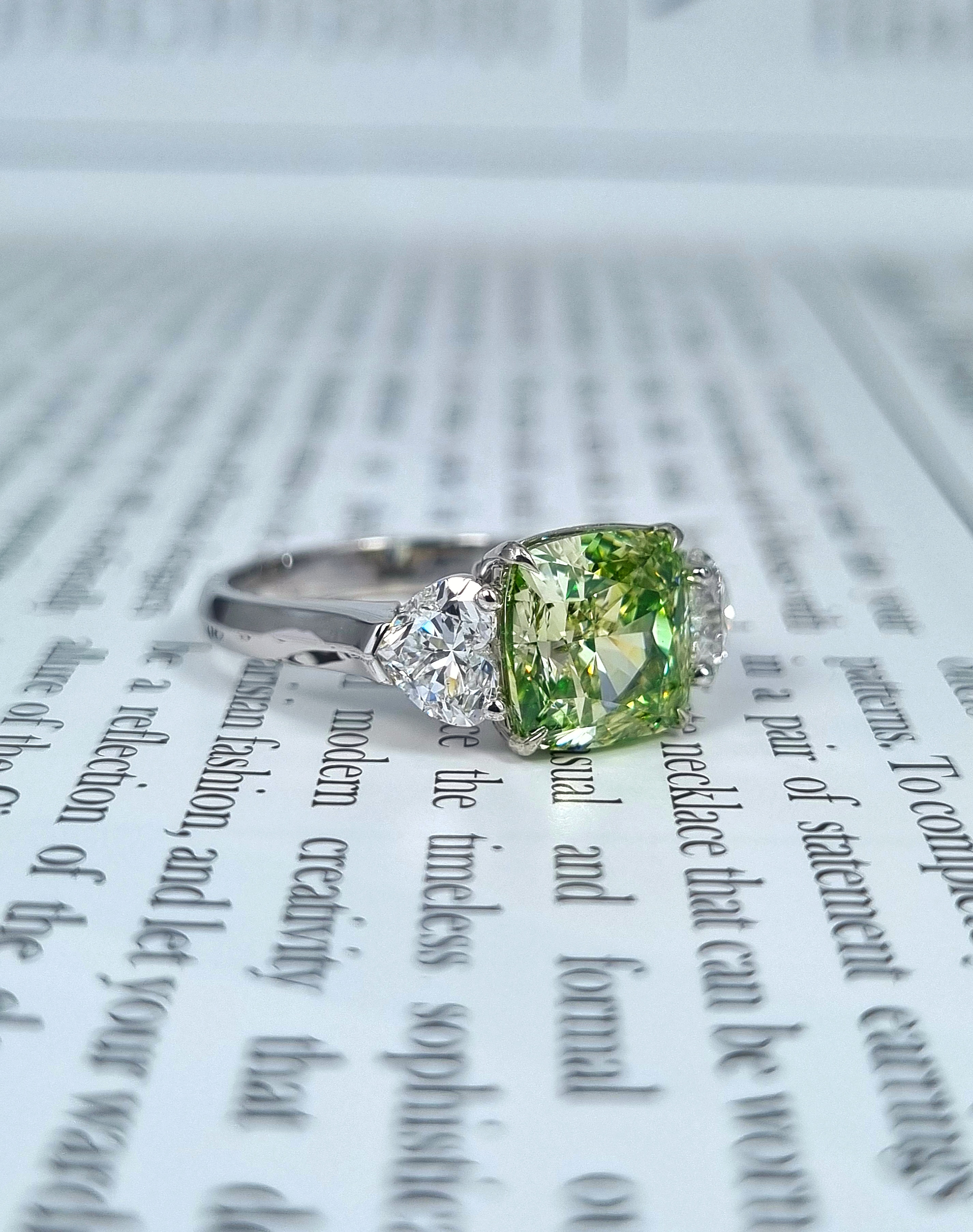 Вставка Центральный бриллиант 4,01 сt. Fancy Brownish Greenish Yellow/VS2; 2 боковых бриллианта огранки "Сердце" общей массой 1,02 ct. F/VS1
