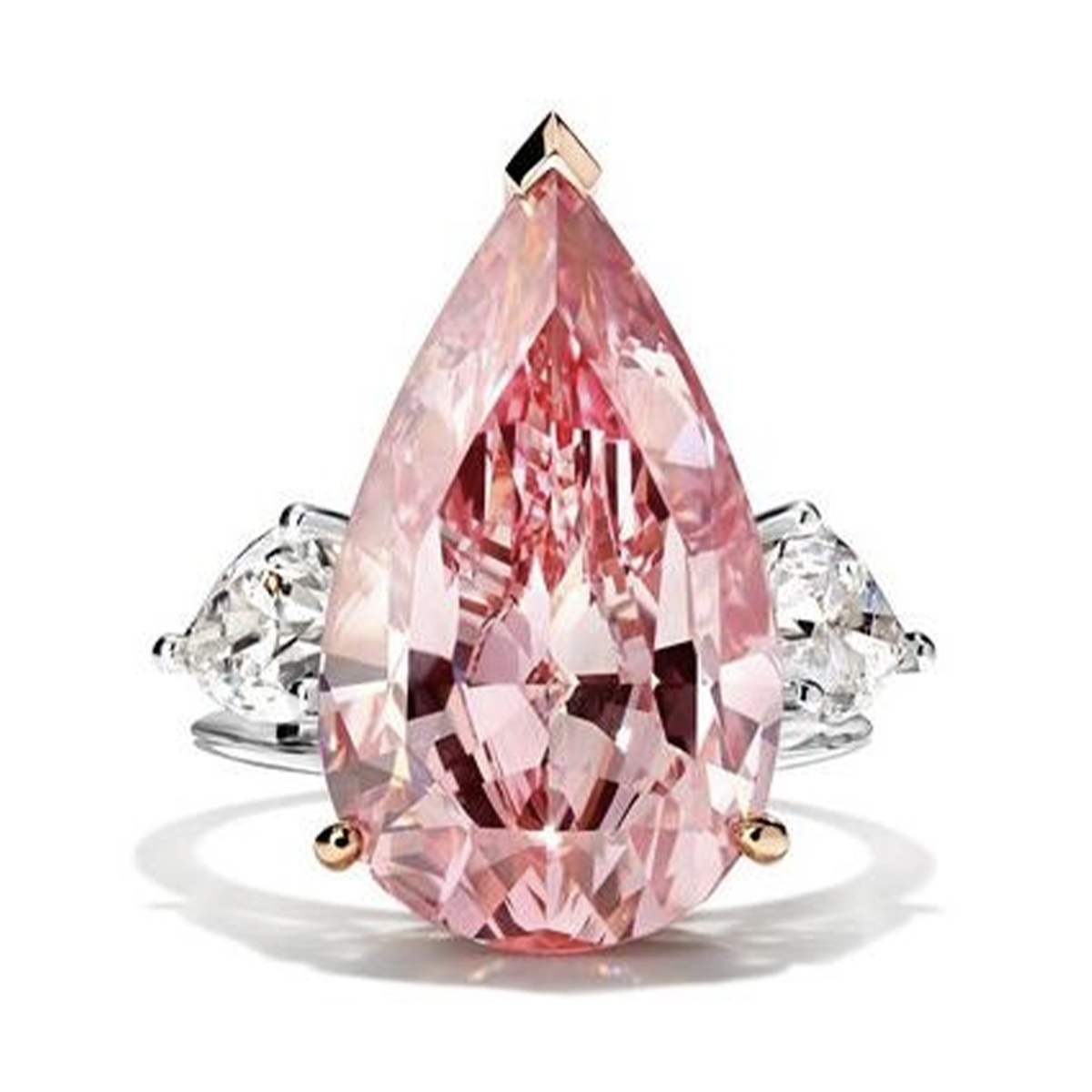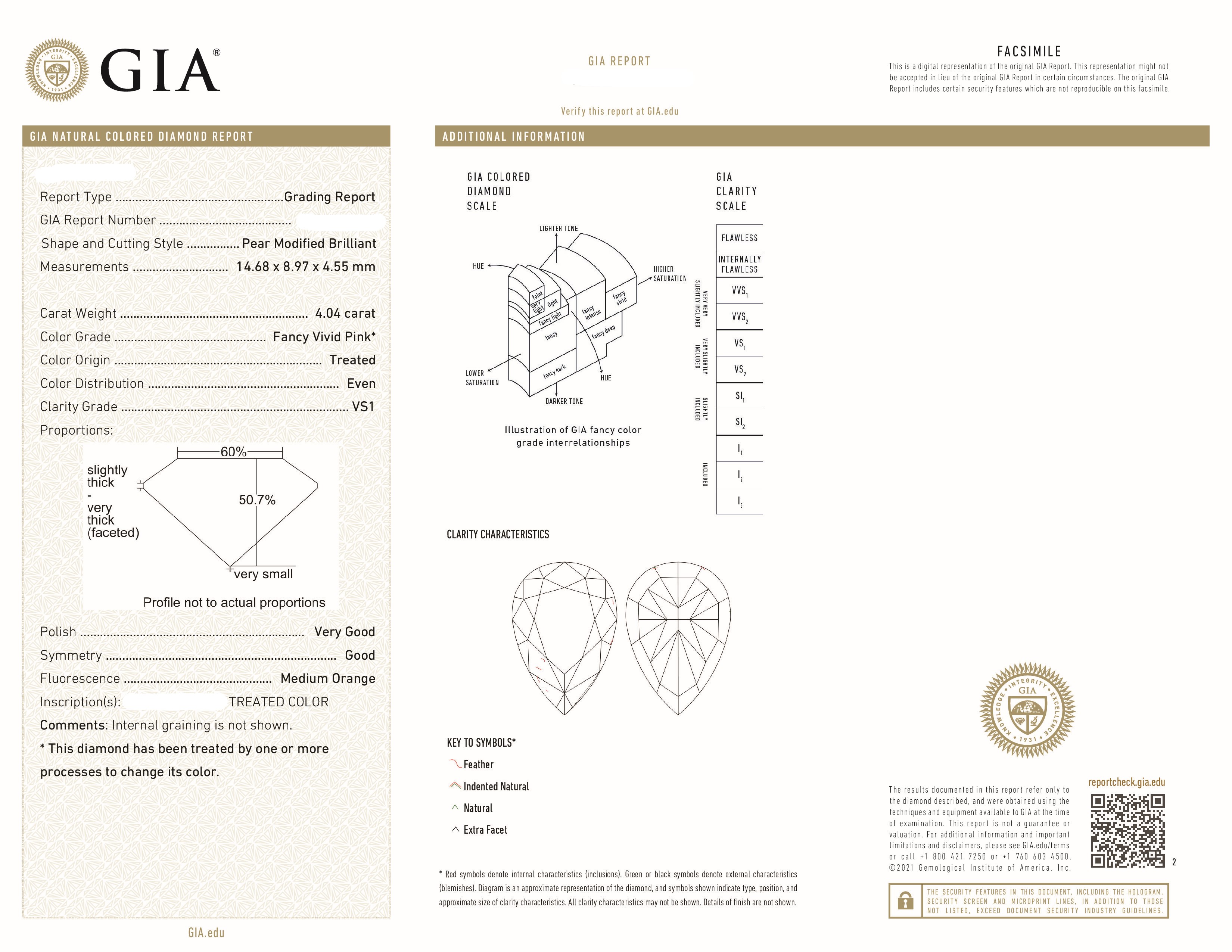 Этот шедевр ювелирного искусства поражает своей красотой и изысканностью. Центральный бриллиант весом 4,04 карата, имеющий сертификат от авторитетного Gemological Institute of America (GIA), является настоящим украшением кольца. Его уникальный оттенок Fancy Vivid Pink, достигнутый благодаря специальной обработке, придает изделию неповторимый шарм и роскошь.