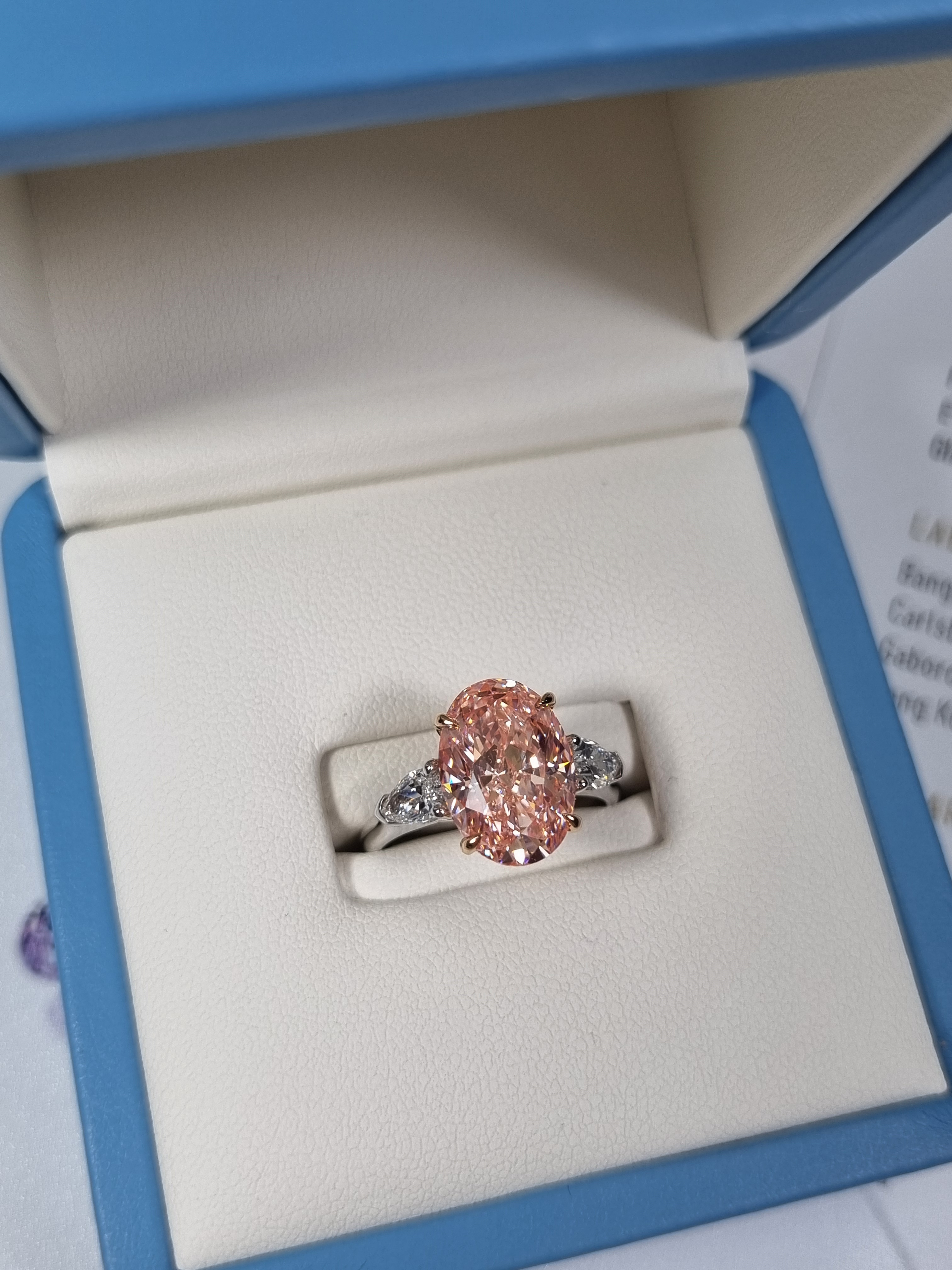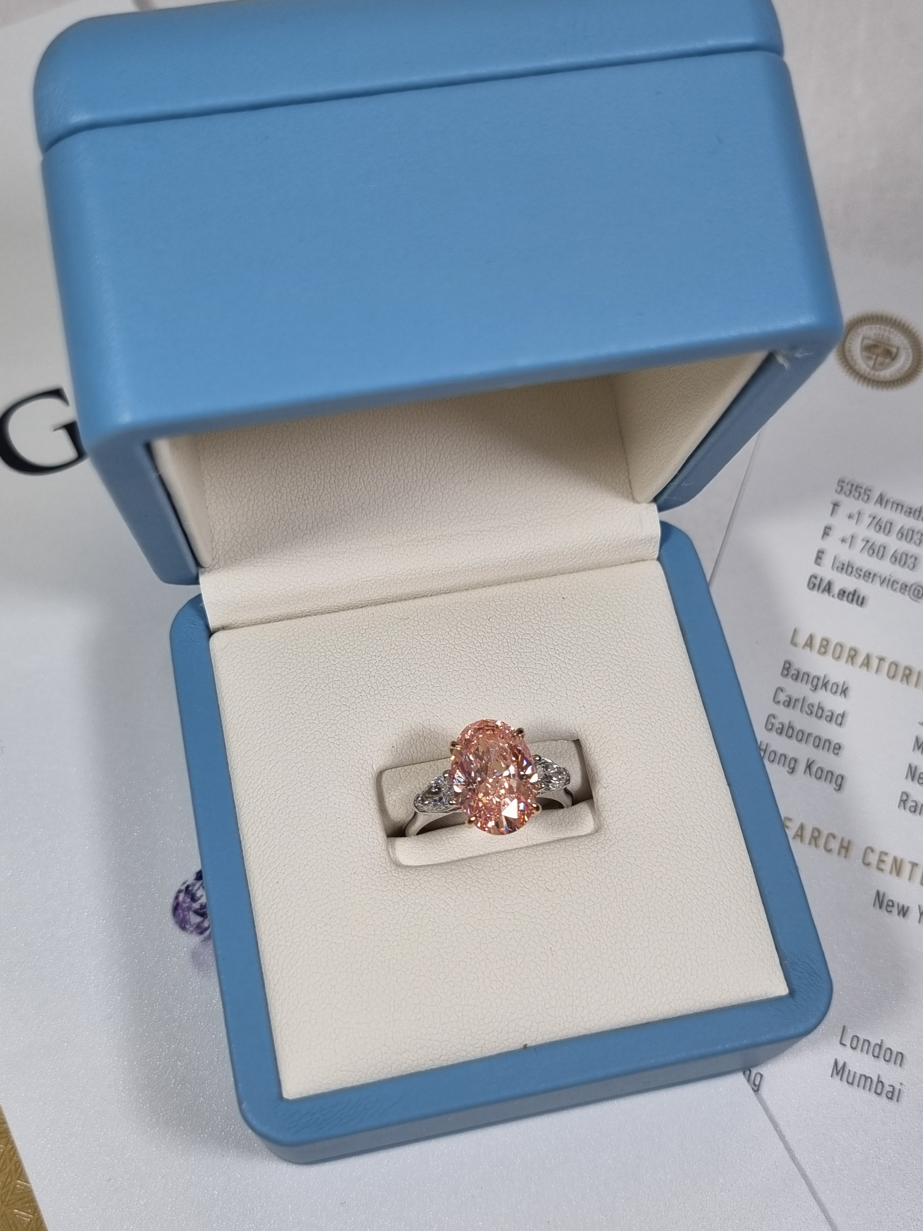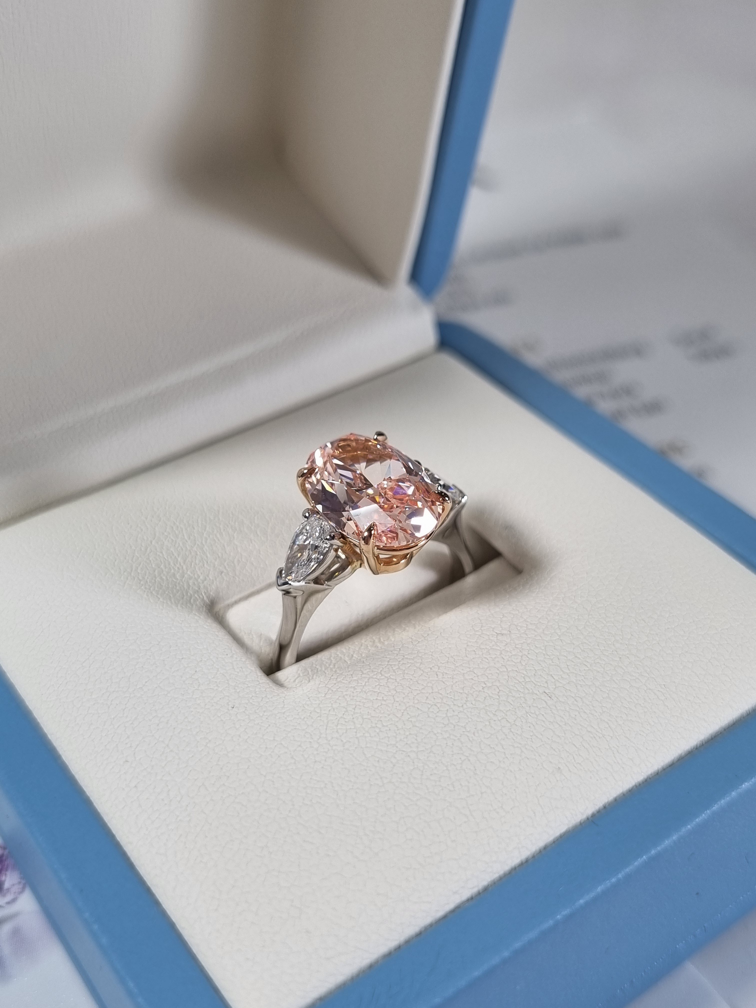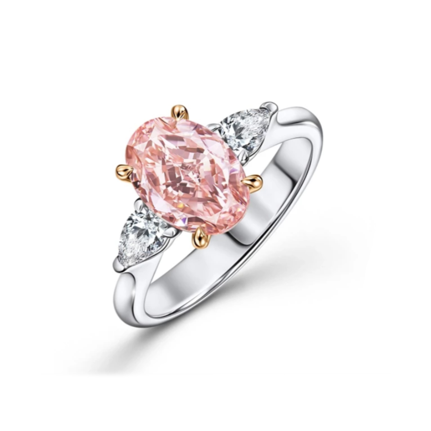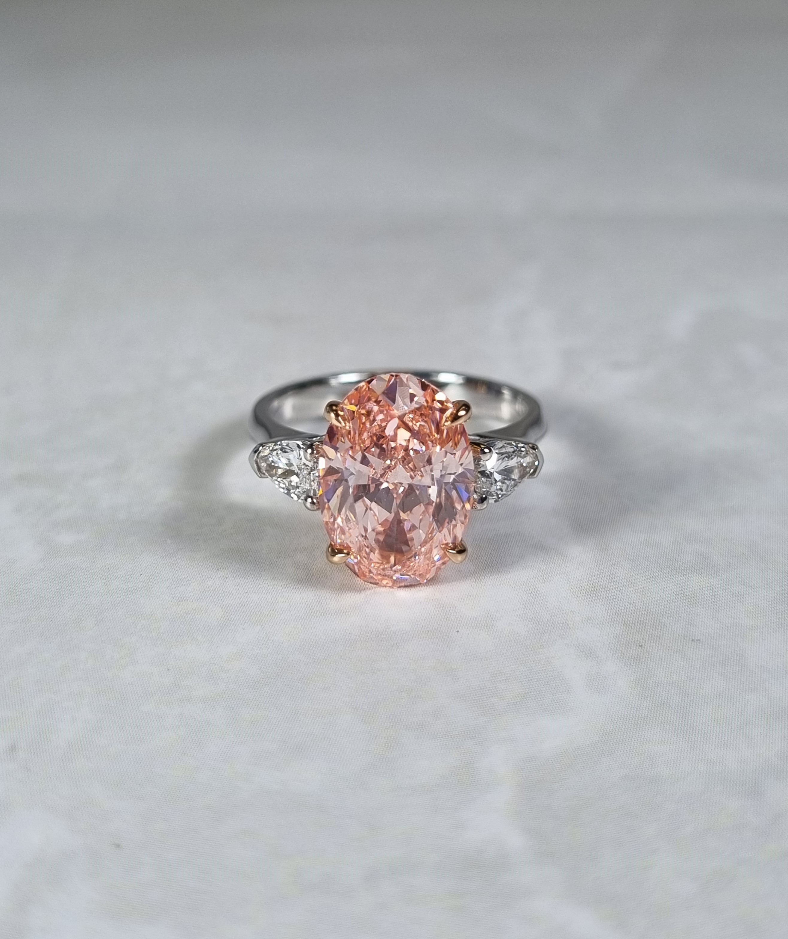 Центральный бриллиант весом 4,51 карата, имеющий интенсивно-розовый оттенок и классификацию SI1, является настоящим украшением этого кольца. Этот камень прошел через процесс обработки цвета, что делает его еще более уникальным и привлекательным. Боковые бриллианты, выполненные из Fine White/VS+, добавляют дополнительный блеск и изысканность этому изделию.