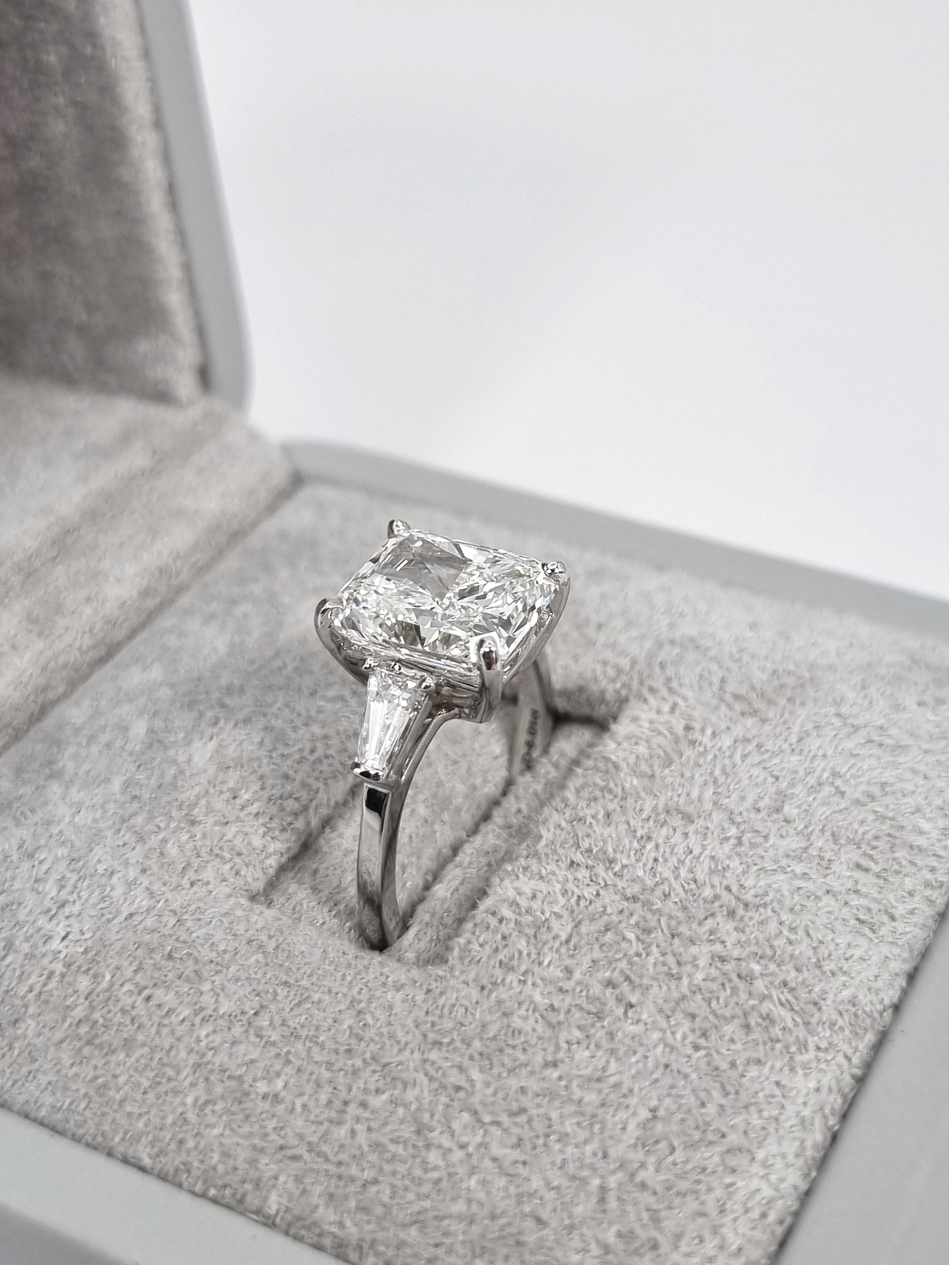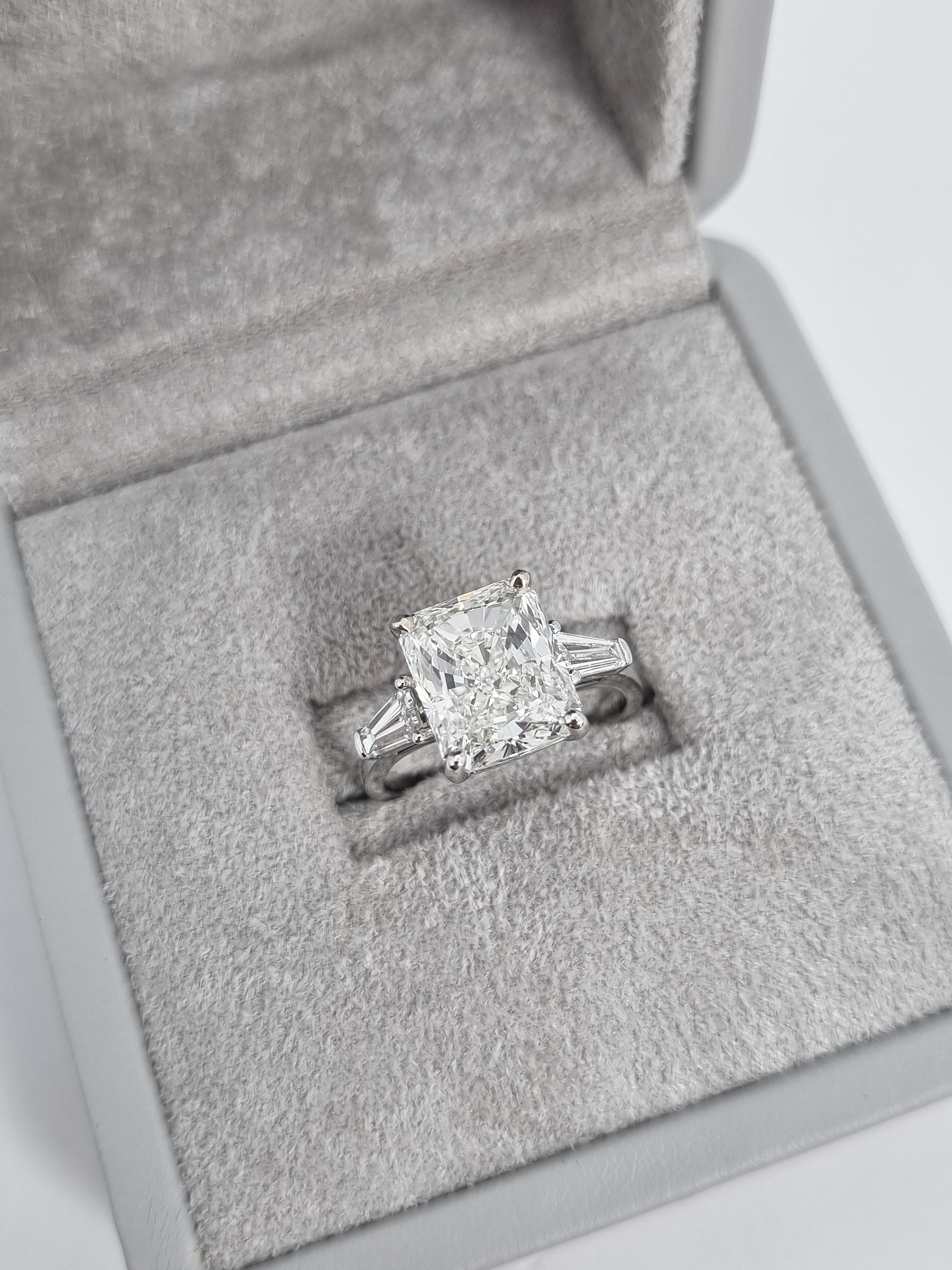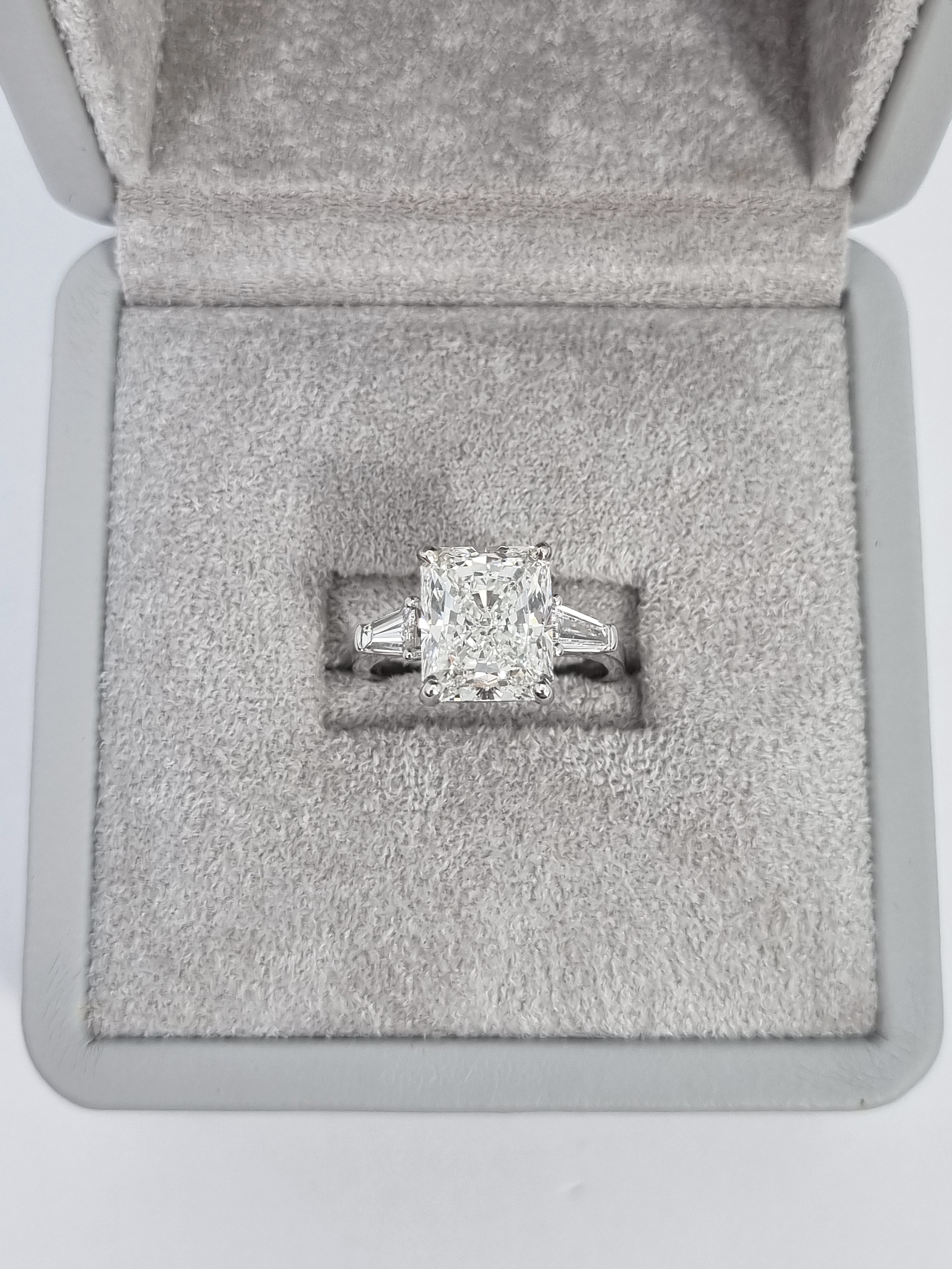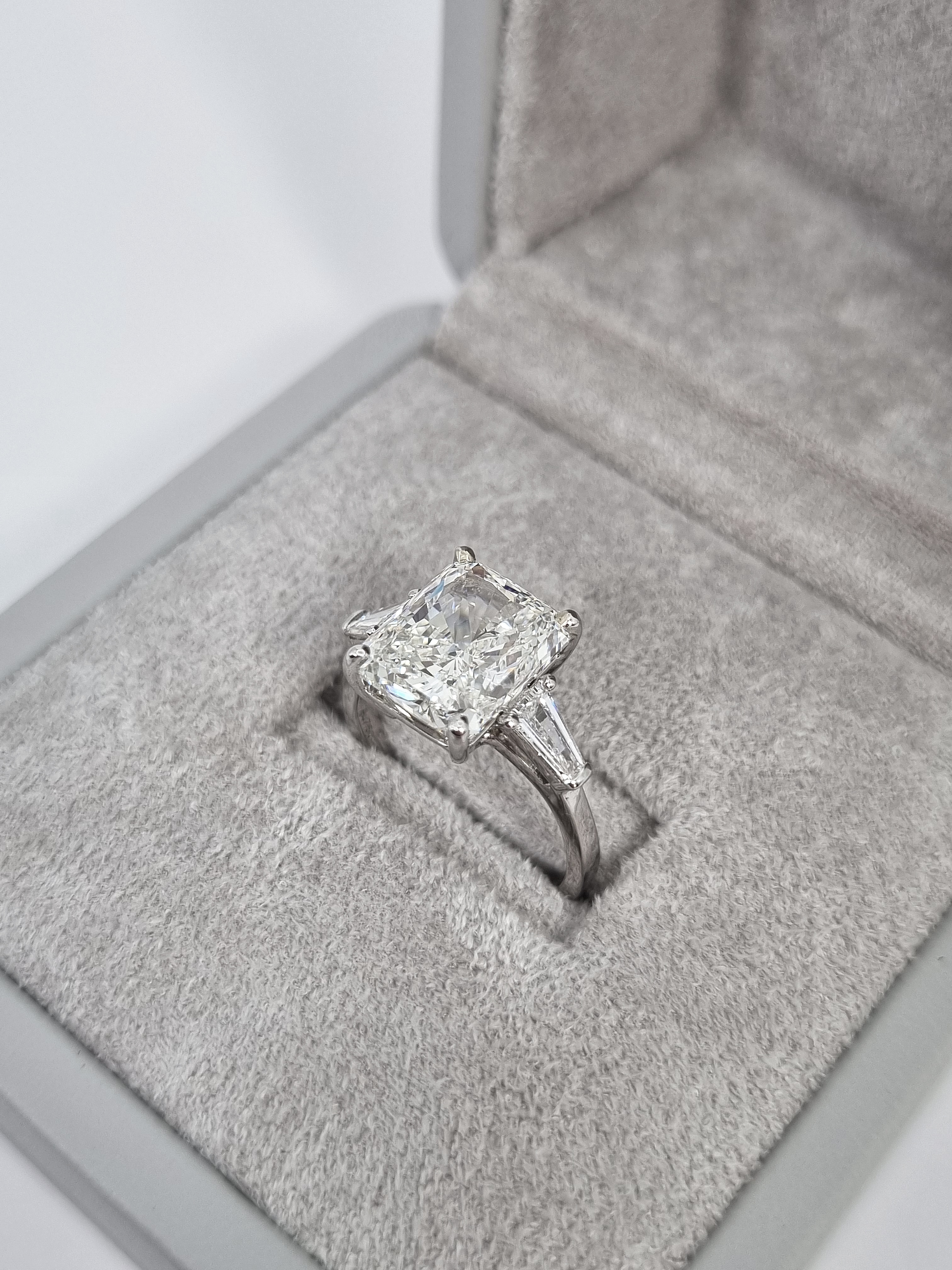 Кольцо изготовлено из высококачественного белого золота 750°, что обеспечивает ему долговечность и изящество. Центральный бриллиант весом 5,01 ct. G/VVS1, выполненный в форме Radiant cut, является настоящим украшением этого изделия. Его блеск и игра света не оставят равнодушным ни одного взгляда. Сертификат HRD подтверждает подлинность и качество бриллианта, что делает его еще более ценным и желанным.