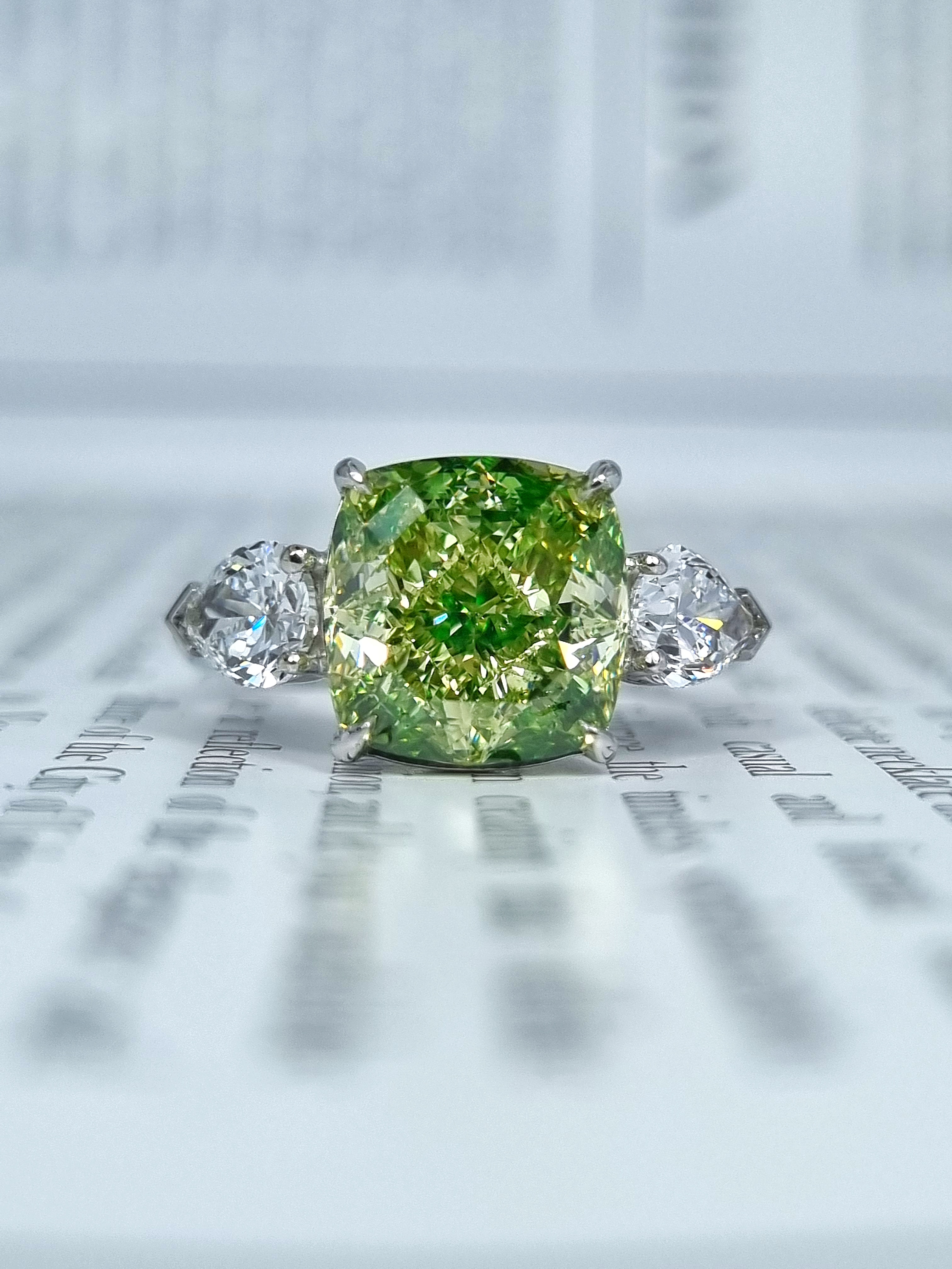 Вставка Центральный бриллиант 5,04 ct. "Cushion" Fancy Greenish Yellow/Si1; 2 боковых бриллианта общей массой 1,03 ct. D/VS1