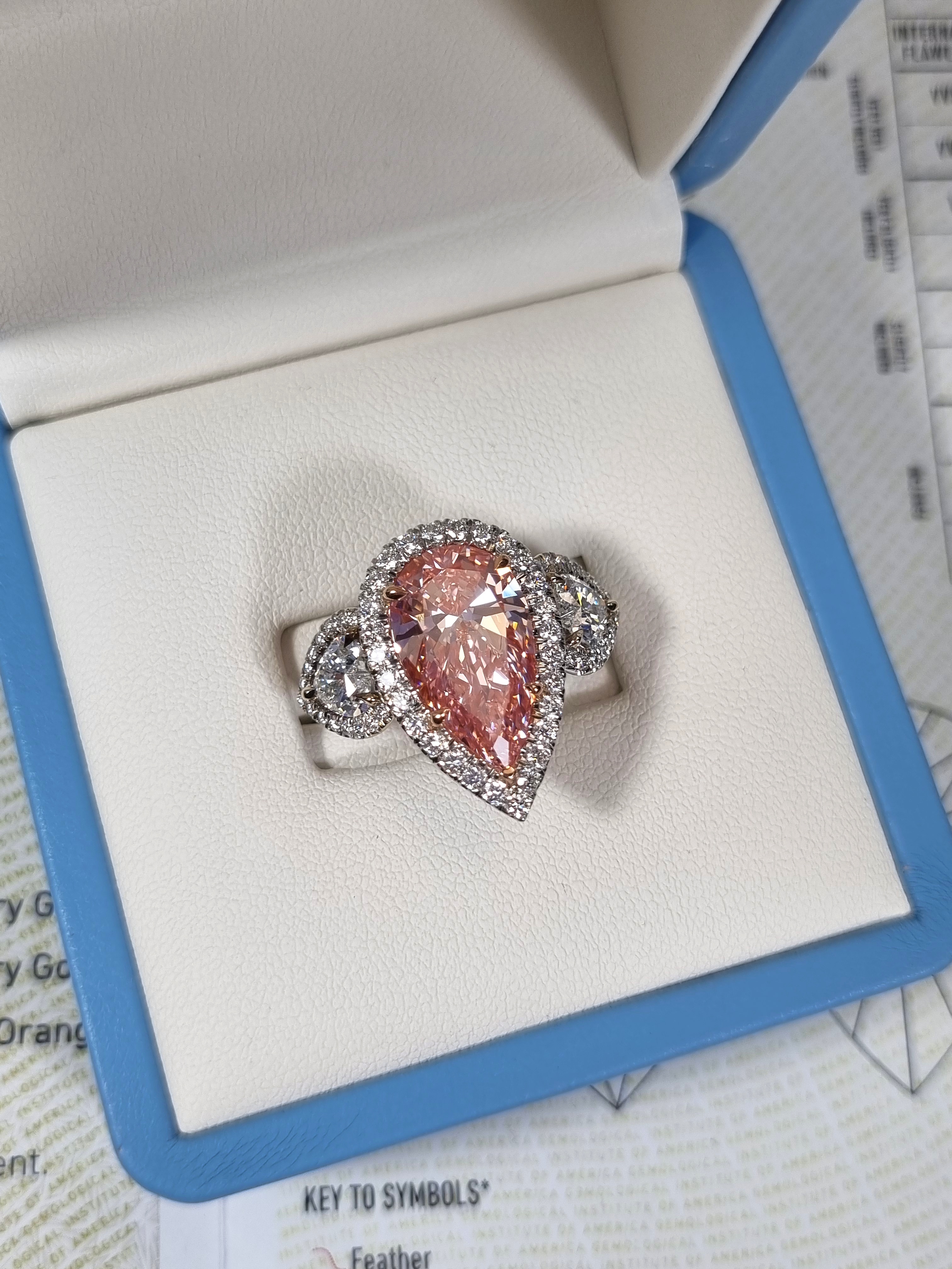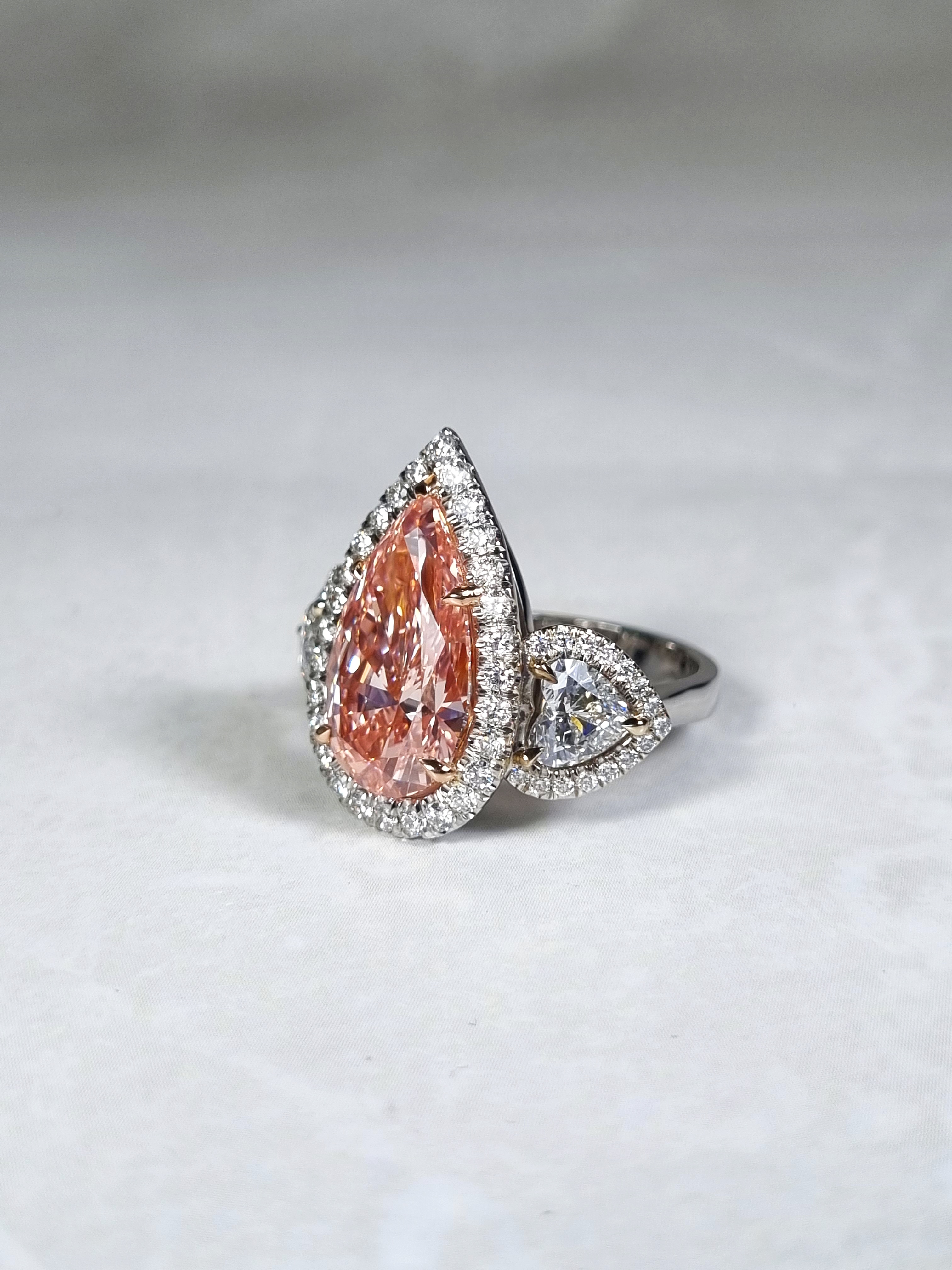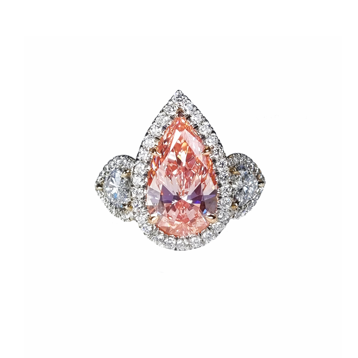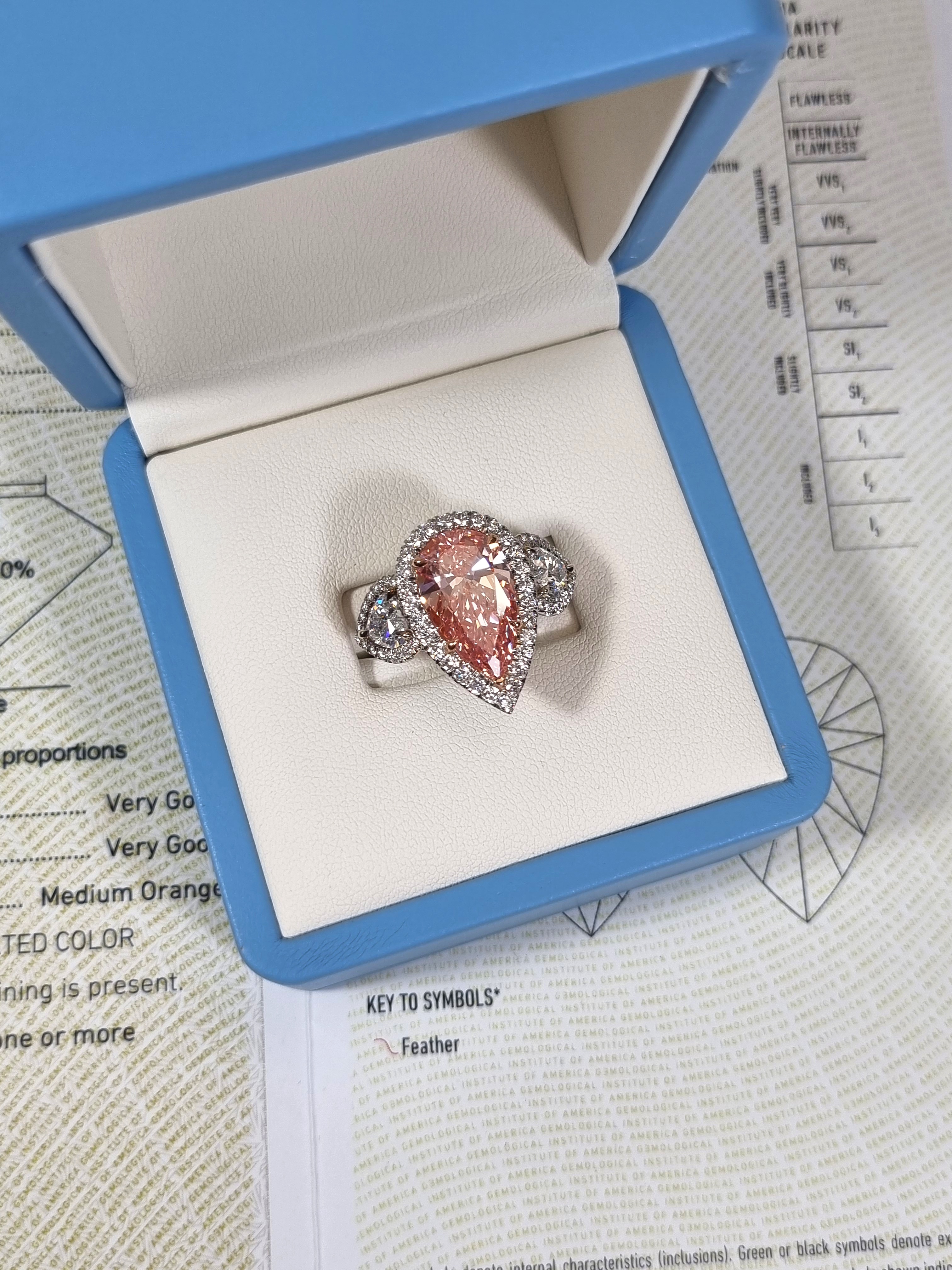 Кольцо изготовлено из высококачественного белого золота 750°, что обеспечивает ему долговечность и изящество. Центральный бриллиант весом 5,06 ct обладает интенсивно-розовым оттенком (Fancy Intense pink*), который был искусственно усилен, и имеет высокую чистоту VVS2. Этот бриллиант окружен боковыми бриллиантами Fine White/VS+, что добавляет изделию дополнительный блеск и роскошь.
