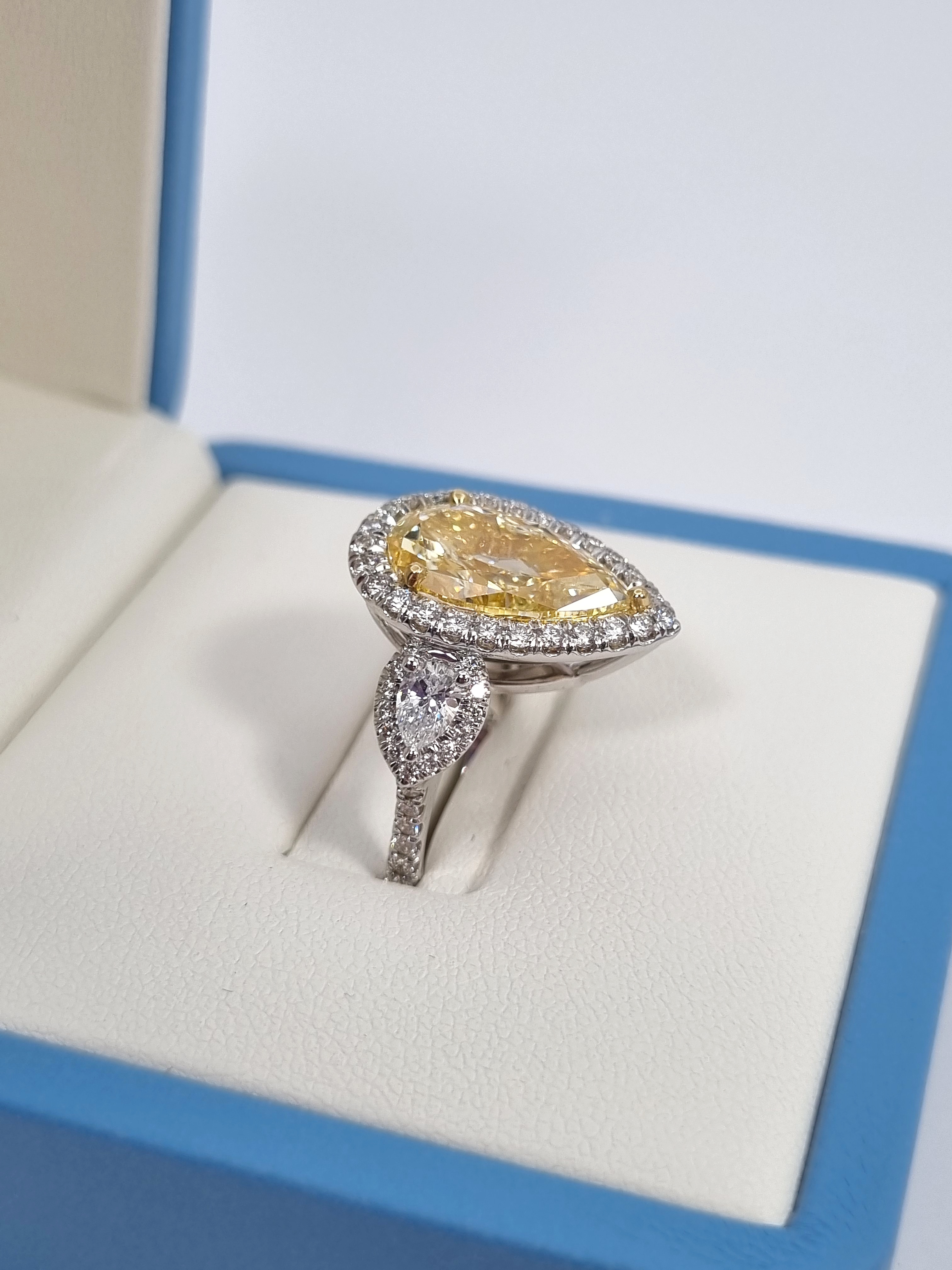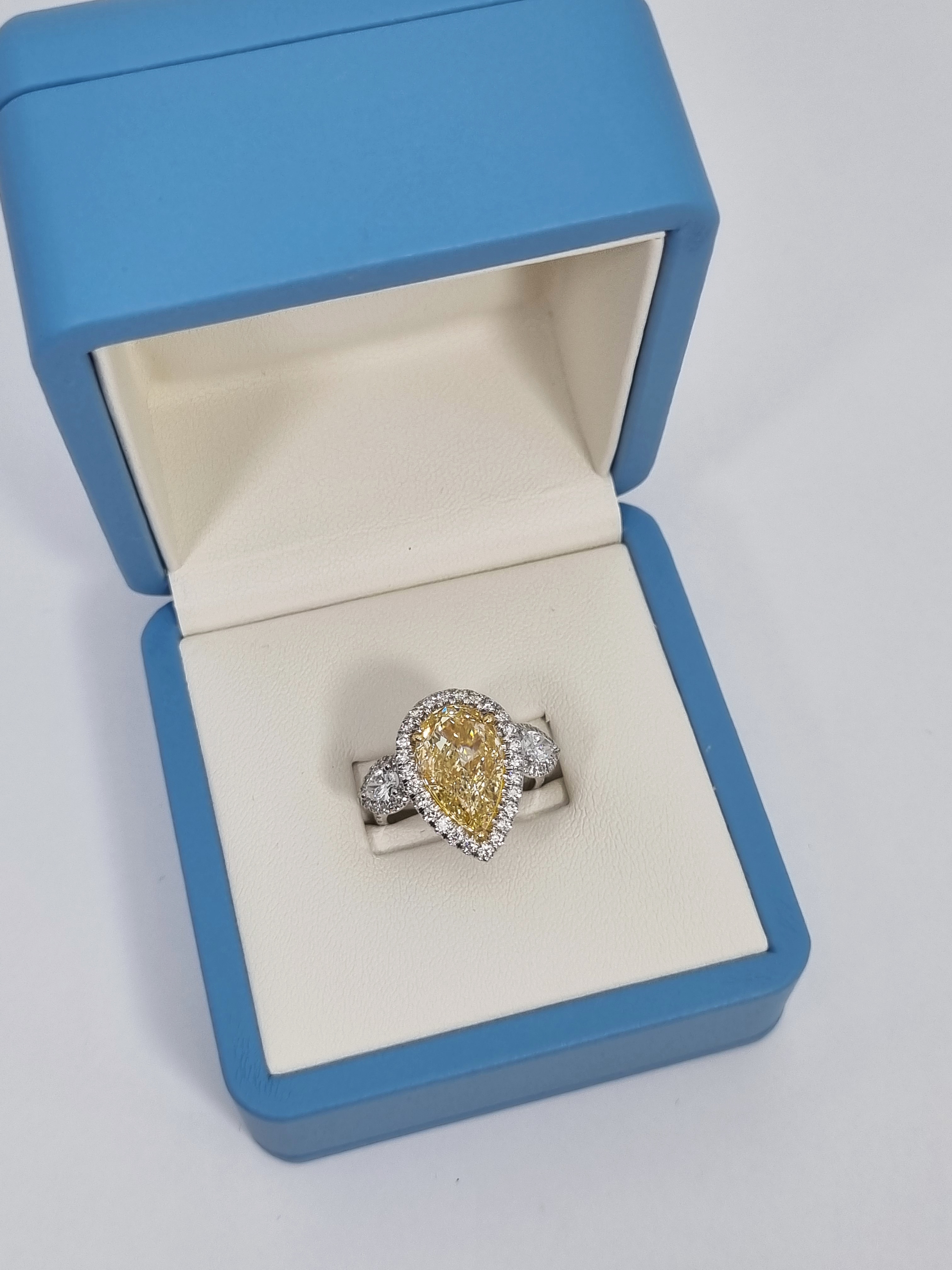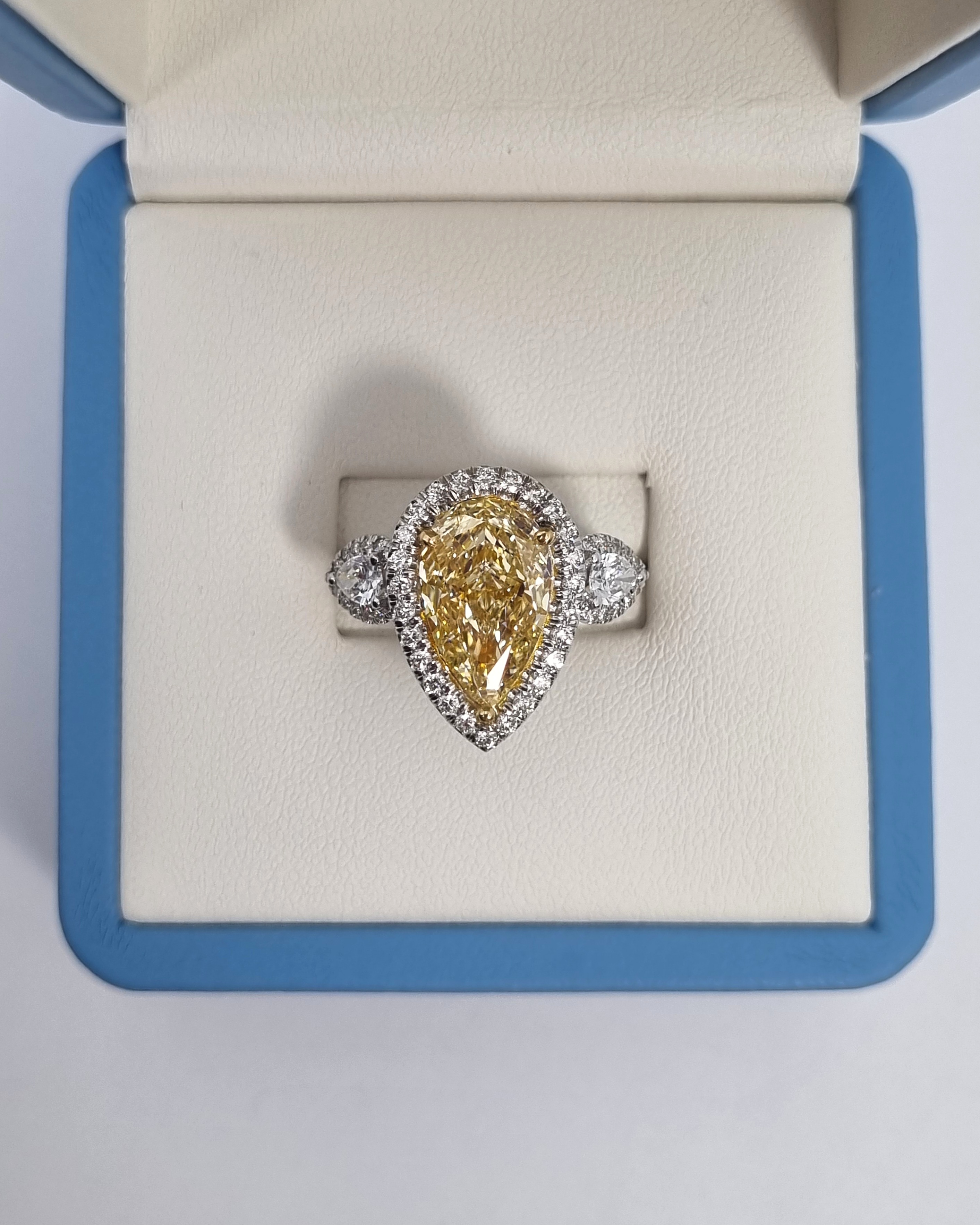 Центральный бриллиант весом 5,63 карата, имеющий редкую и ценимую цветовую гамму Fancy Light Yellow, ослепительно сияет на фоне белого золота 750 пробы. Боковые бриллианты Fine White/VS+ добавляют изделию дополнительный блеск и изысканность. Каждый элемент кольца тщательно проработан, чтобы создать неповторимый образ.