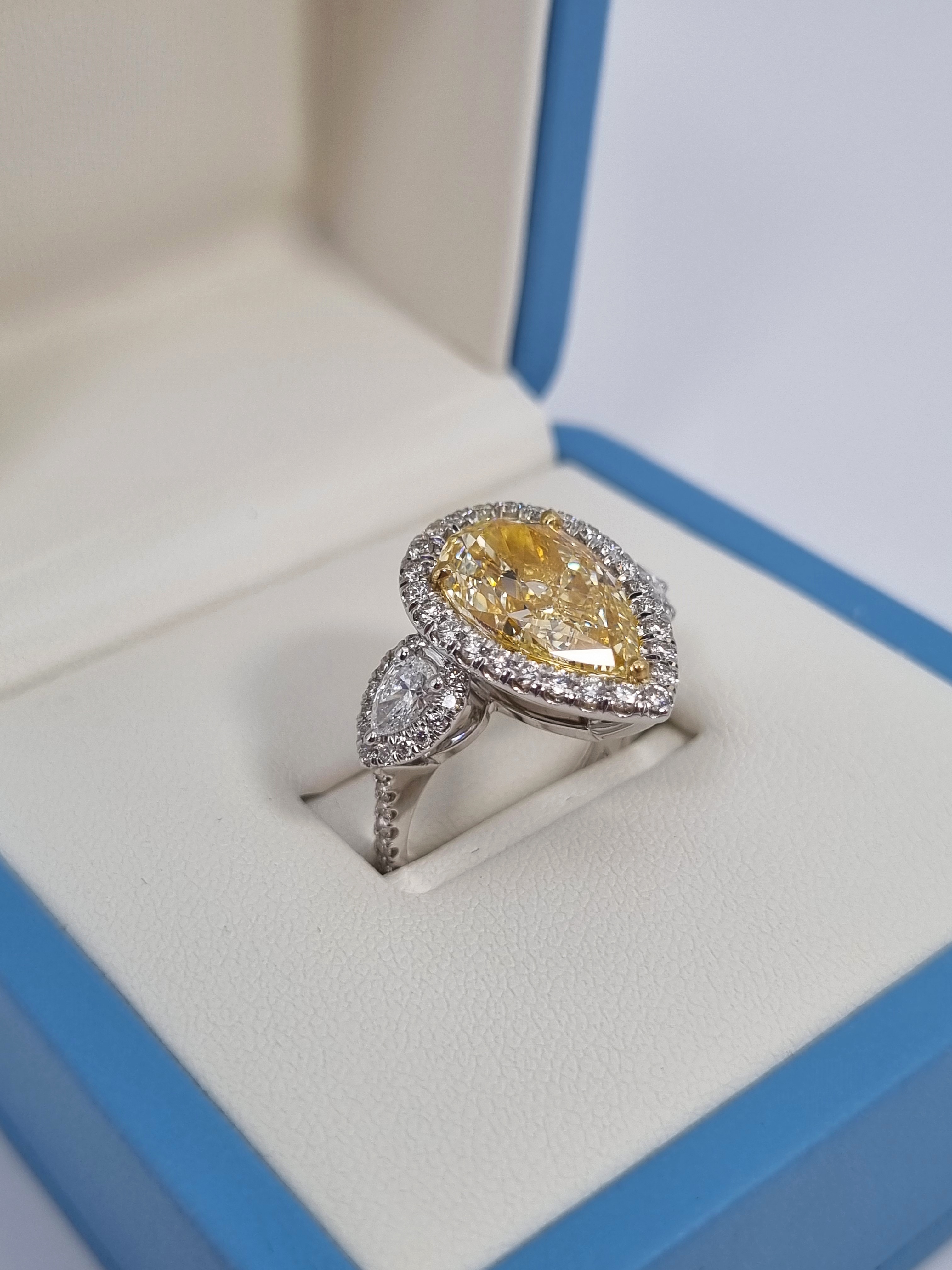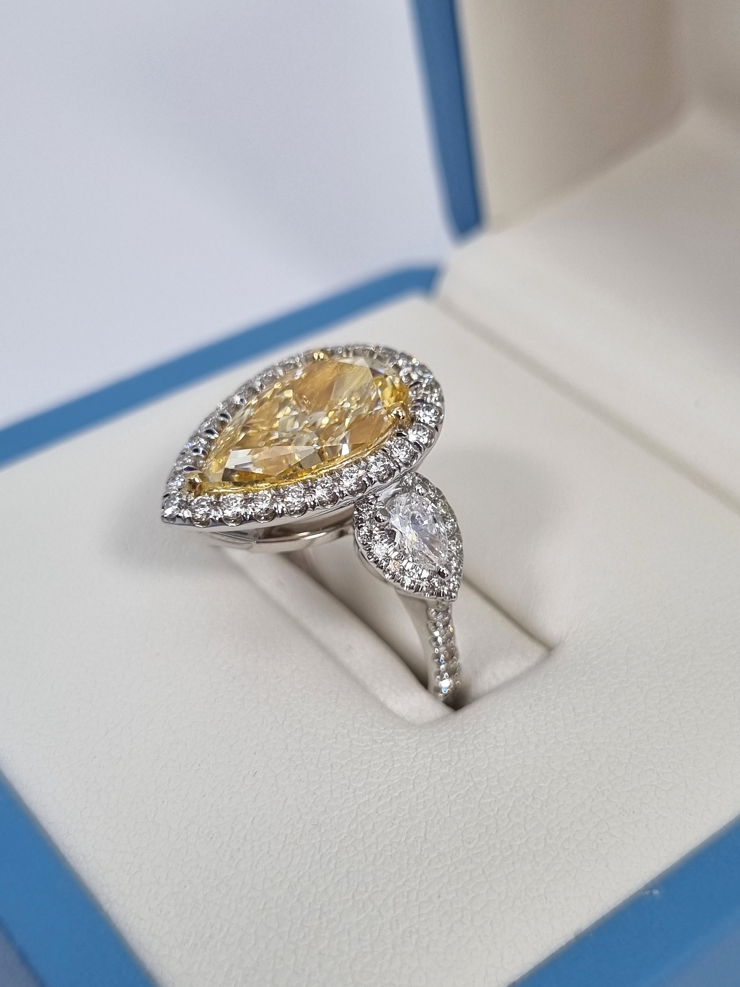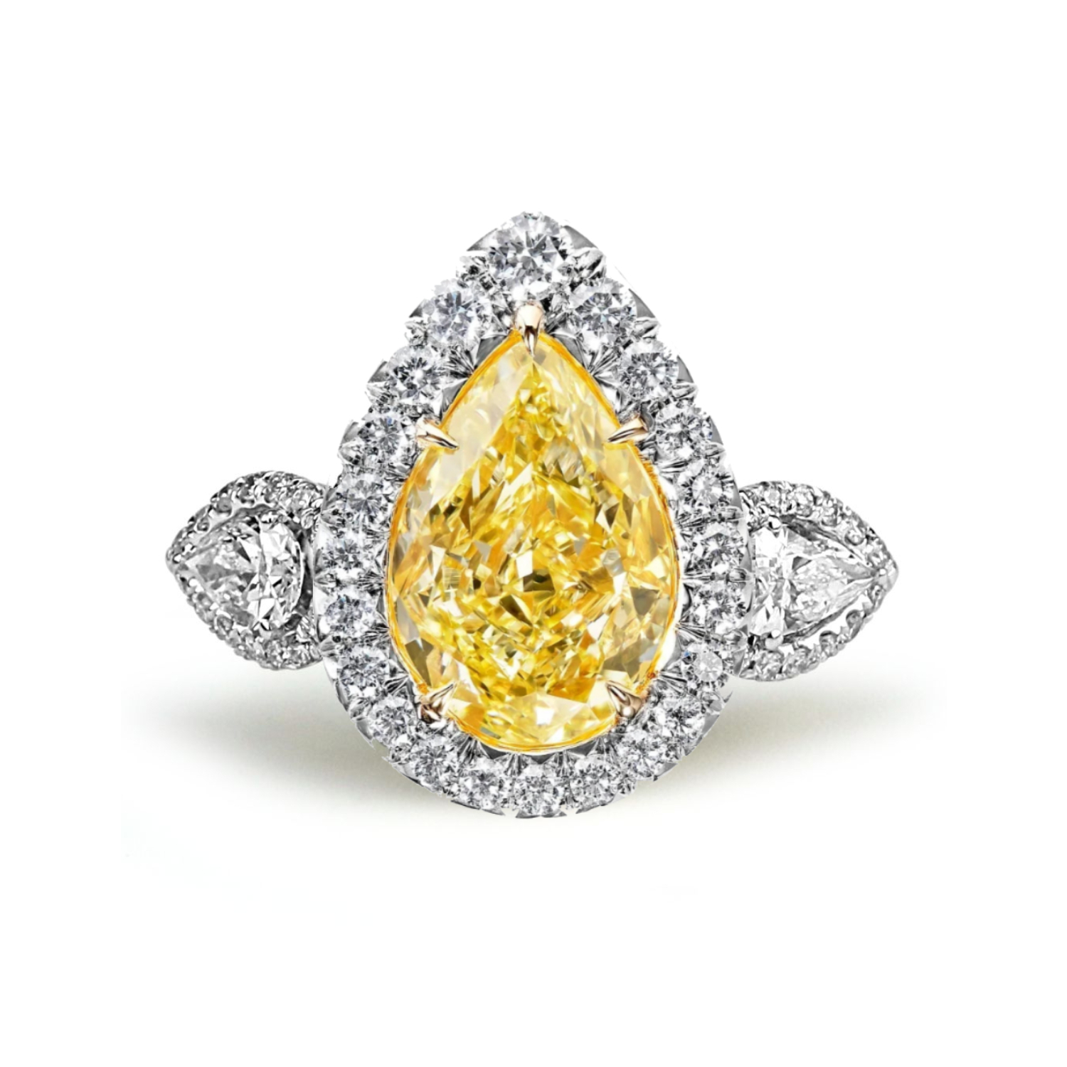 Центральный бриллиант весом 5,63 карата, имеющий редкую и ценимую цветовую гамму Fancy Light Yellow, ослепительно сияет на фоне белого золота 750 пробы. Боковые бриллианты Fine White/VS+ добавляют изделию дополнительный блеск и изысканность. Каждый элемент кольца тщательно проработан, чтобы создать неповторимый образ.