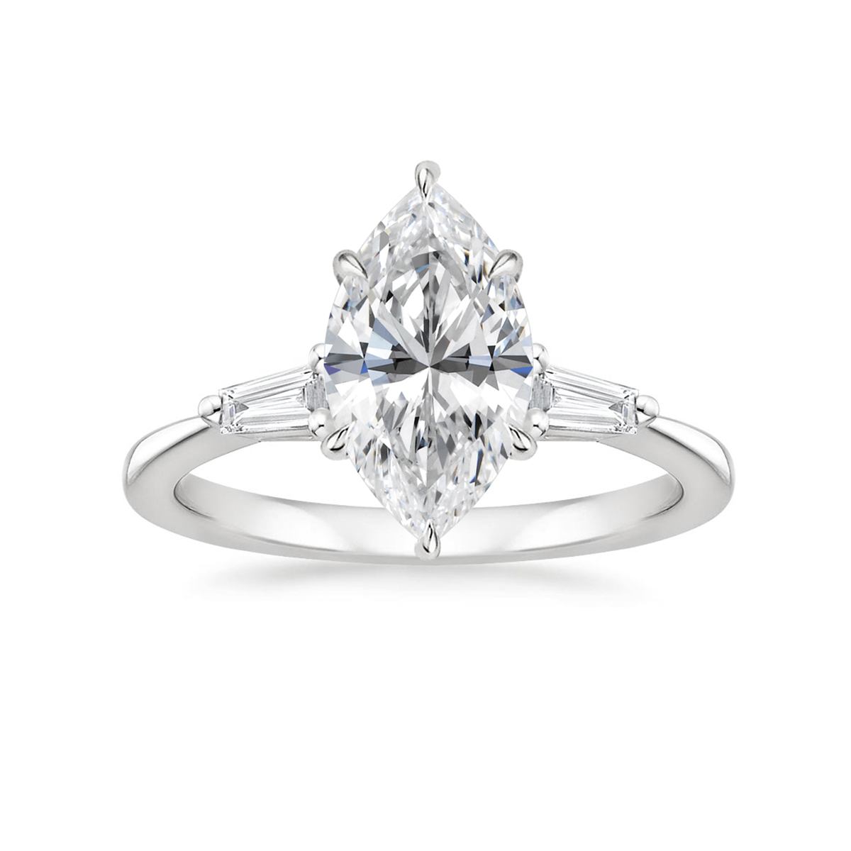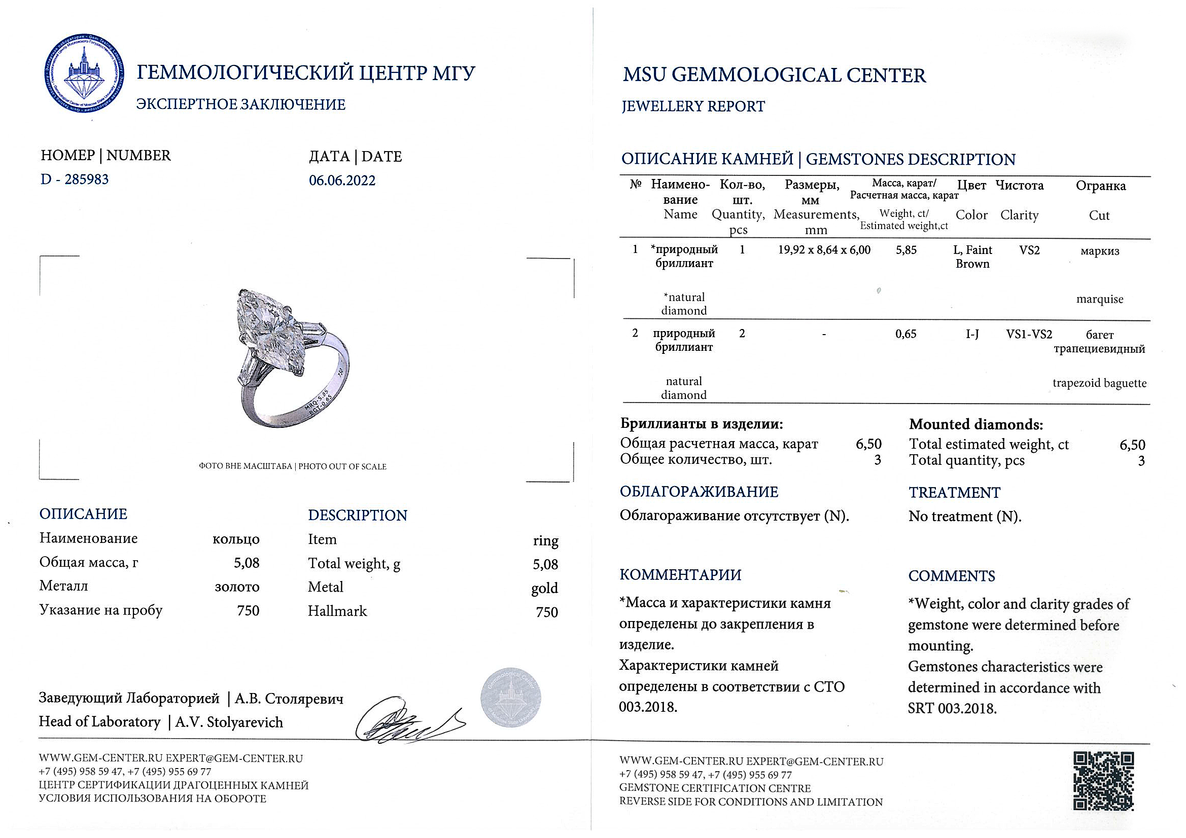 Этот шедевр ювелирного искусства выполнен из белого золота 750°, что придает ему особую изысканность и элегантность. Центральный бриллиант "Маркиз" L, Faint Brown/VS2, сертифицированный Московским государственным университетом, является настоящим произведением искусства. Его уникальный оттенок и высокая степень прозрачности делают его поистине незабываемым.