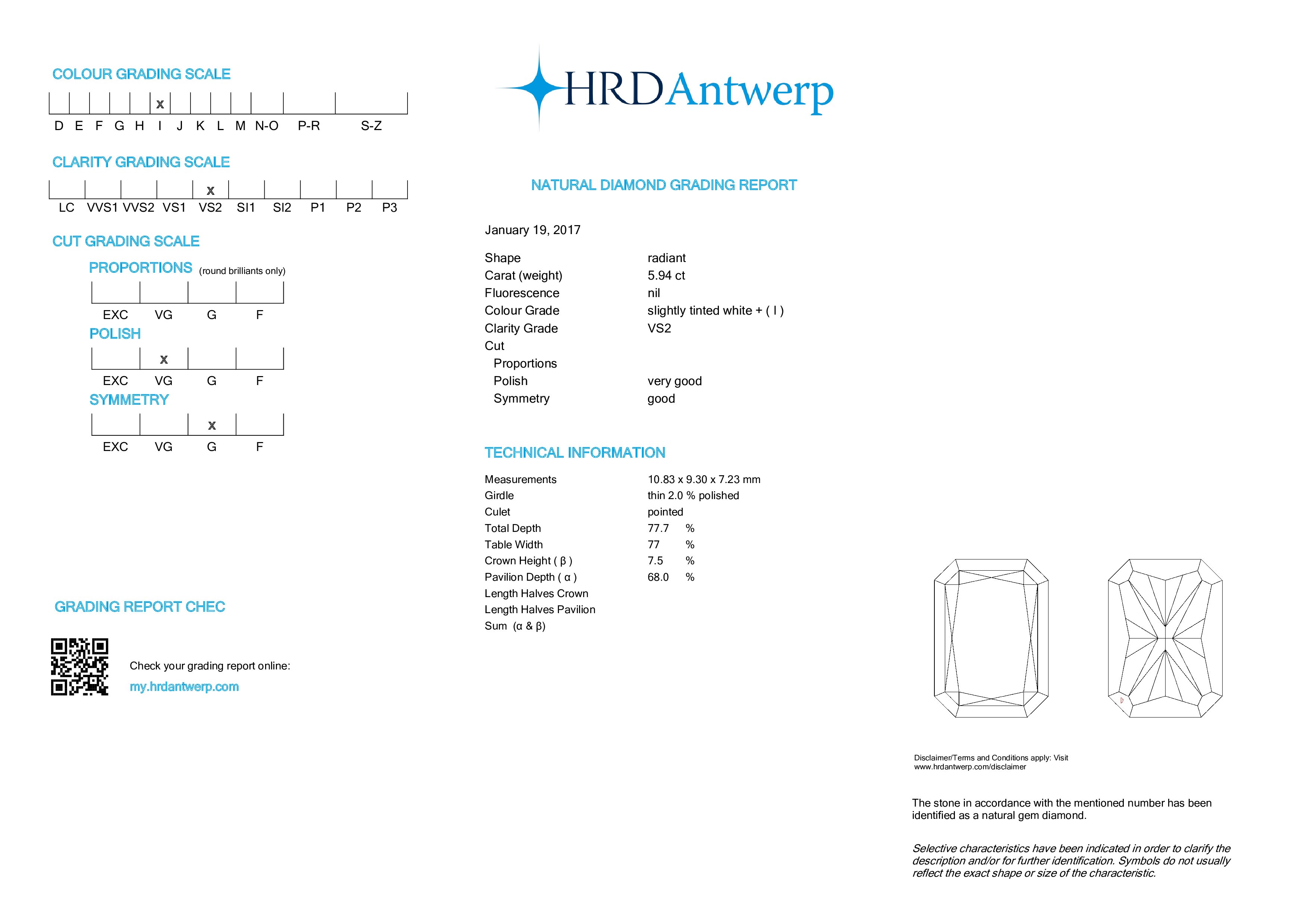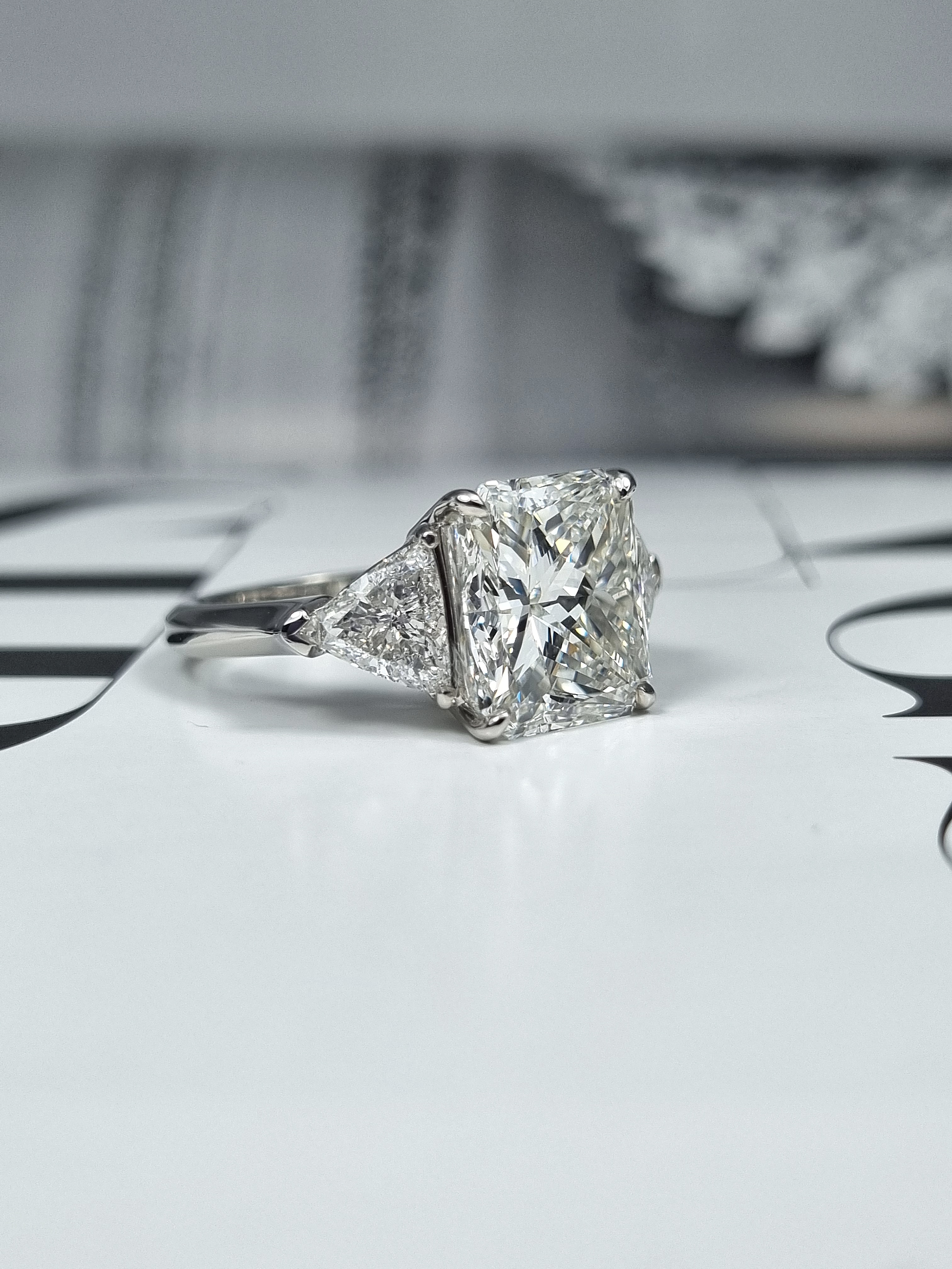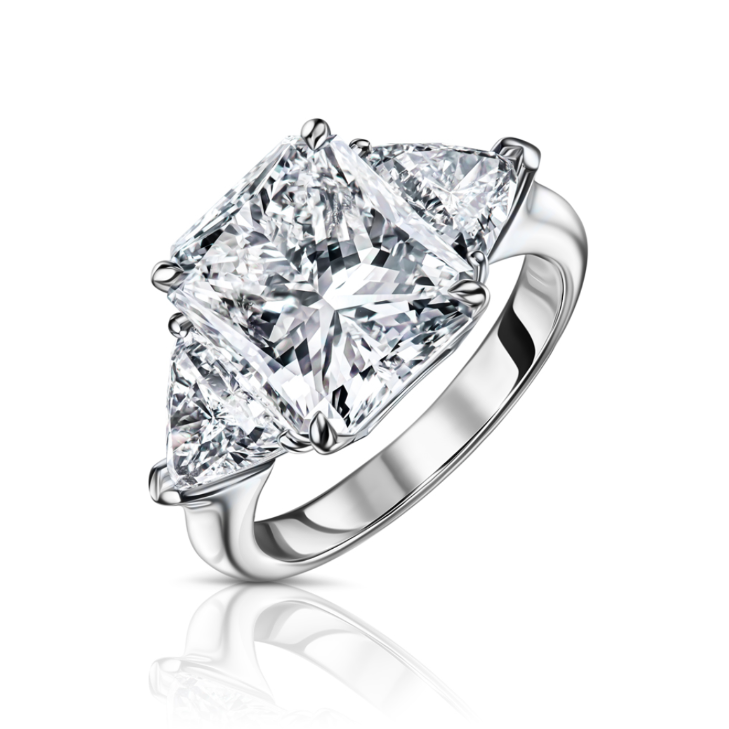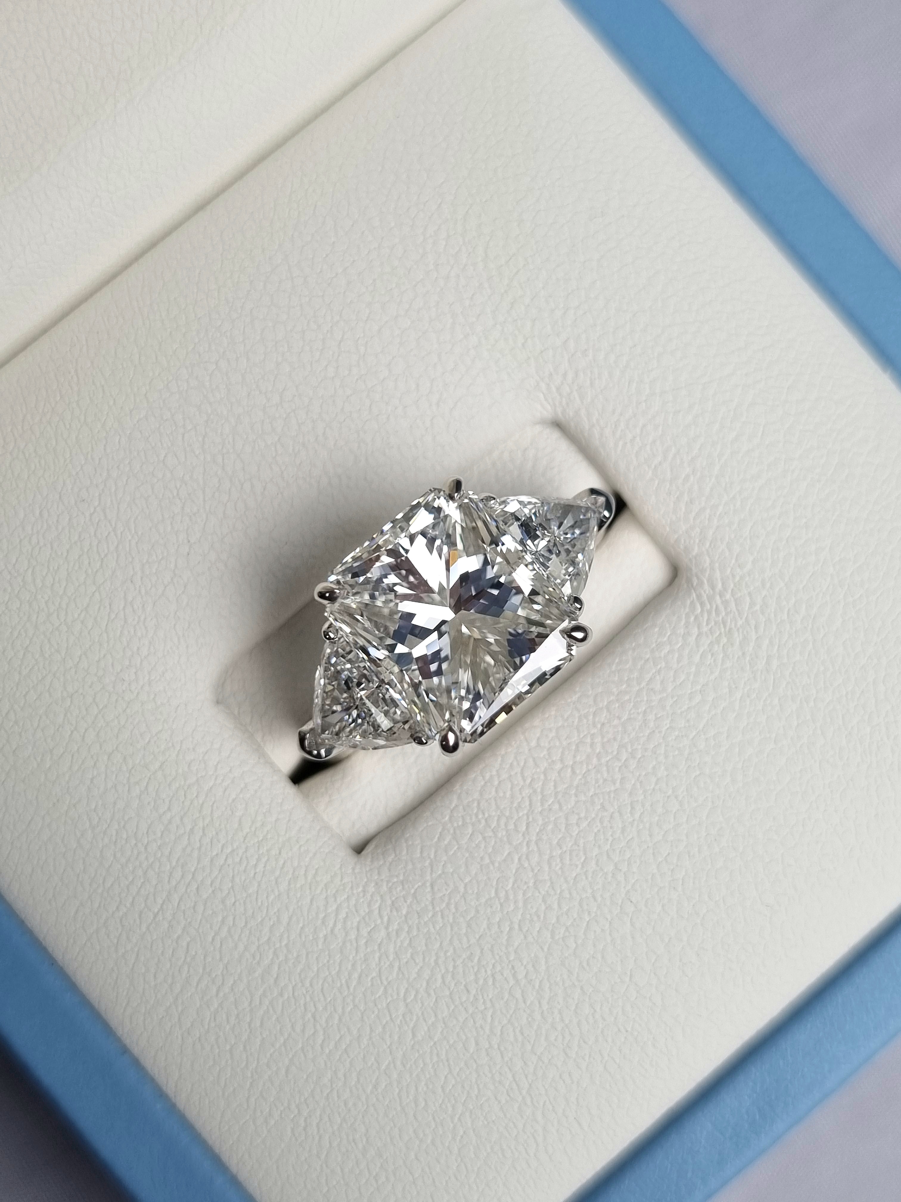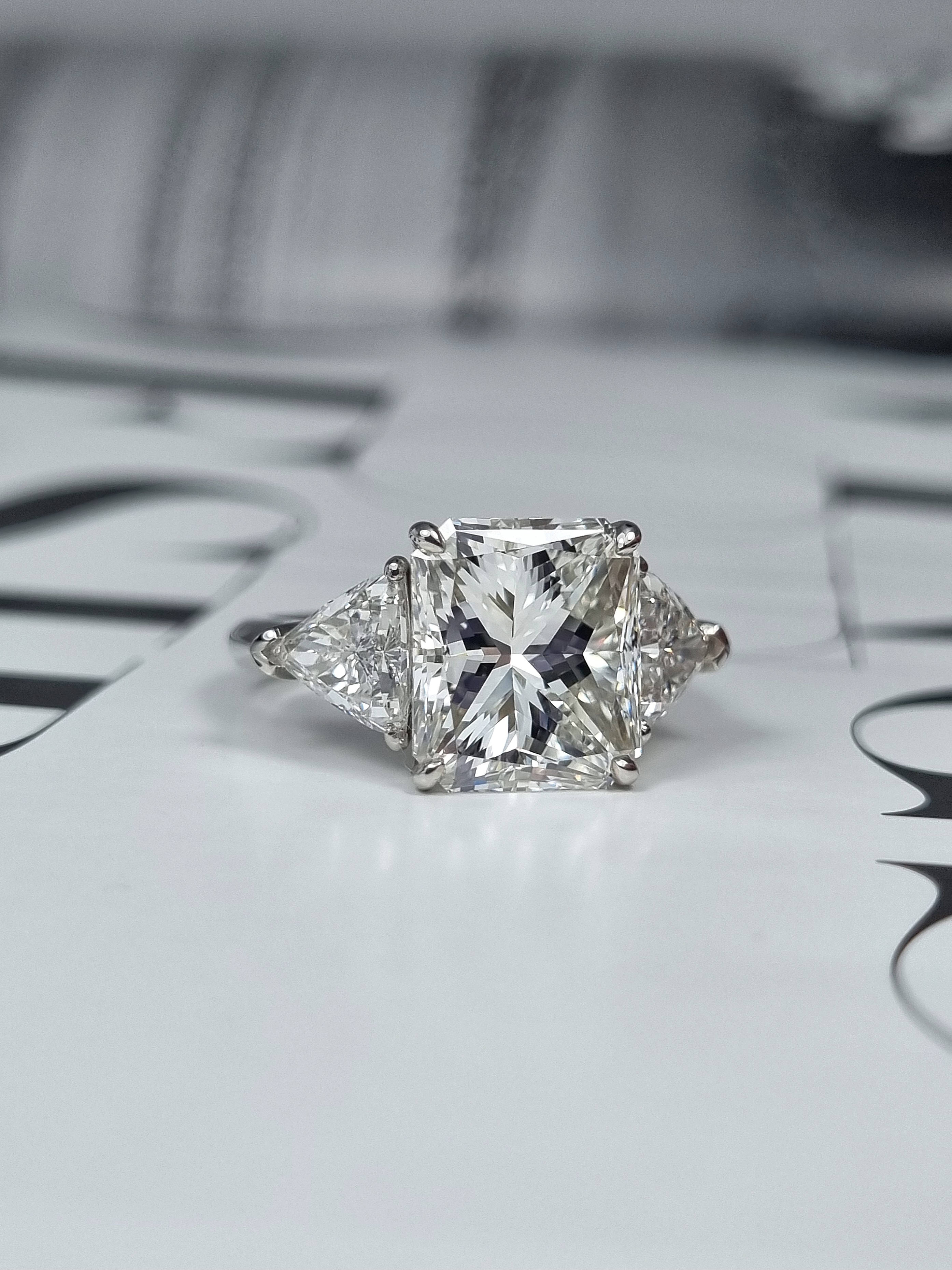 Кольцо, выполненное из высококачественного белого золота 750°, поражает своей элегантностью и изяществом. Центральный бриллиант весом 5,94 ct, имеющий характеристики I/VS2, является настоящим украшением этого шедевра. Боковые бриллианты общим весом 1,75 ct, классифицированные как G/VS+, добавляют дополнительный блеск и роскошь этому изделию.