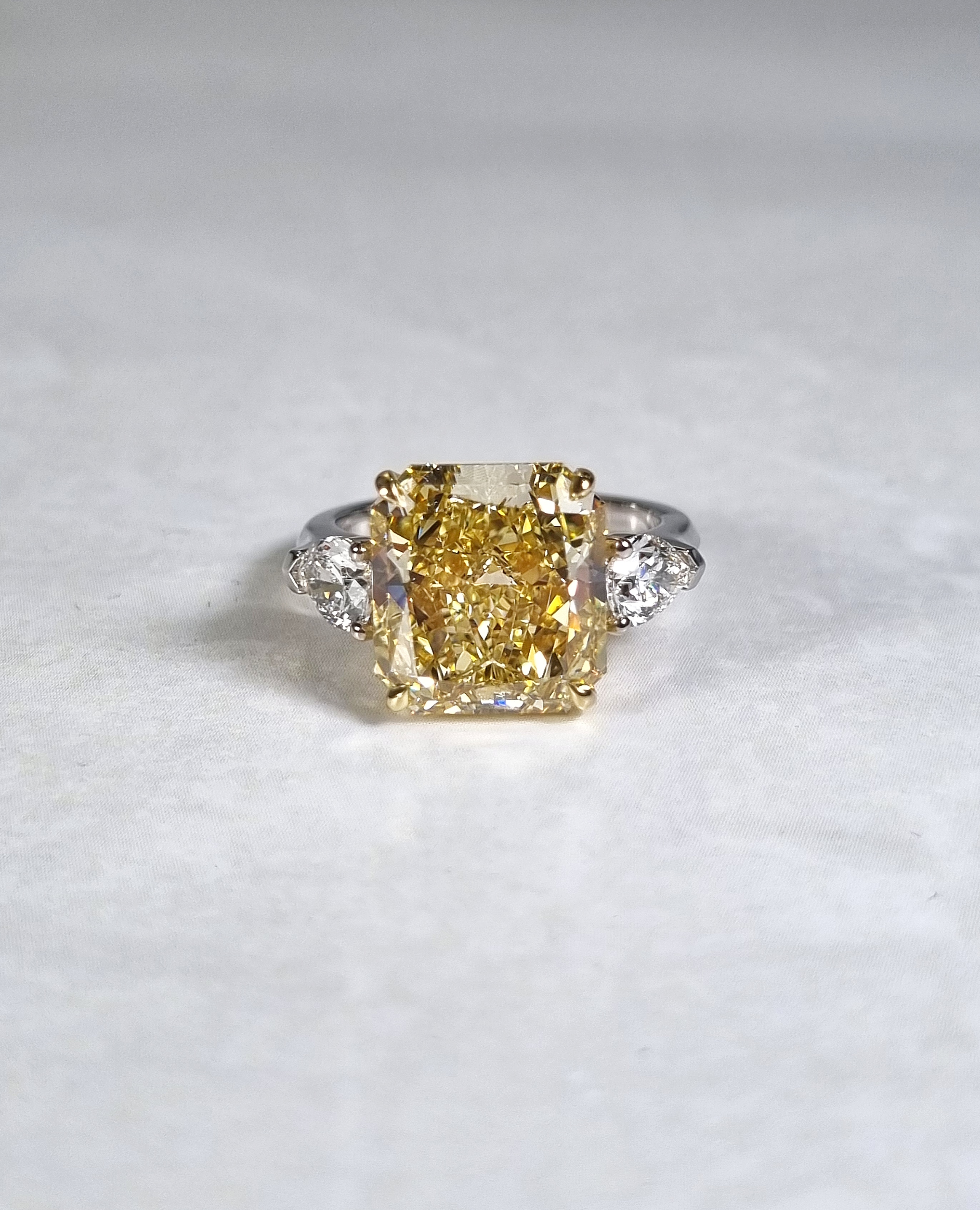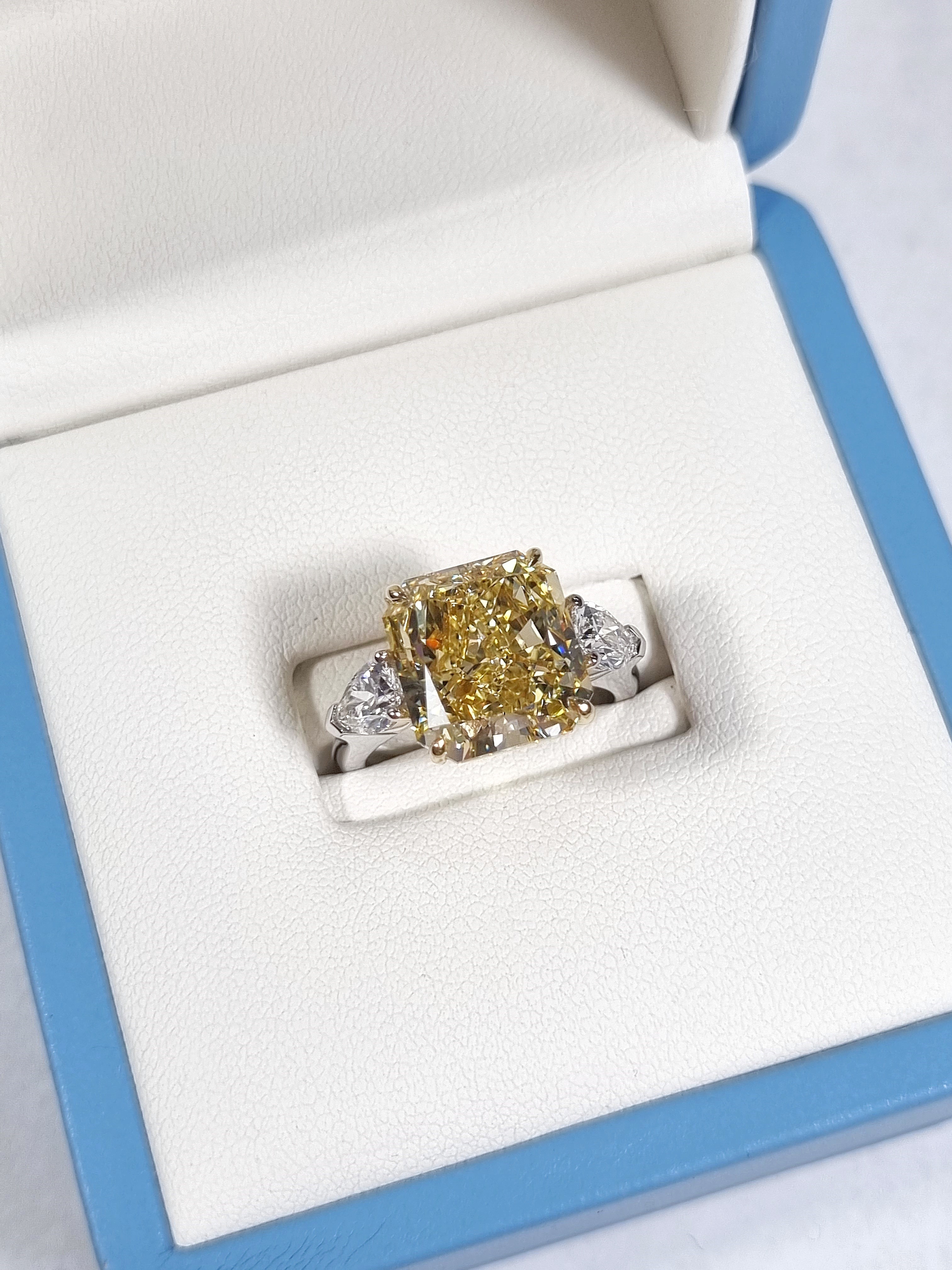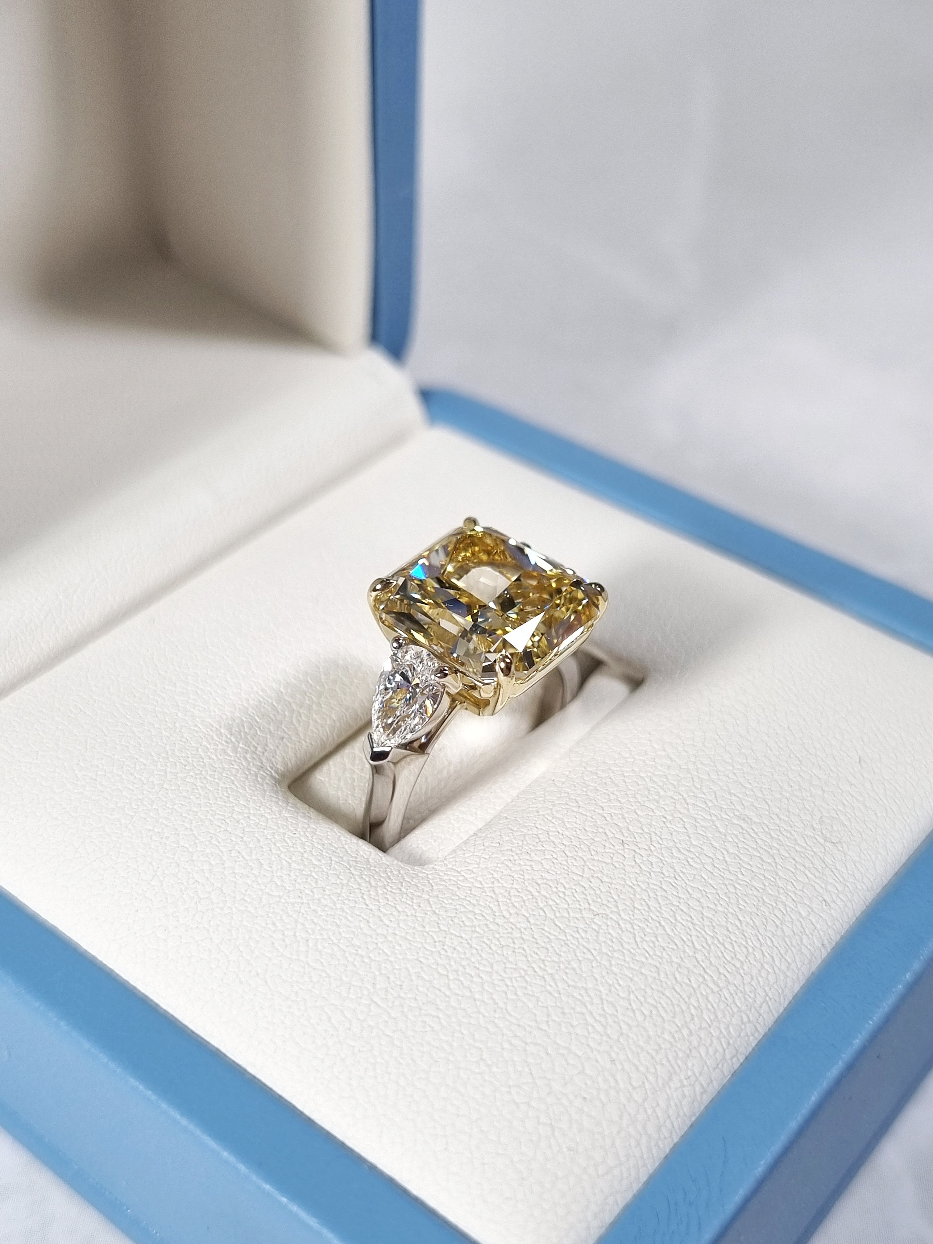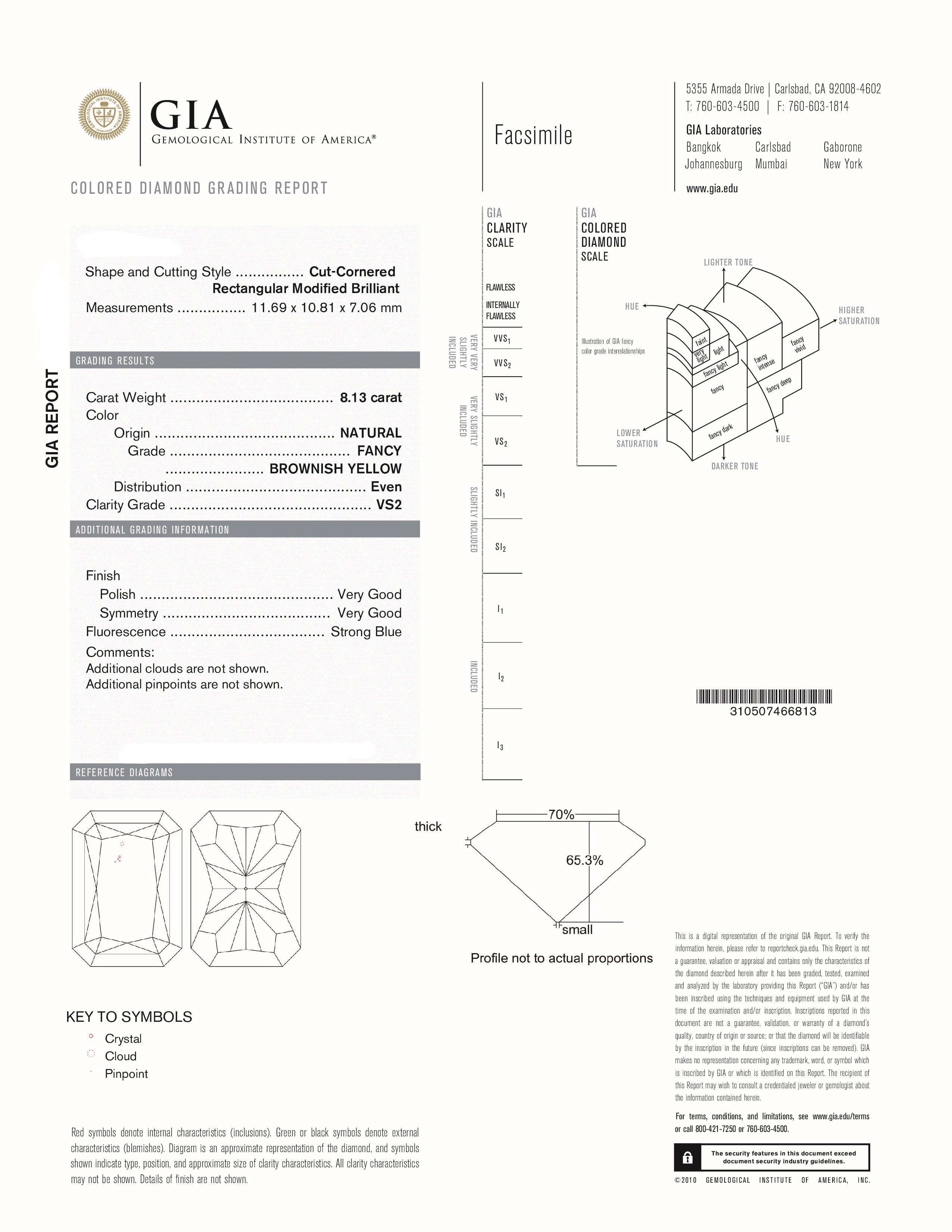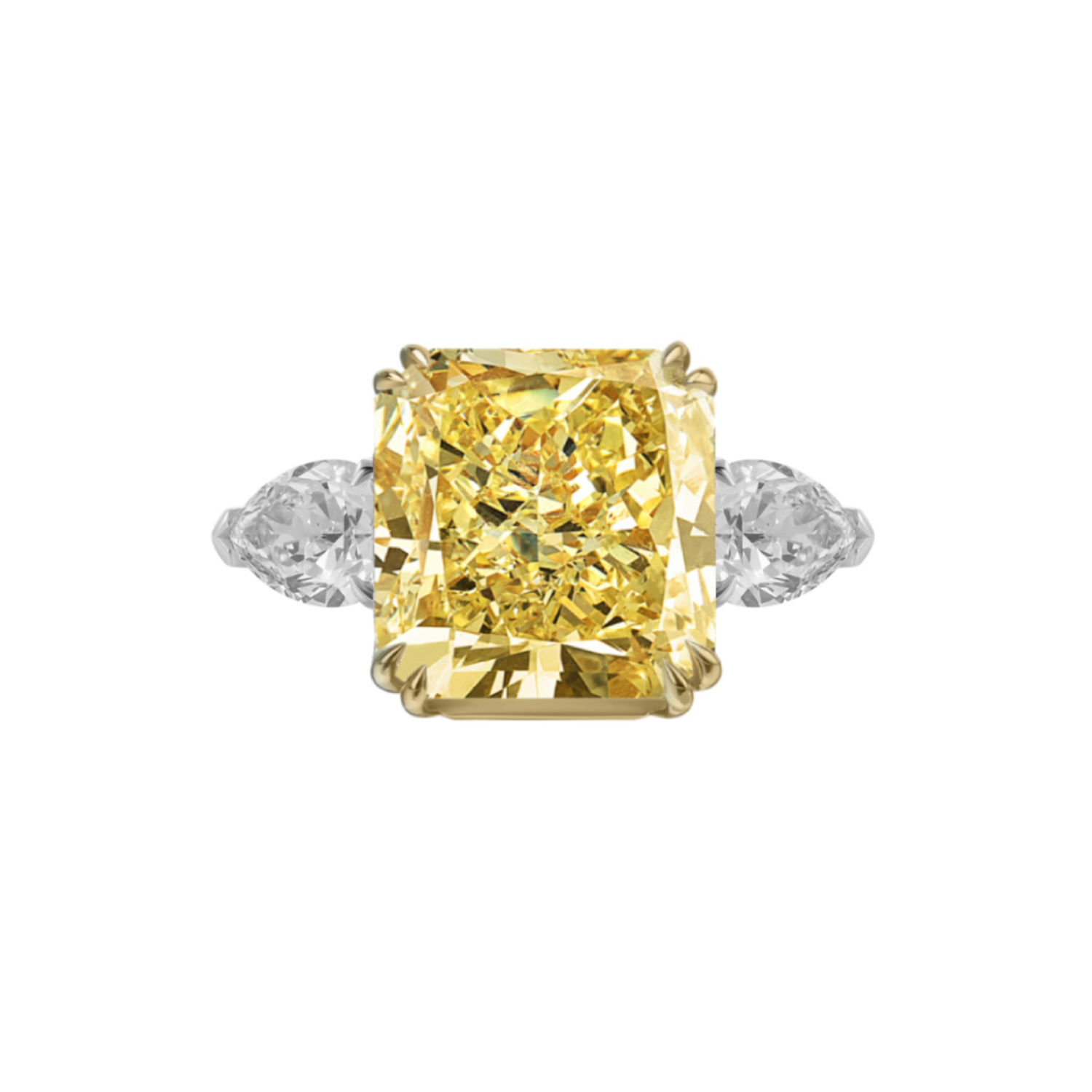 Кольцо изготовлено из высококачественного белого золота 750°, что обеспечивает ему долговечность и непревзойденную элегантность. Центральный бриллиант весом 8,13 ct. обладает уникальным оттенком Fancy Brownish Yellow и классифицируется как VS2 по системе GIA. Этот камень не только поражает своей величиной, но и демонстрирует исключительную чистоту и блеск.