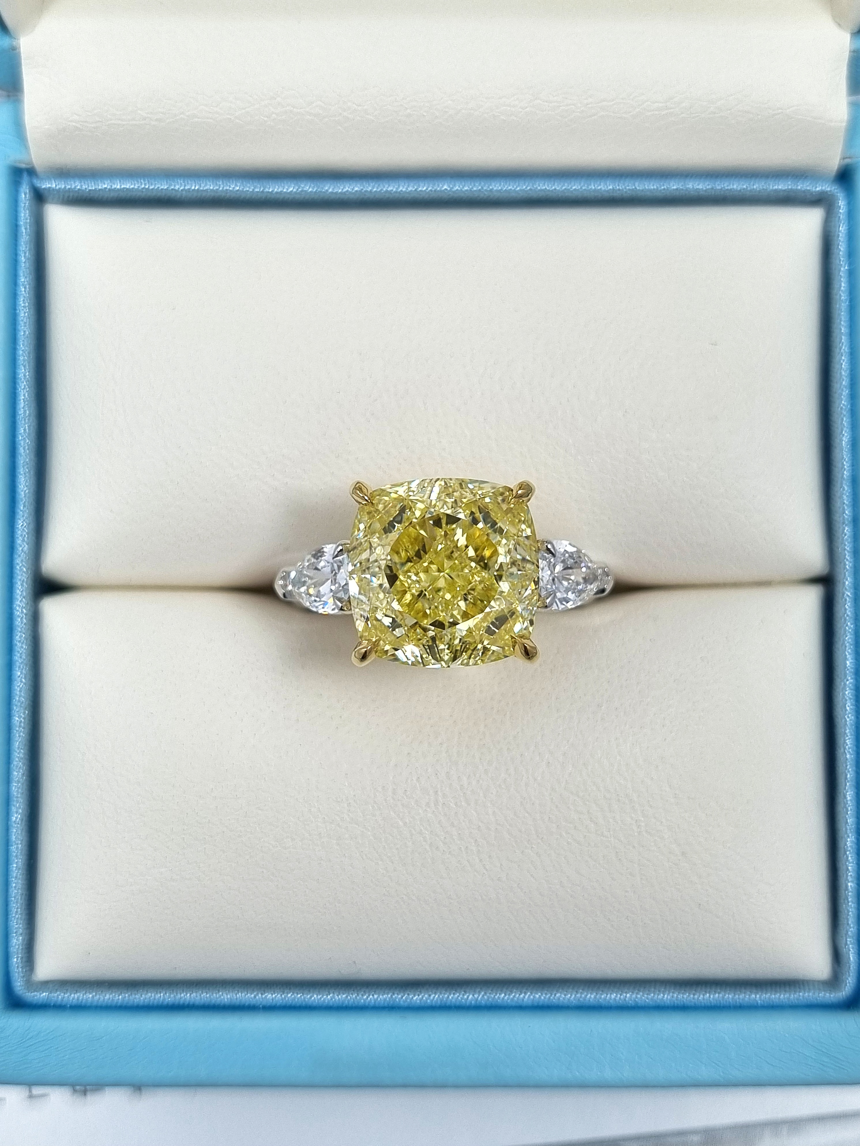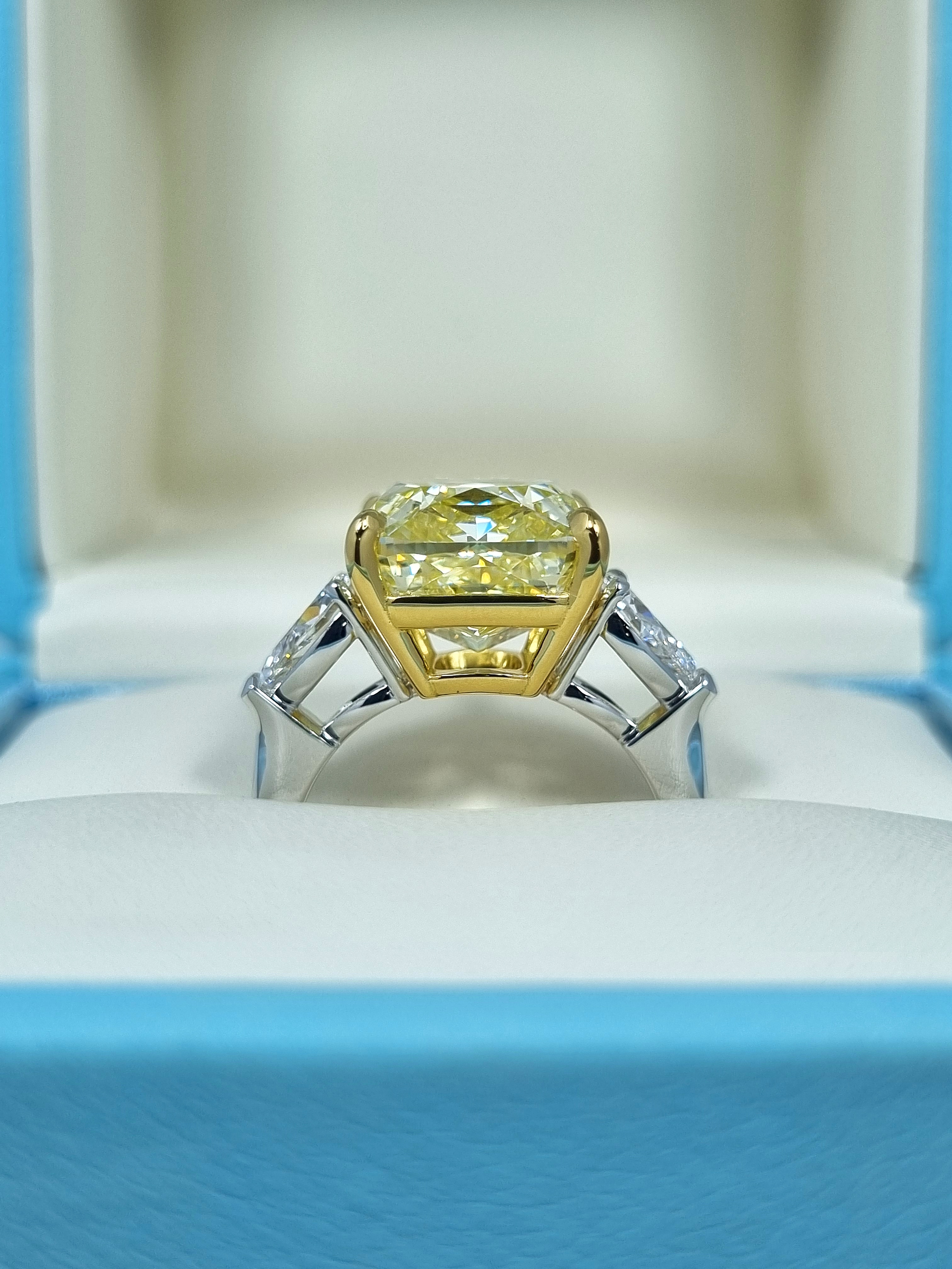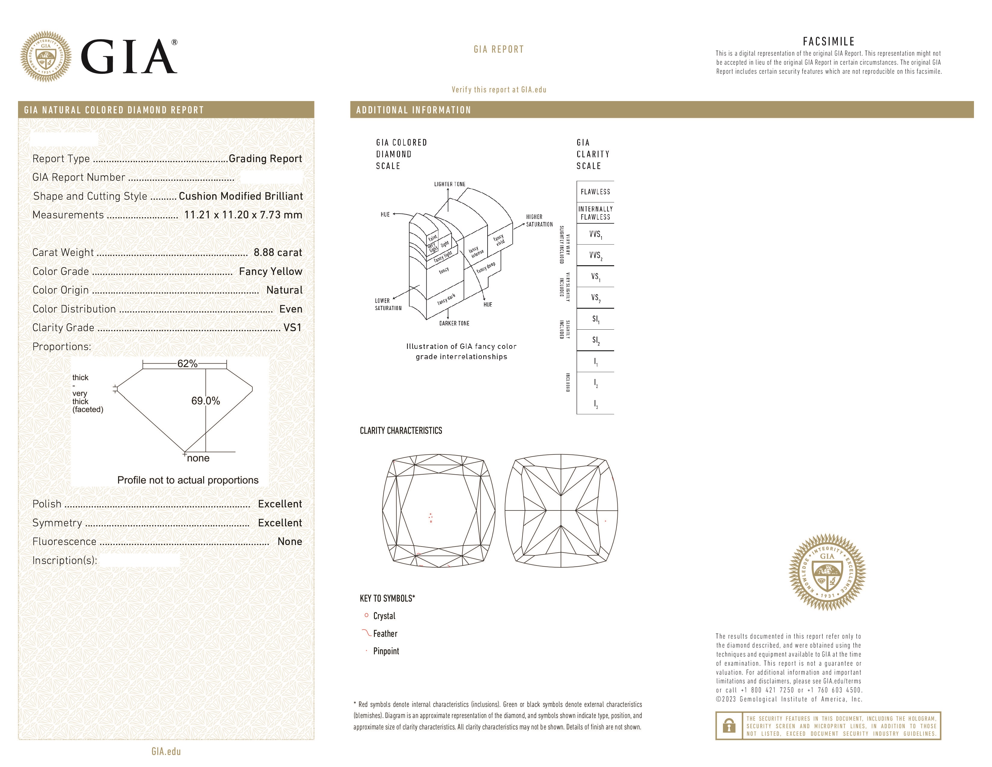 Вставка Центральный бриллиант 8,88 сt. Fancy Yellow/VS1 (Lucky Number); 2 боковых бриллианта общей массой 0,87 ct. D/Internally Flawless
