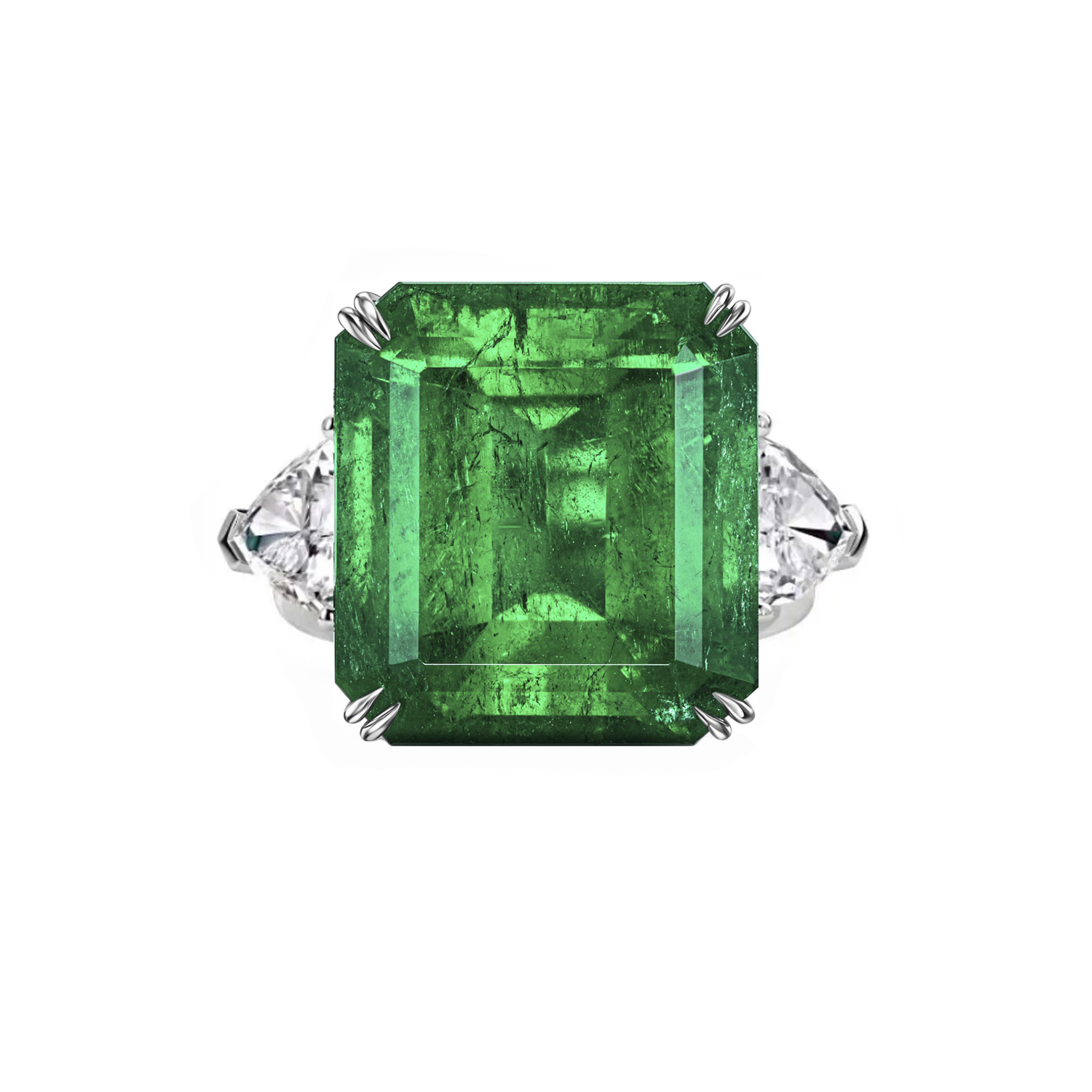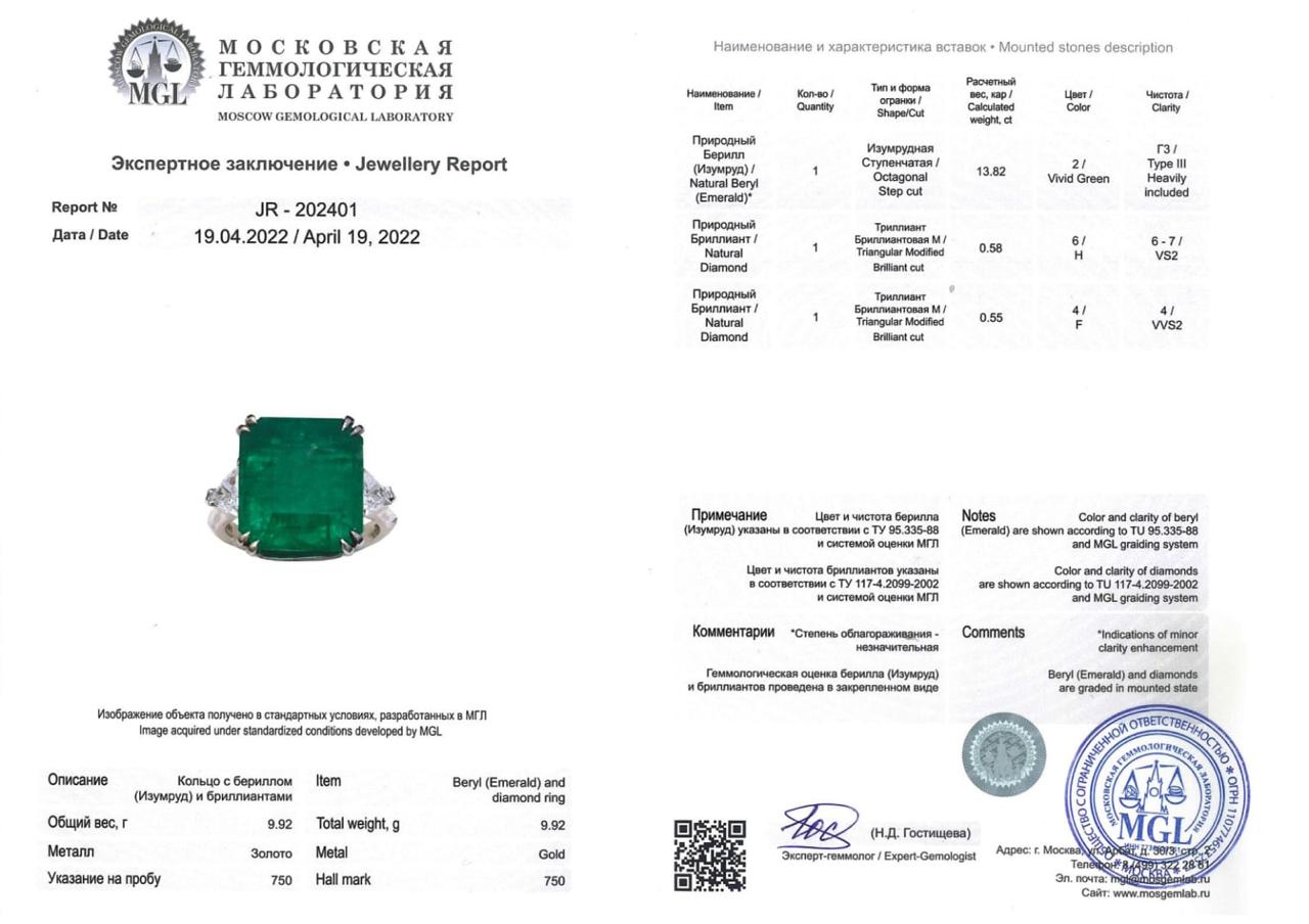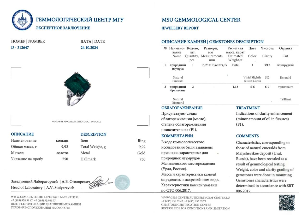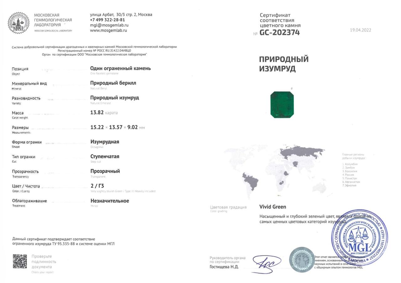 Вставка Изумруд 13,82 ct. Vivid Green (Ural), 2 бриллианта общей массой 1,13 сt., F-H/VVS2-VS2