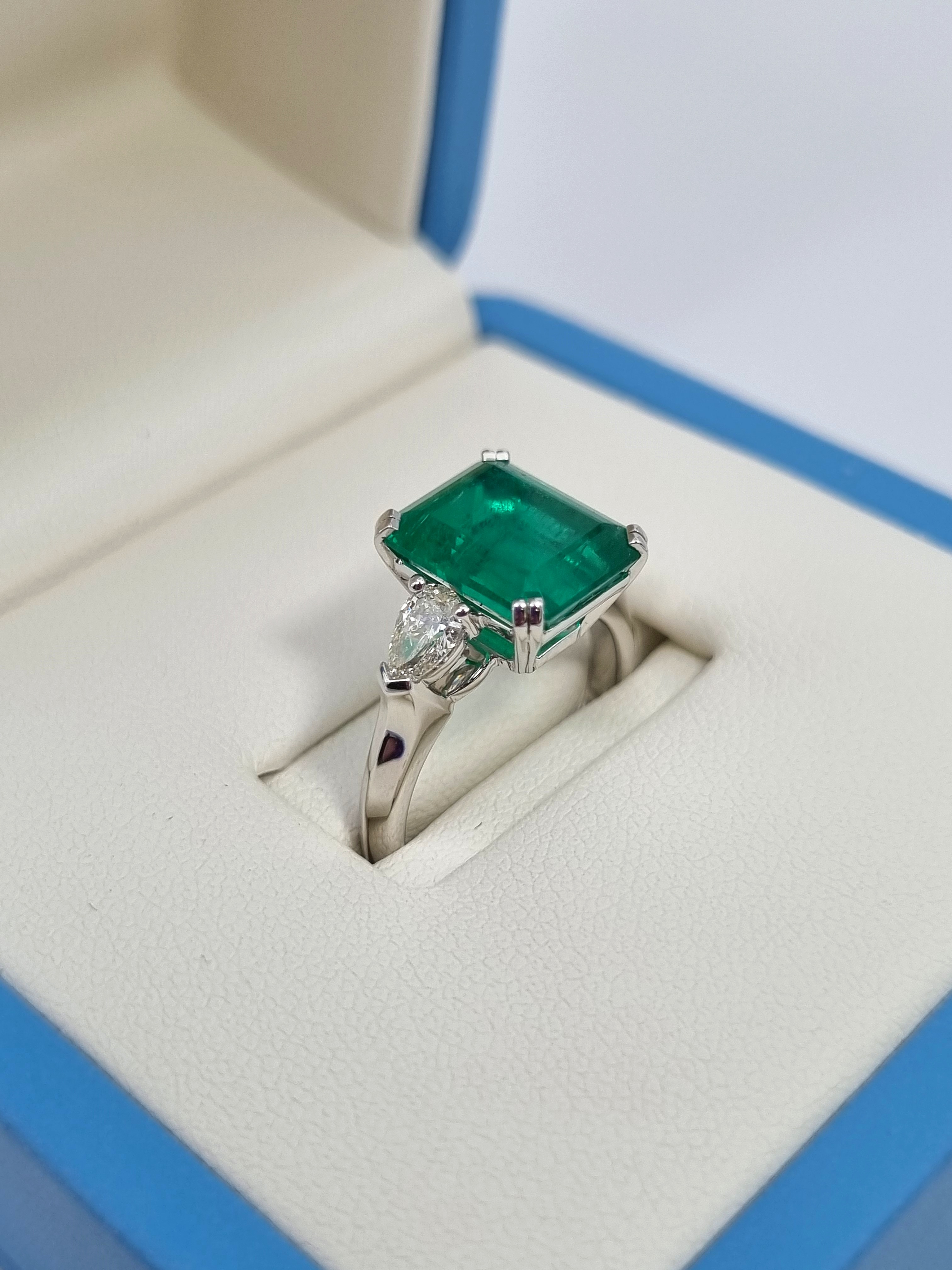 Кольцо, представленное в нашем ассортименте, является настоящим произведением искусства. Оно выполнено из высококачественного белого золота 750 пробы, что обеспечивает ему долговечность и изящество. Главной "изюминкой" этого изделия является изумруд весом 3,90 карата, который поражает своей глубокой, насыщенной зеленой окраской. Этот камень, происходящий из Колумбии, обладает сильным блеском и идеальной прозрачностью, что делает его поистине уникальным.
