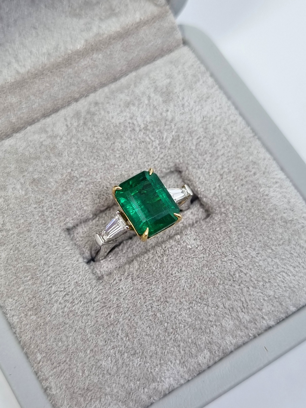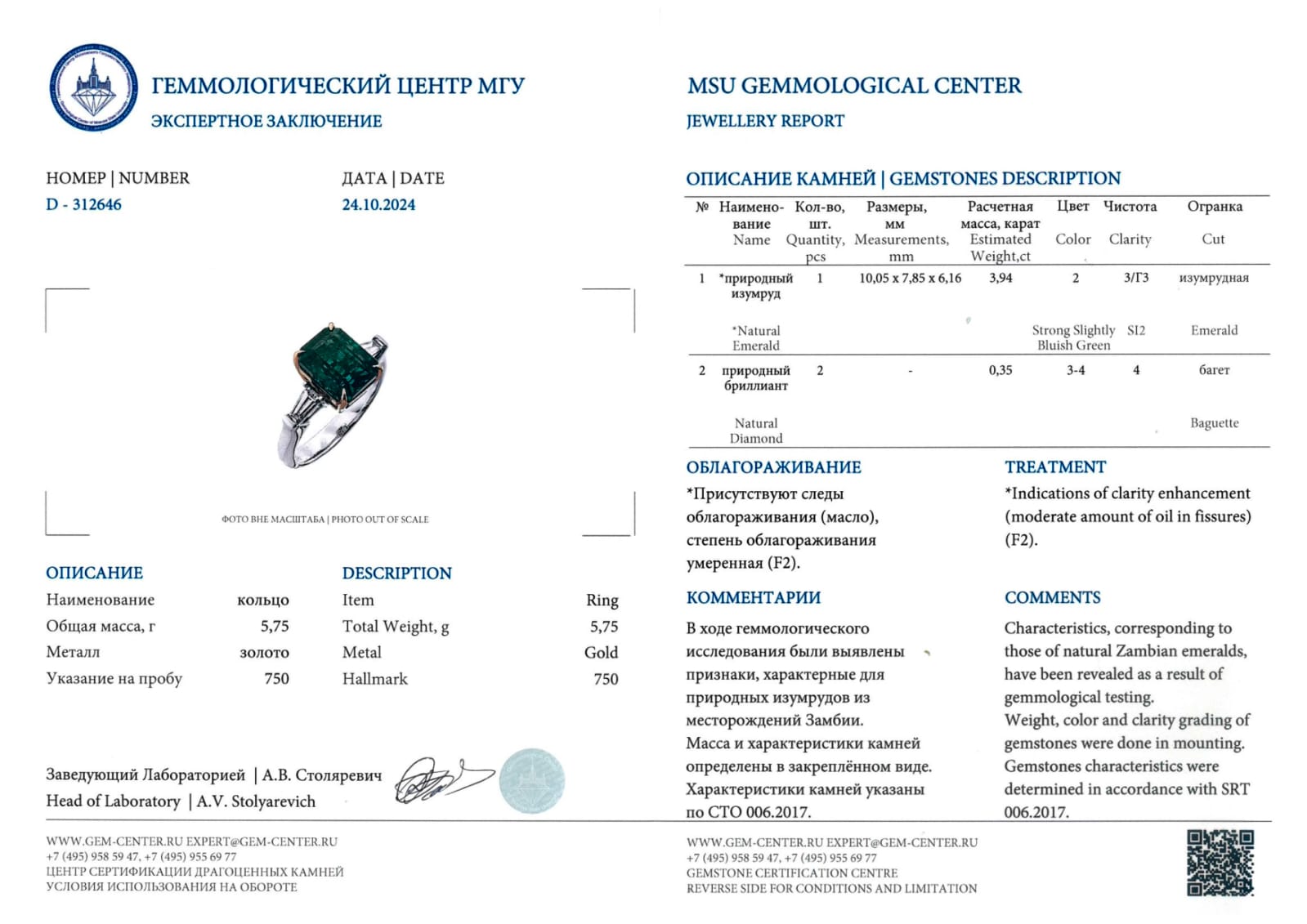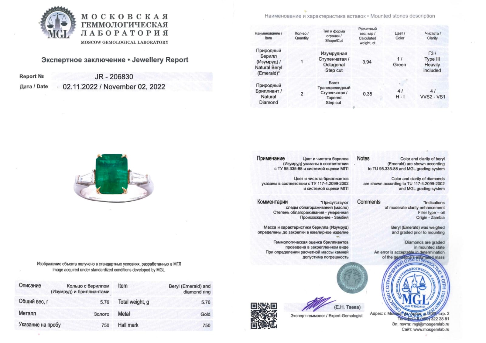 Вставка Изумруд 3,94 ct. Green (Zambia); боковые бриллианты общей массой 0,35 ct. Fine White/VS+