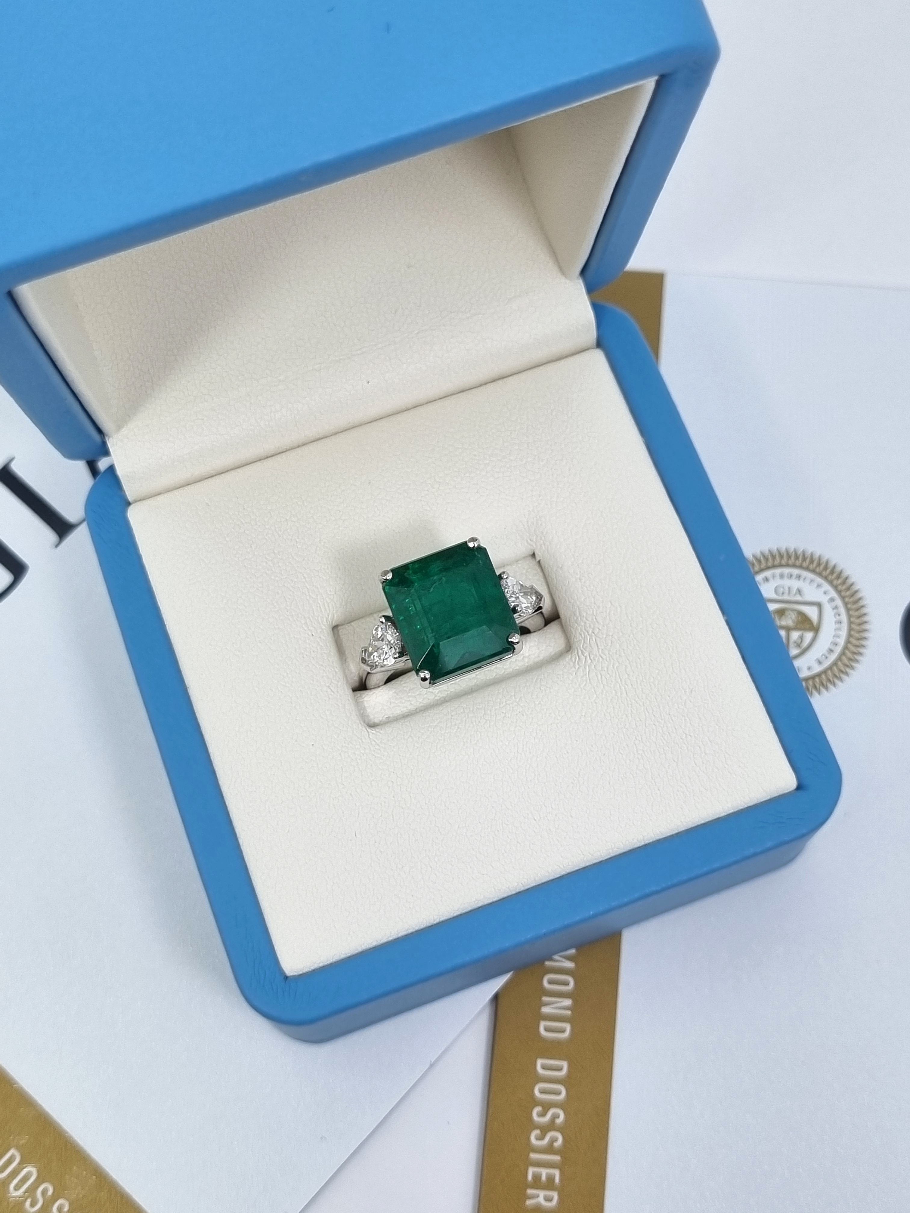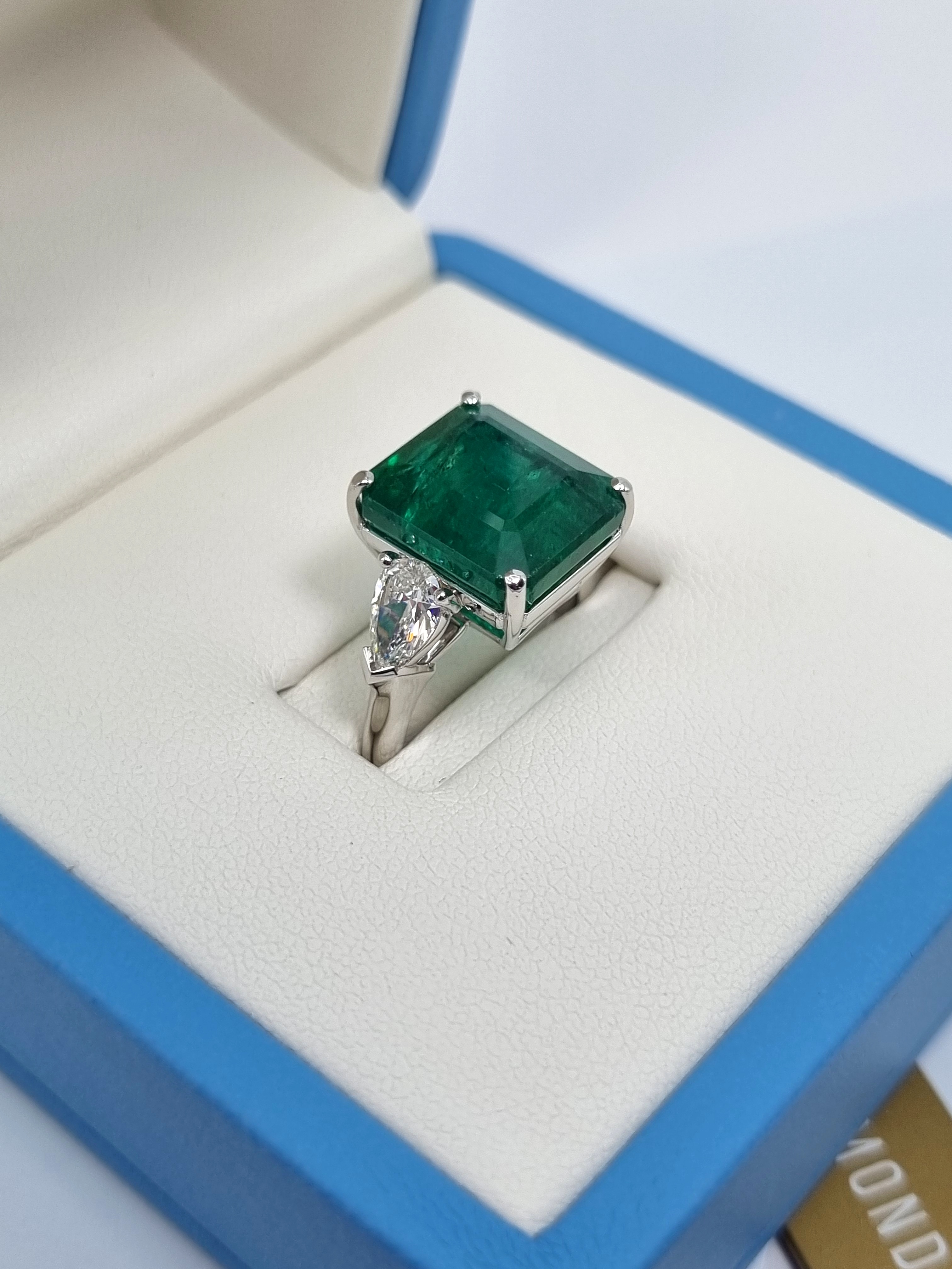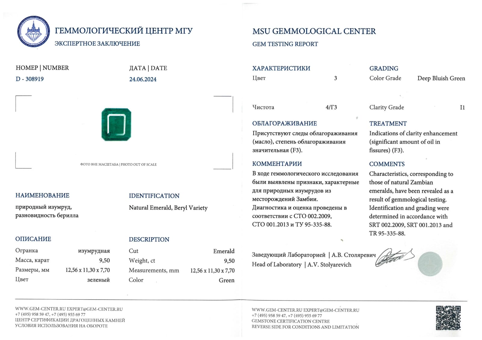 Вставка Изумруд 9,50 ct. Deep Bluish Green (Zambia); боковые бриллианты общей массой 1,01 ct. H/VS1