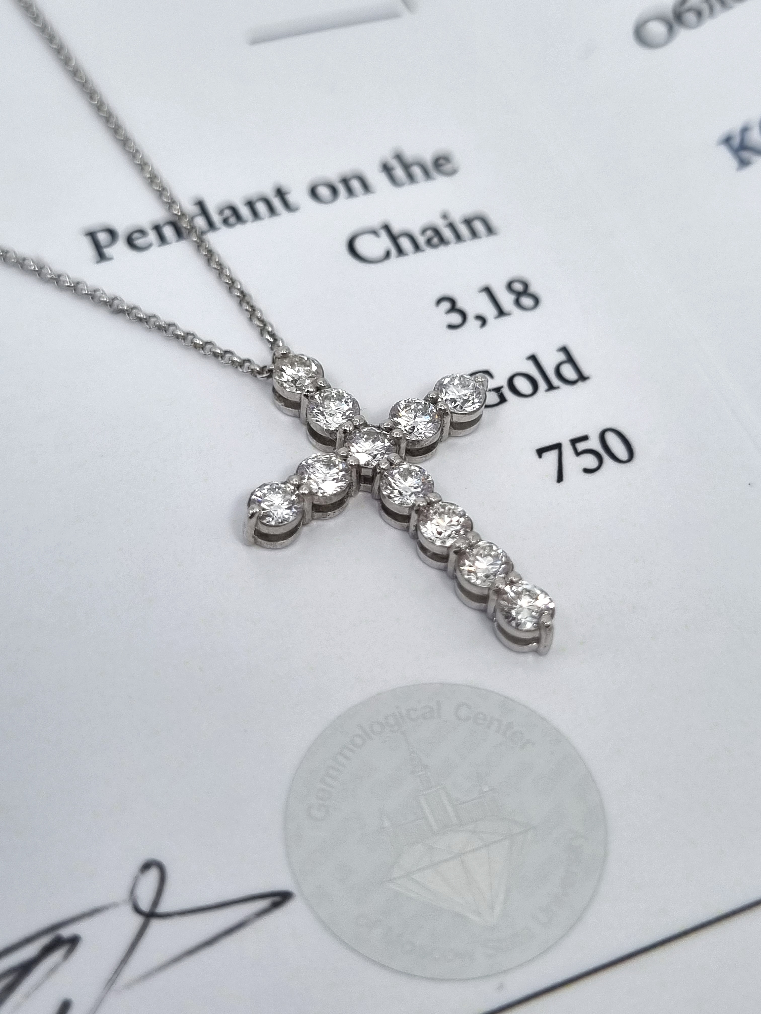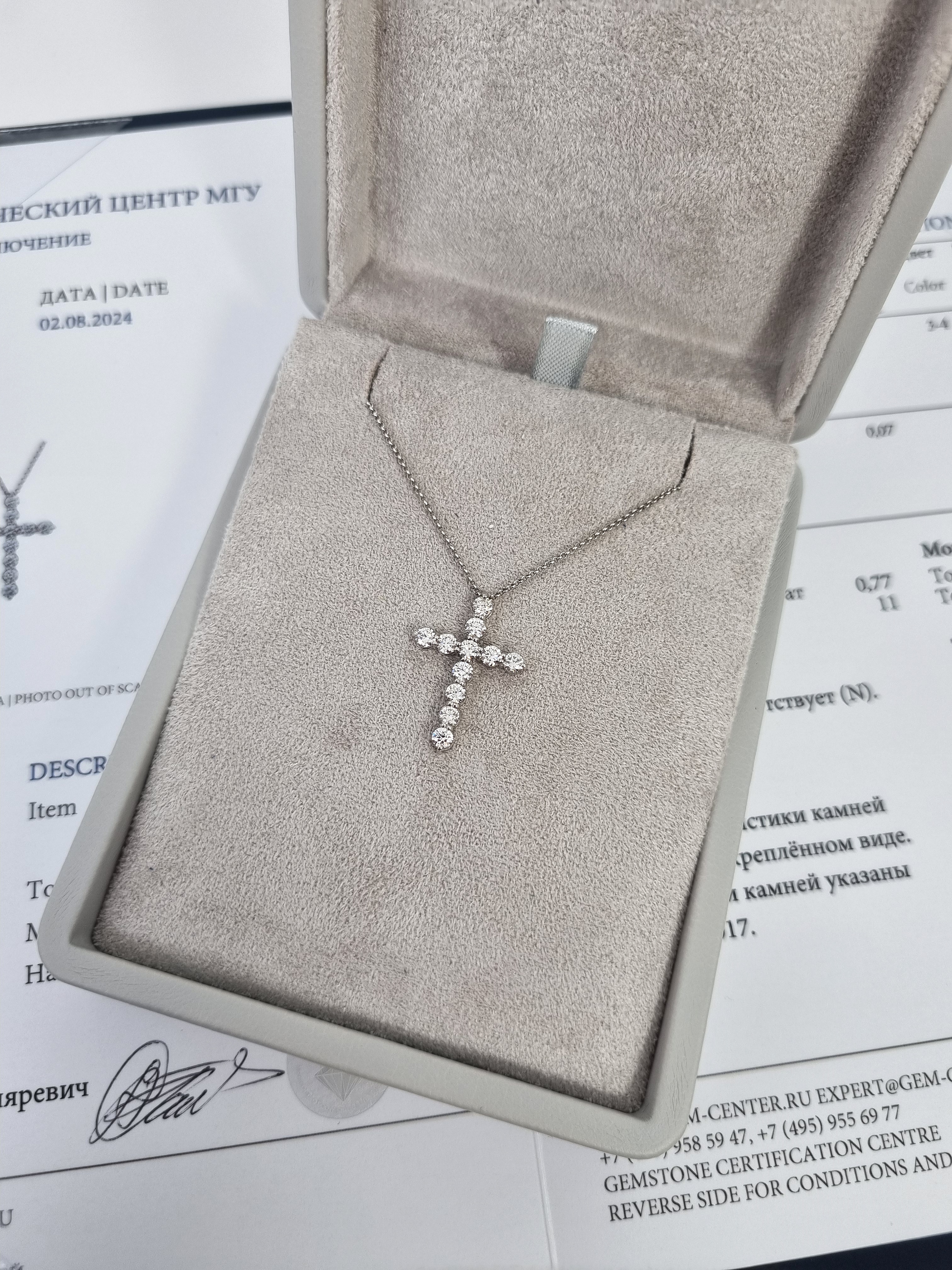 Каждый бриллиант прошел тщательную проверку и получил сертификат от Московского государственного университета, что гарантирует их качество и подлинность. Кроме того, крест поставляется в красивой коробке, а также с полным комплектом документов, подтверждающих его происхождение и качество.