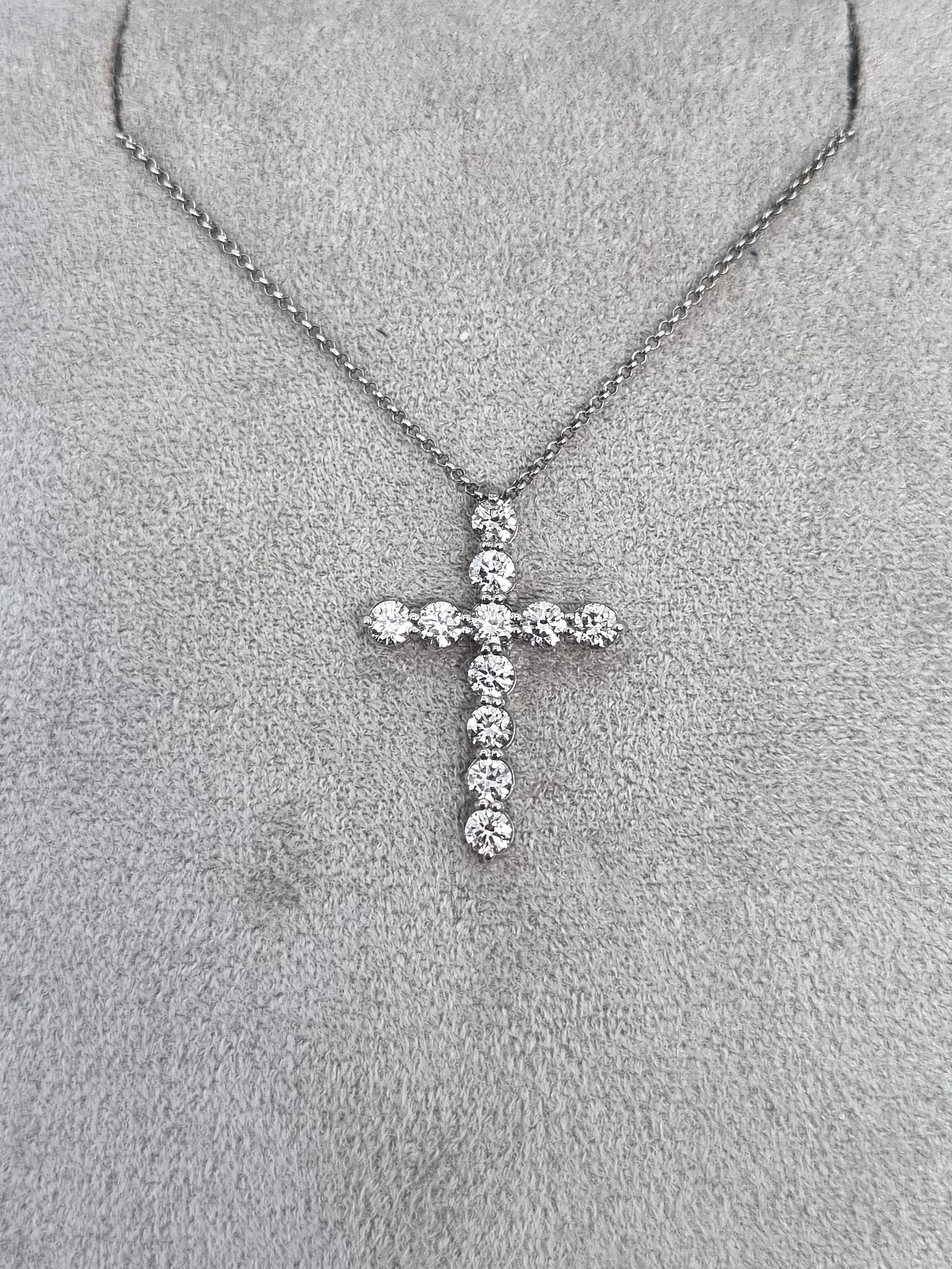 Созданный из белого золота 750°, этот крест поражает своей изысканностью и элегантностью. Его размеры 22 х 16 мм делают его идеальным для повседневного ношения, а также для особых случаев. Но самое главное – это 11 бриллиантов общей массой 0,77 карата, которые сверкают на его поверхности, добавляя изделию неповторимый блеск и роскошь.
