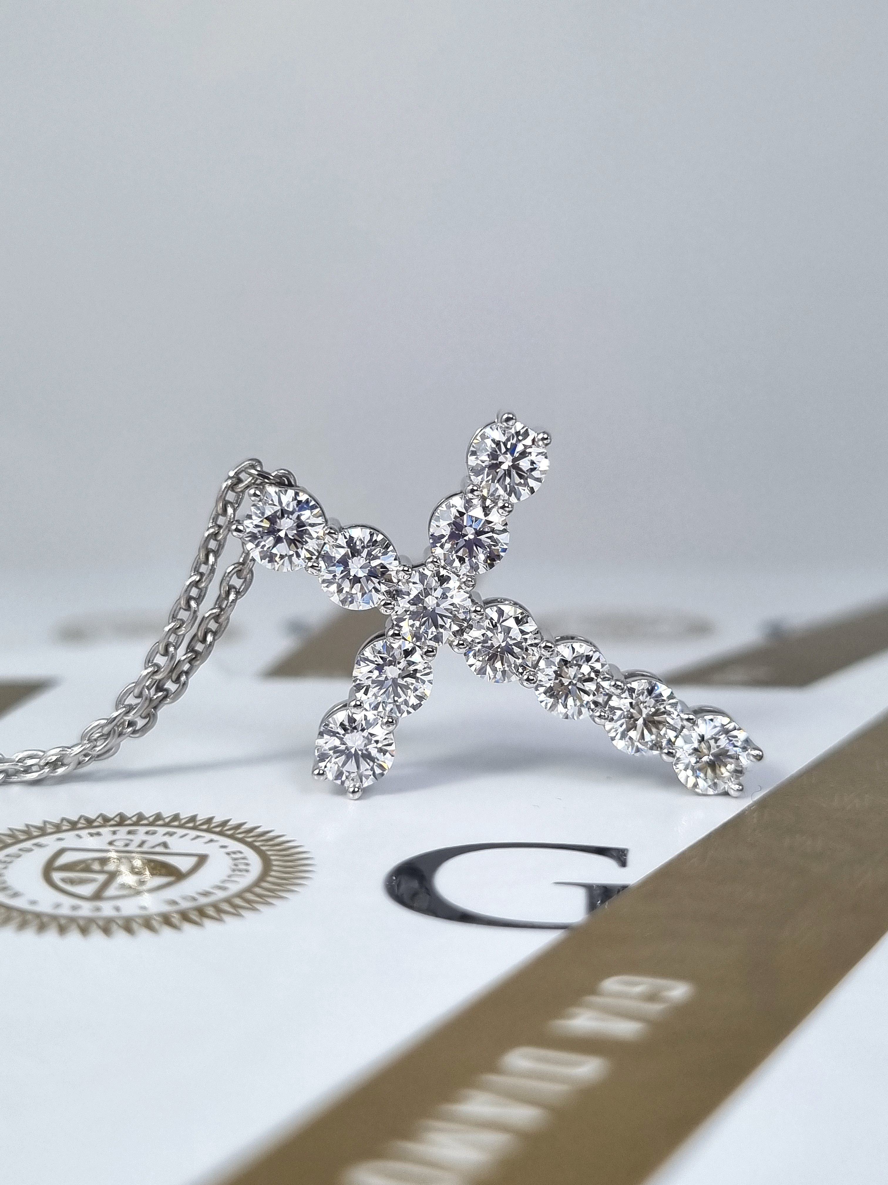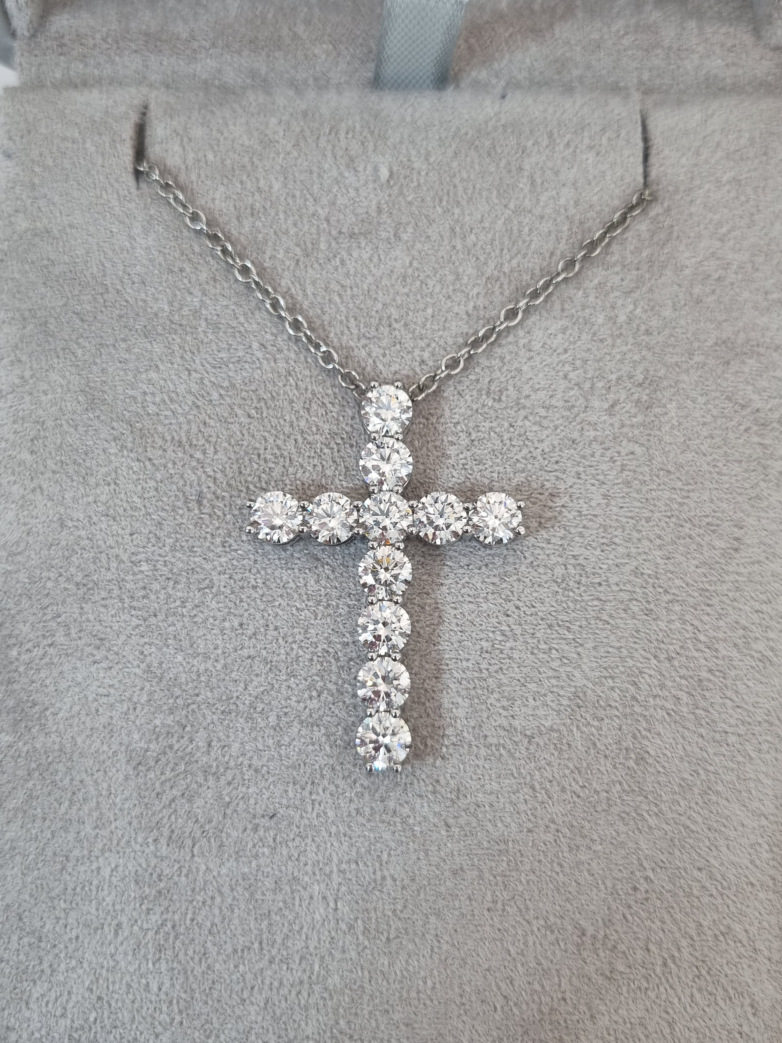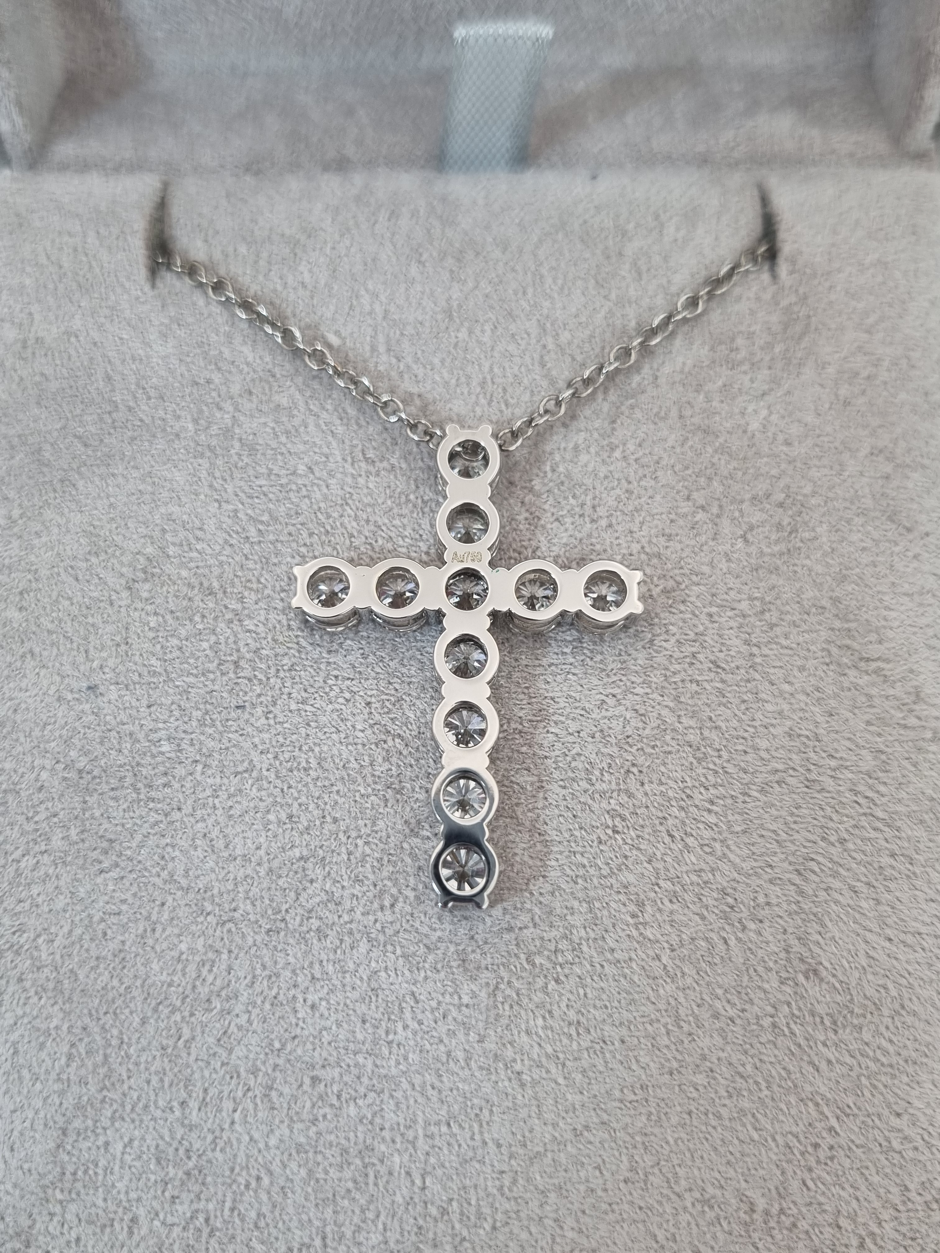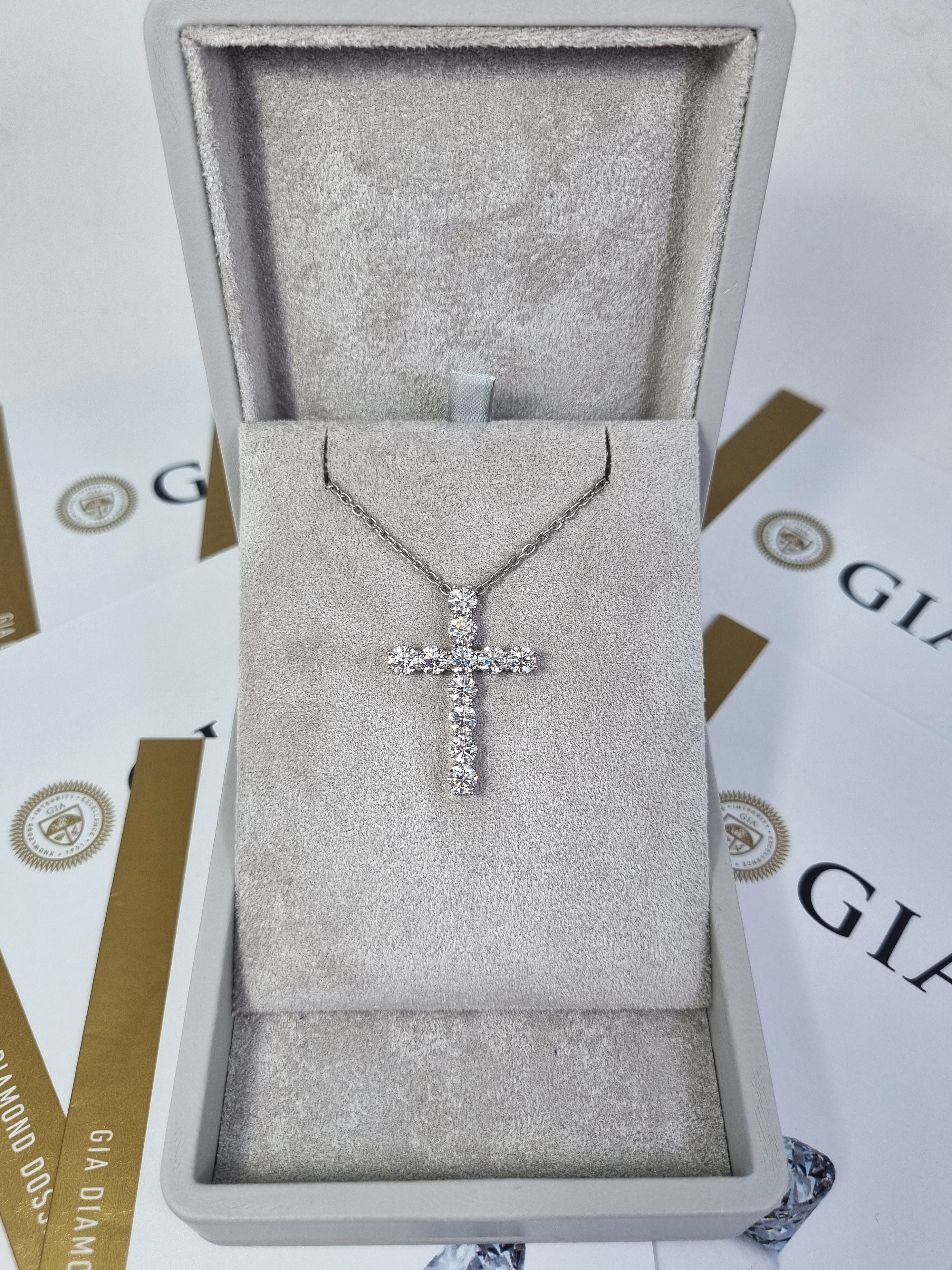Крест изготовлен из высококачественного белого золота 750°, что обеспечивает ему долговечность и устойчивость к коррозии. Длина цепочки составляет 42 см, что позволяет легко и удобно носить его на шее. Особое внимание заслуживает вставка из 11 бриллиантов общей массой 3,54 ct. Каждый из них имеет сертификат GIA, подтверждающий их подлинность и высокое качество.