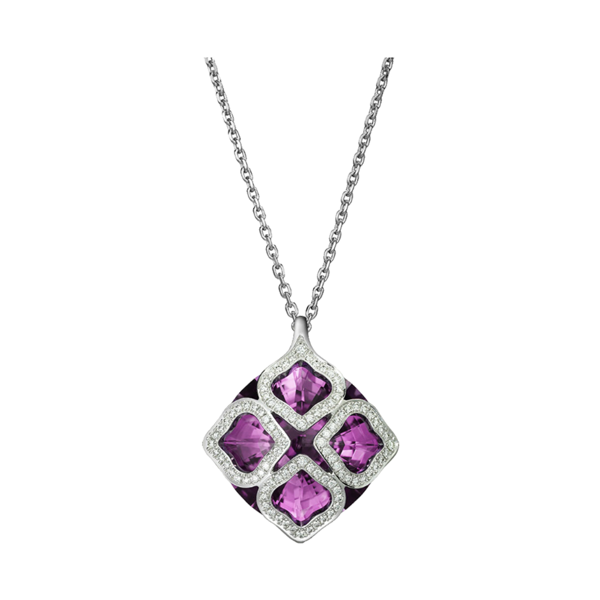 Особое внимание привлекает вставка из аметиста весом 20,00 ct, который придает подвеске уникальный и изысканный вид. Дополнительно украшение украшено 96 бриллиантами общим весом 0,42 ct, что добавляет ему дополнительный блеск и роскошь.