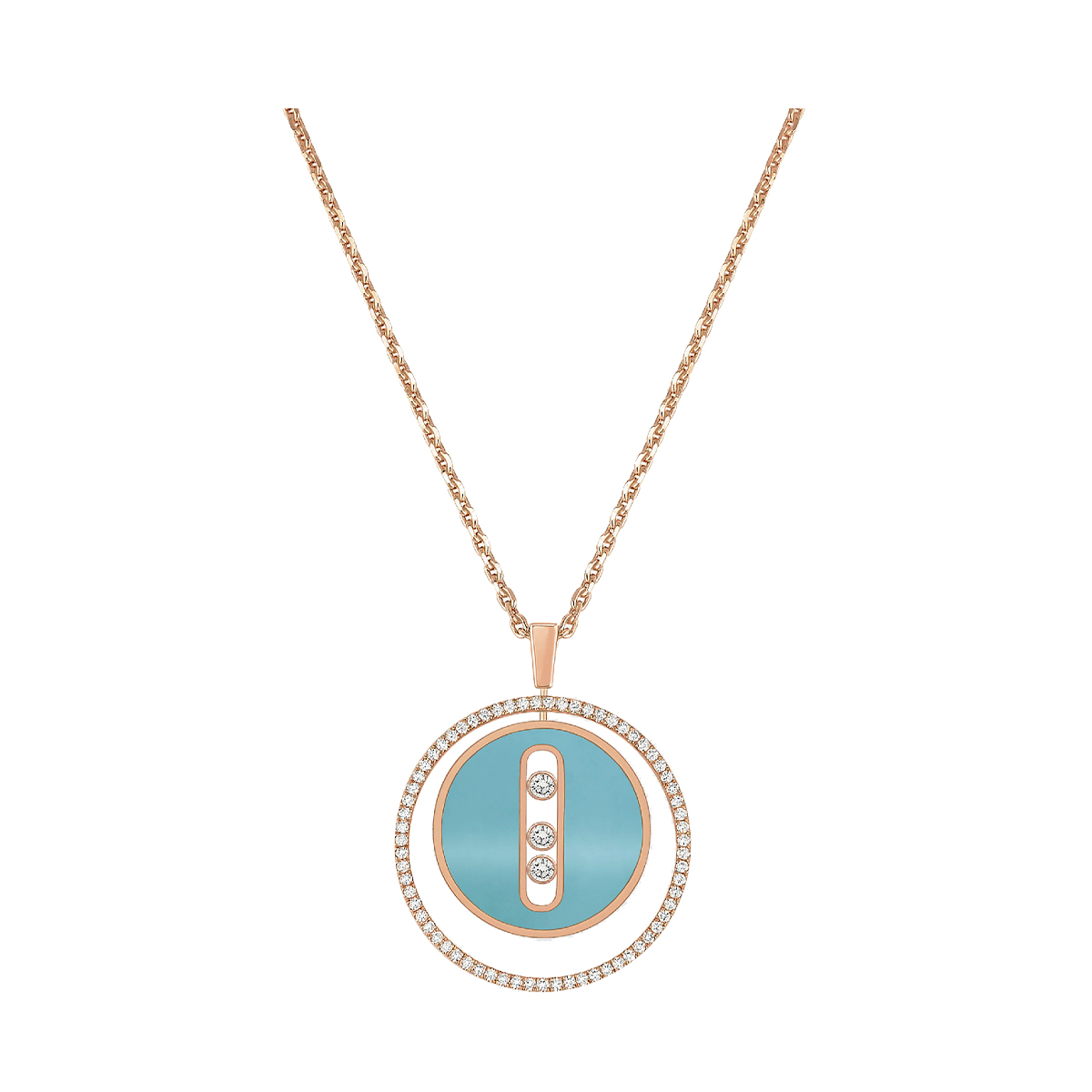 Подвеска Turquoise Lucky Move MM поражает своей изысканностью и элегантностью. Длина цепи составляет 69 см, благодаря раздвижной системе она легко подстраивается под любую шею. Диаметр элемента – 25 мм, что делает его заметным, но не слишком громоздким. Материал – розовое золото 750 пробы, которое не только добавляет изделию роскоши, но и гарантирует его долговечность.