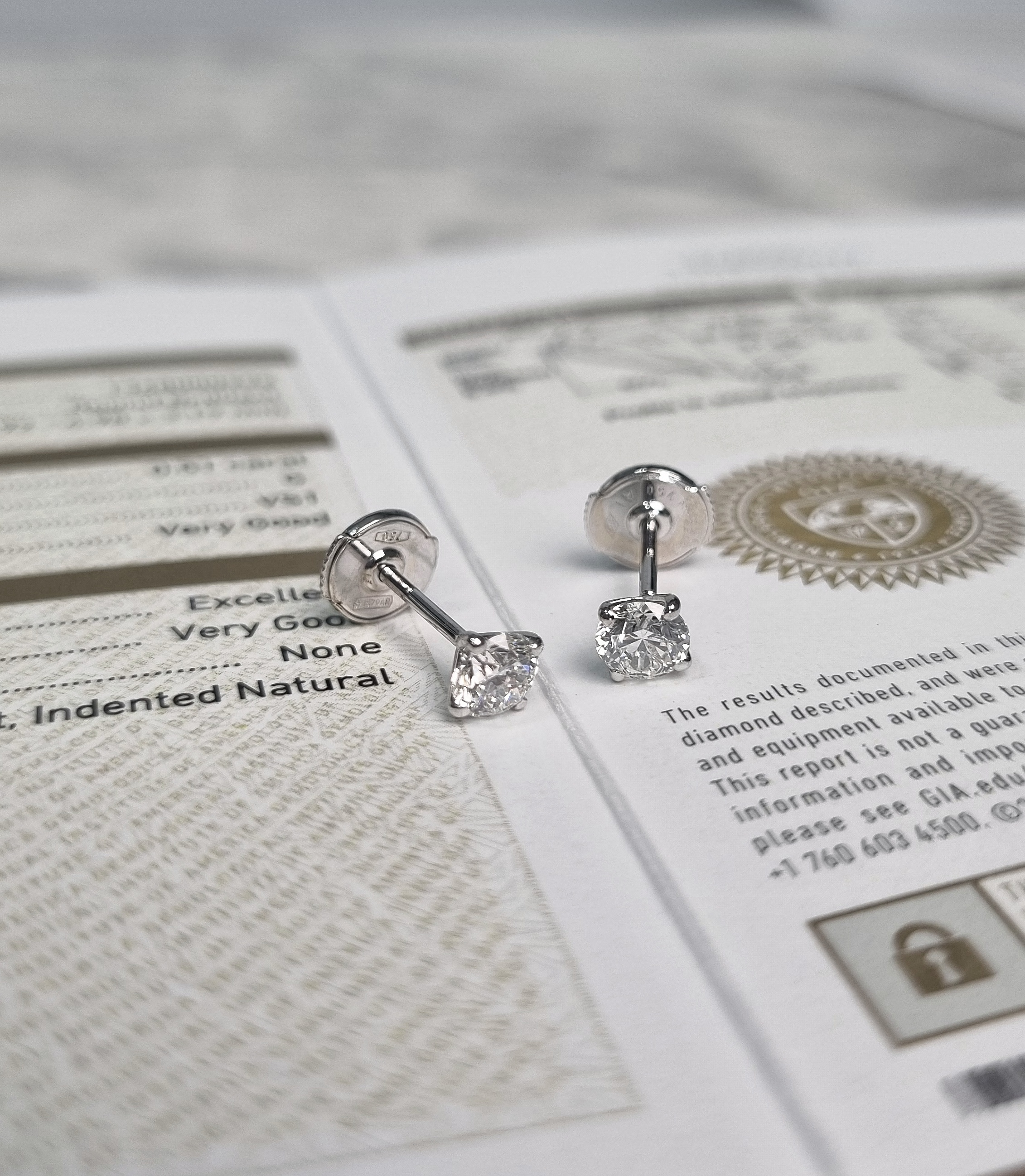 Эти изделия не просто украшения, а настоящие произведения искусства, созданные из высококачественного белого золота 750°. Их главное украшение – два бриллианта по 0,51 карата каждый, имеющие сертификат GIA, что гарантирует их подлинность и высокое качество. Бриллианты имеют форму круга и обладают непревзойденным блеском благодаря своей чистоте G/VS1.