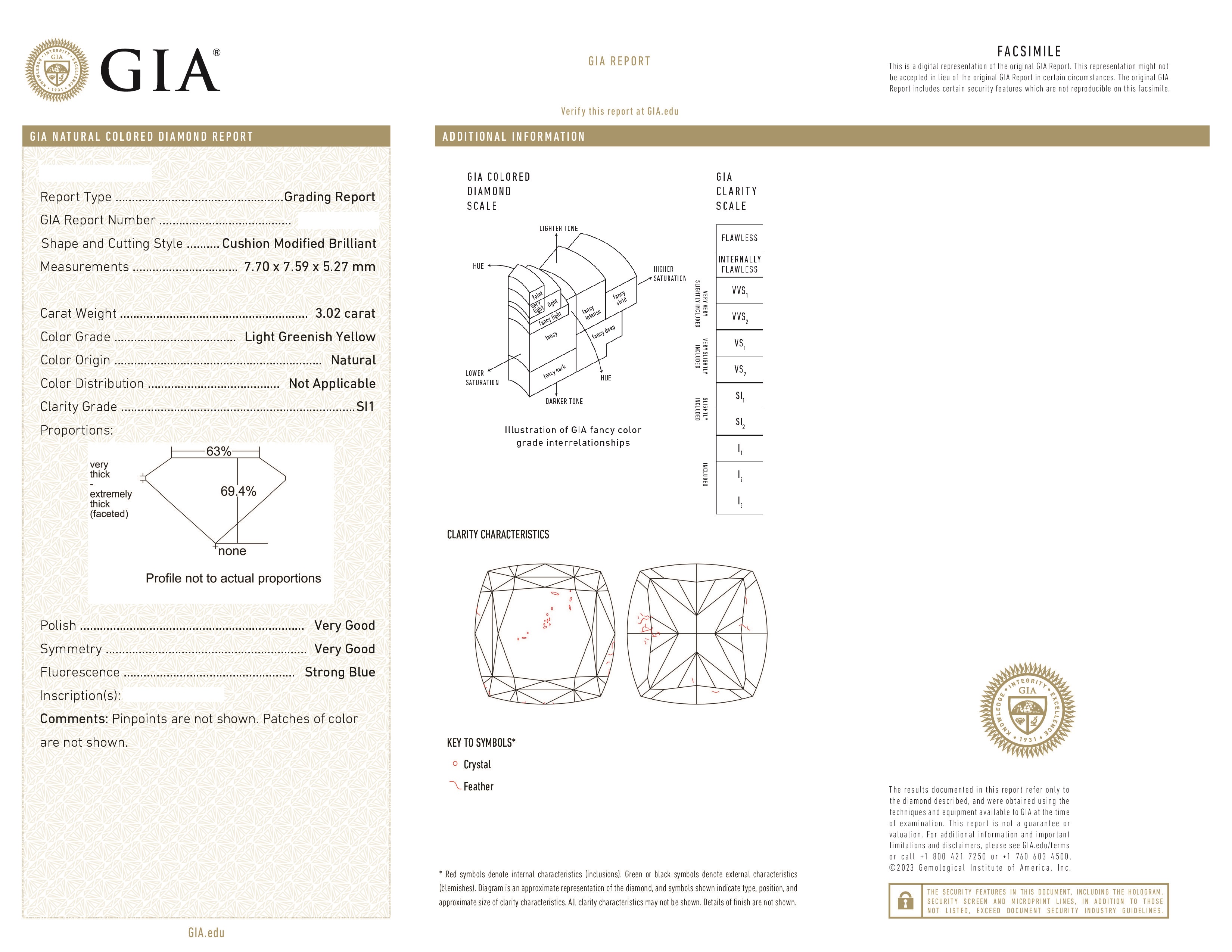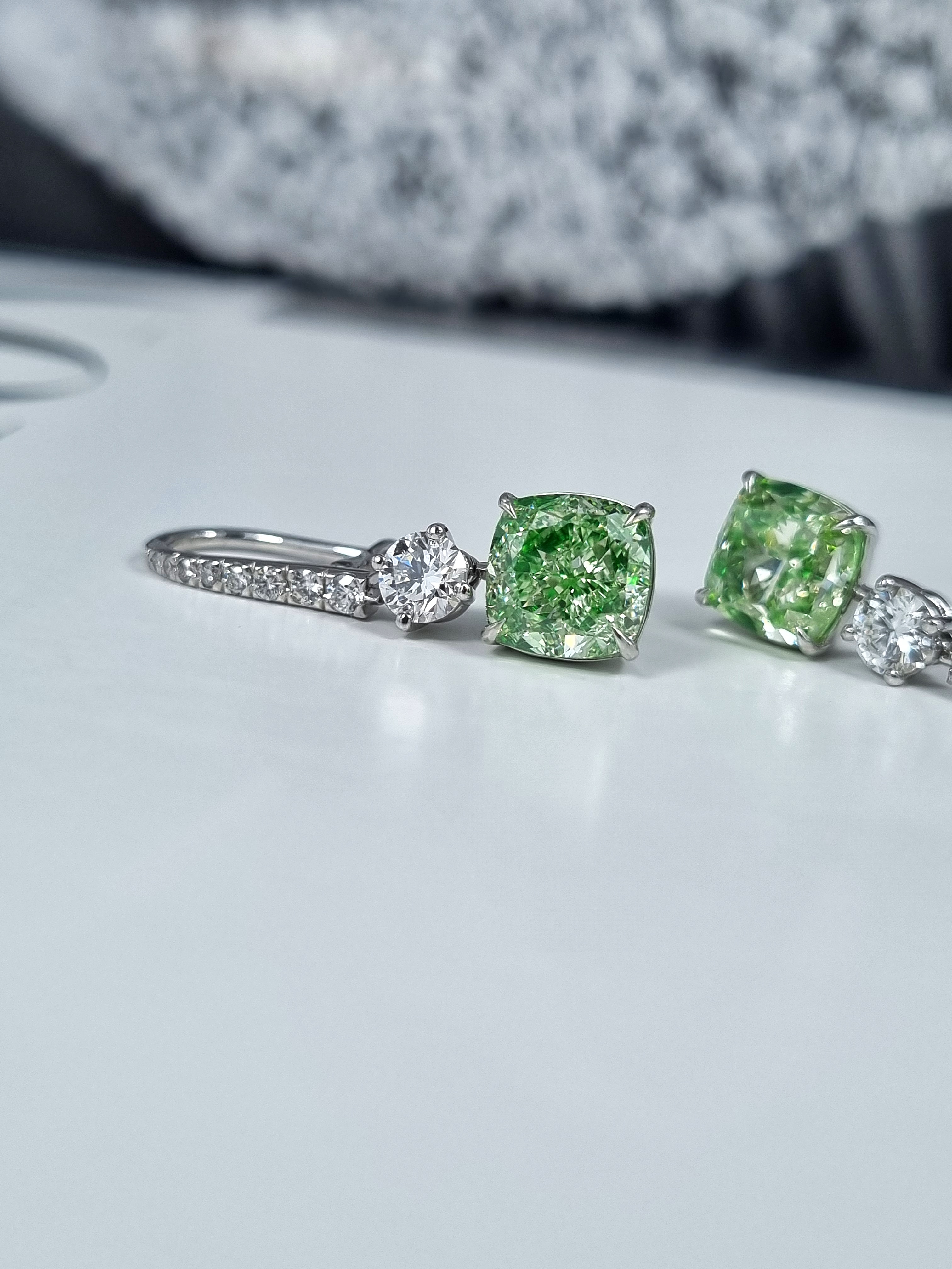 Вставка Нижние бриллианты: 3,01 ct. Light Greenish Yellow/VVS2; 3,02 ct. Light Greenish Yellow/Si1. Средние бриллианты общей массой 0,63 ct. F/VS2. Бриллиантовое паве