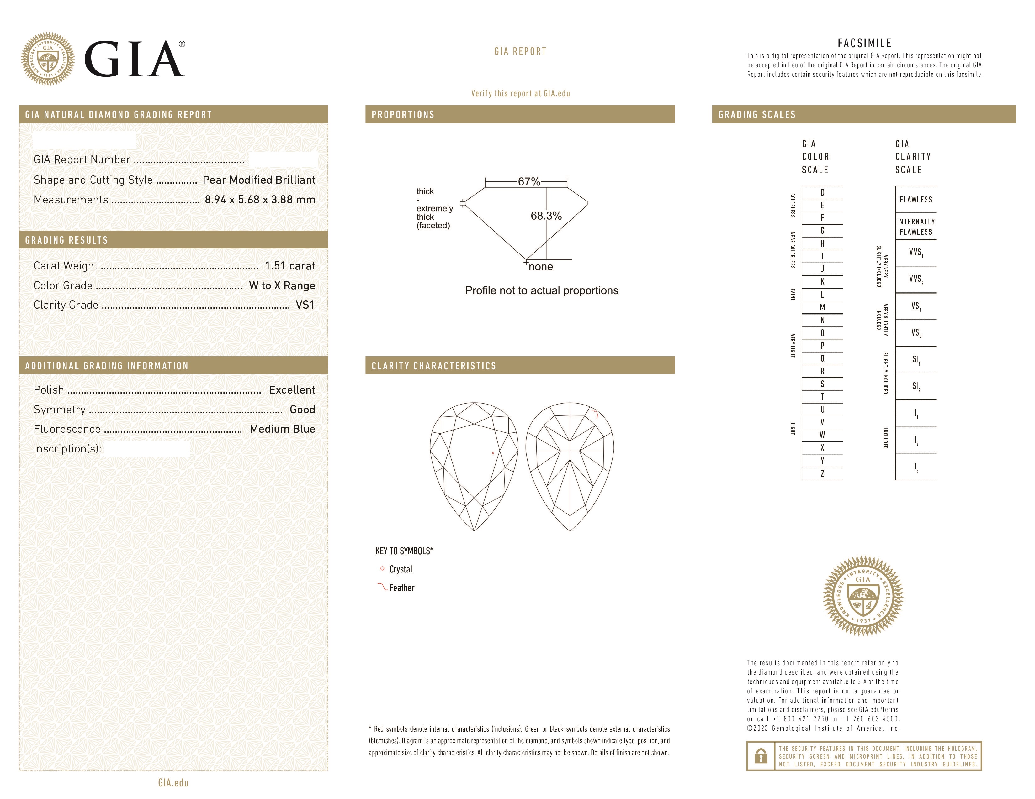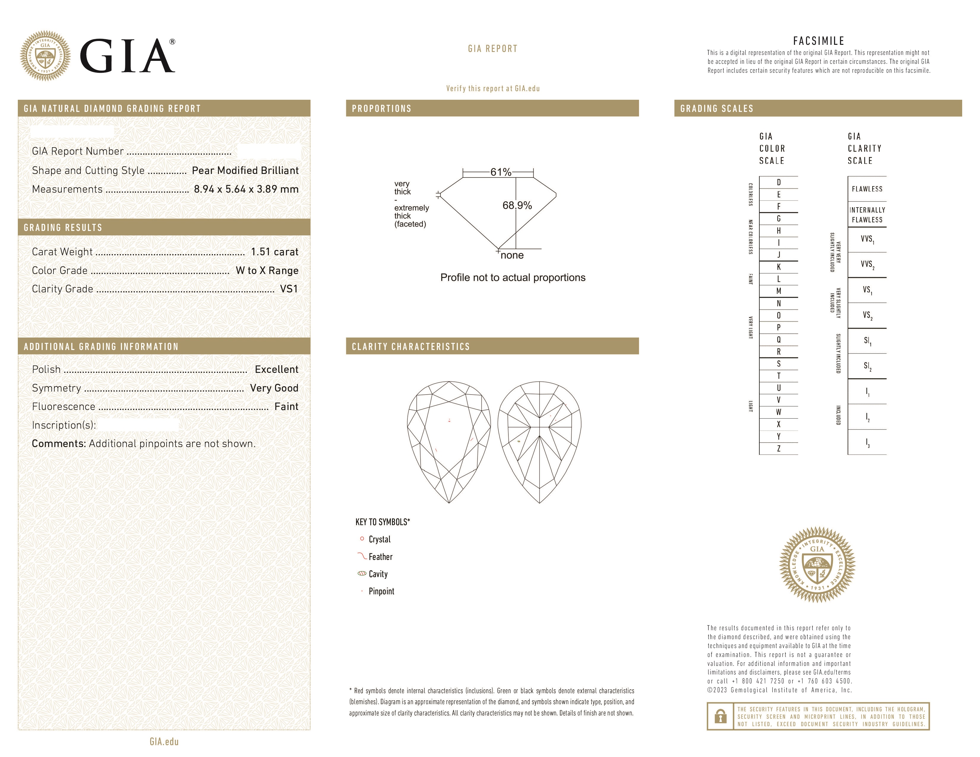 Вставка Нижние бриллианты: каждый по 1,51 ct. W to X/VS1 (Pear). Верхние бриллианты: 0,54/0,55 ct. G/VVS2 (Round)