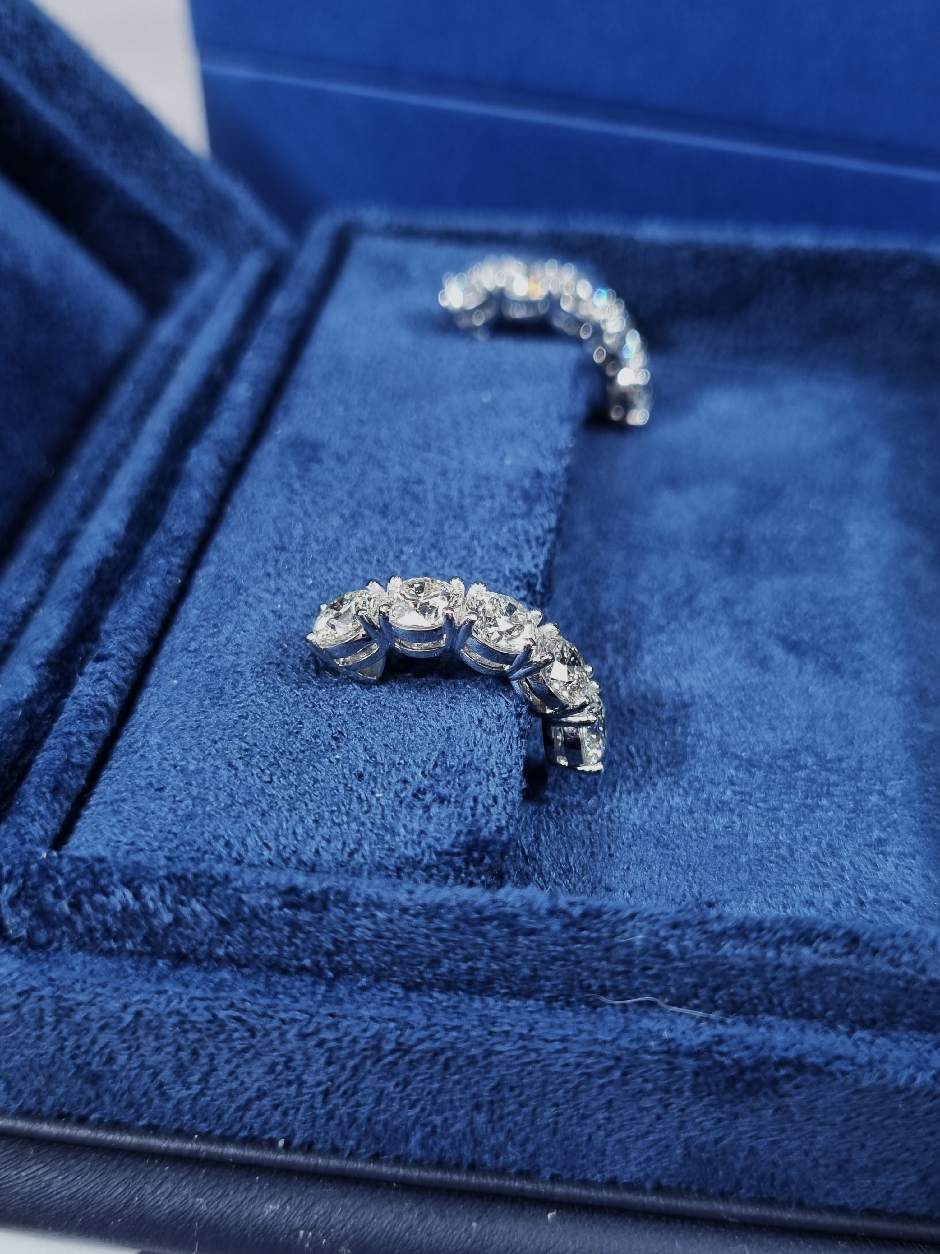 Серьги изготовлены из высококачественного белого золота 750 пробы, что обеспечивает им долговечность и устойчивость к коррозии. Вставка из 10 бриллиантов общей массой 5,01 карата, каждый из которых имеет размер 0,50 ct, K/VVS-VS, создает неповторимую игру света и тени, делая эти серьги настоящим произведением искусства.
