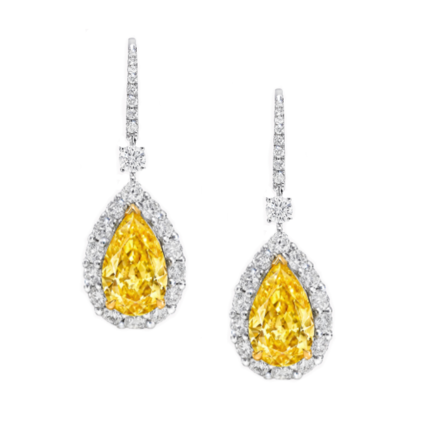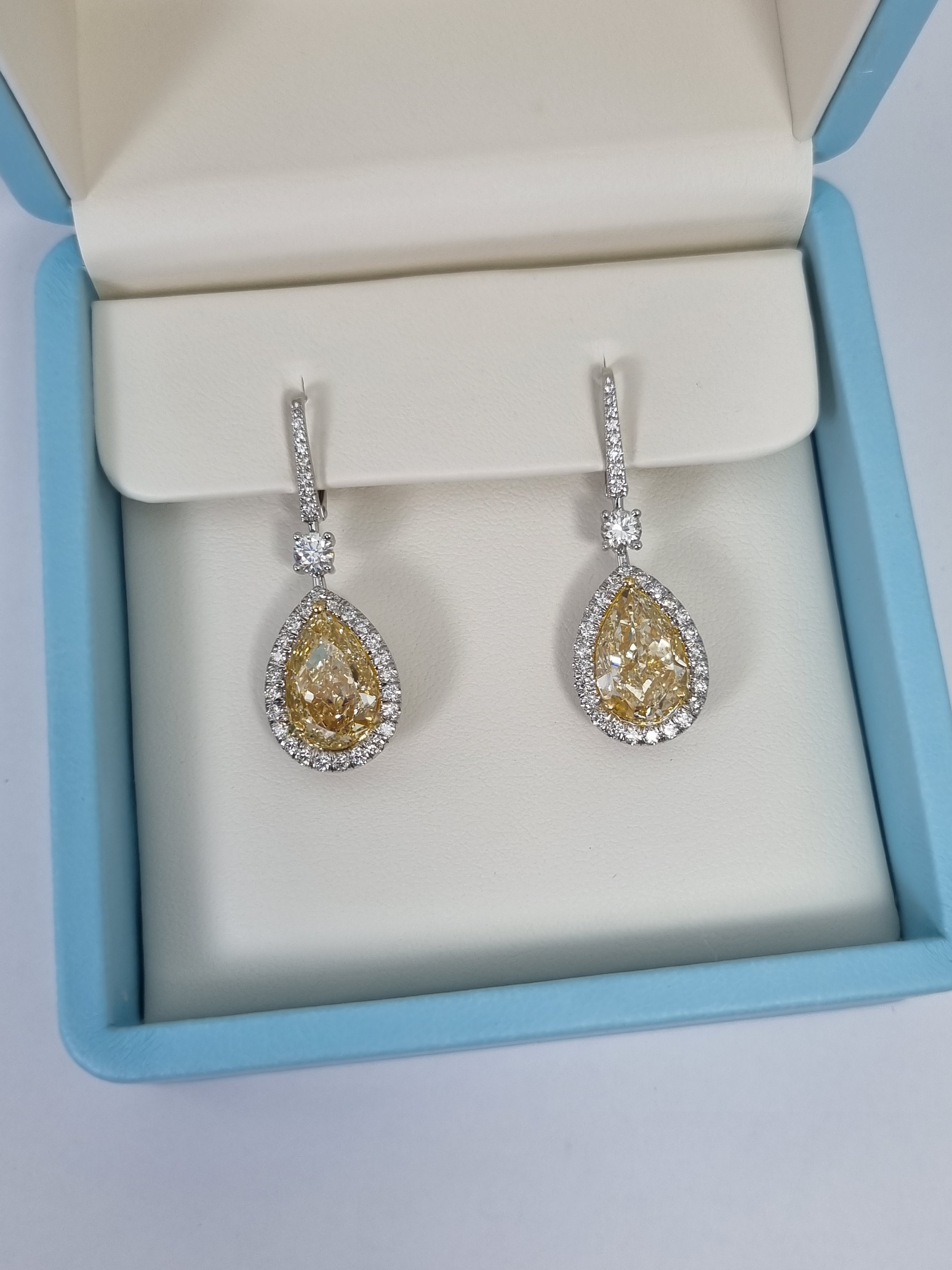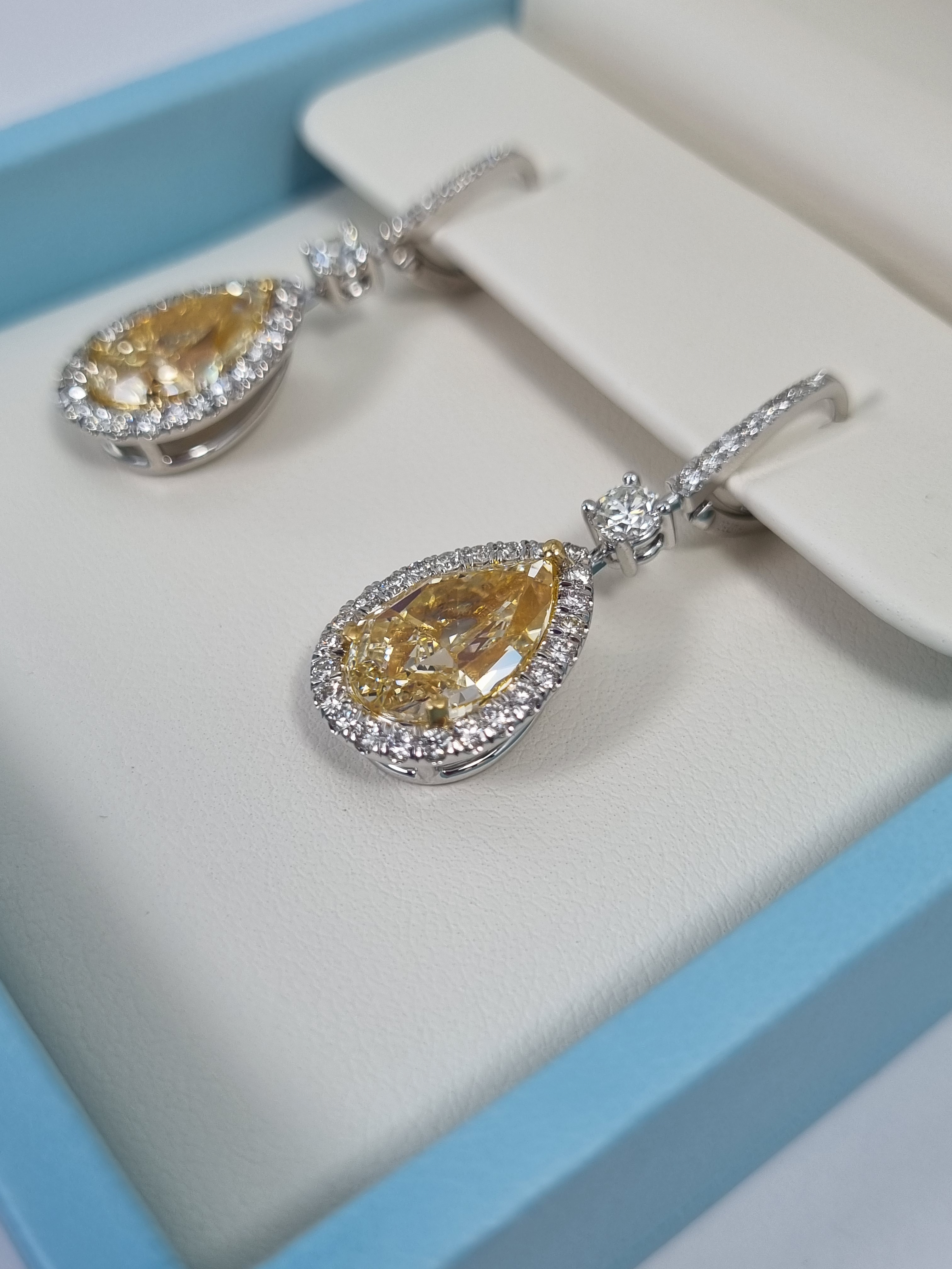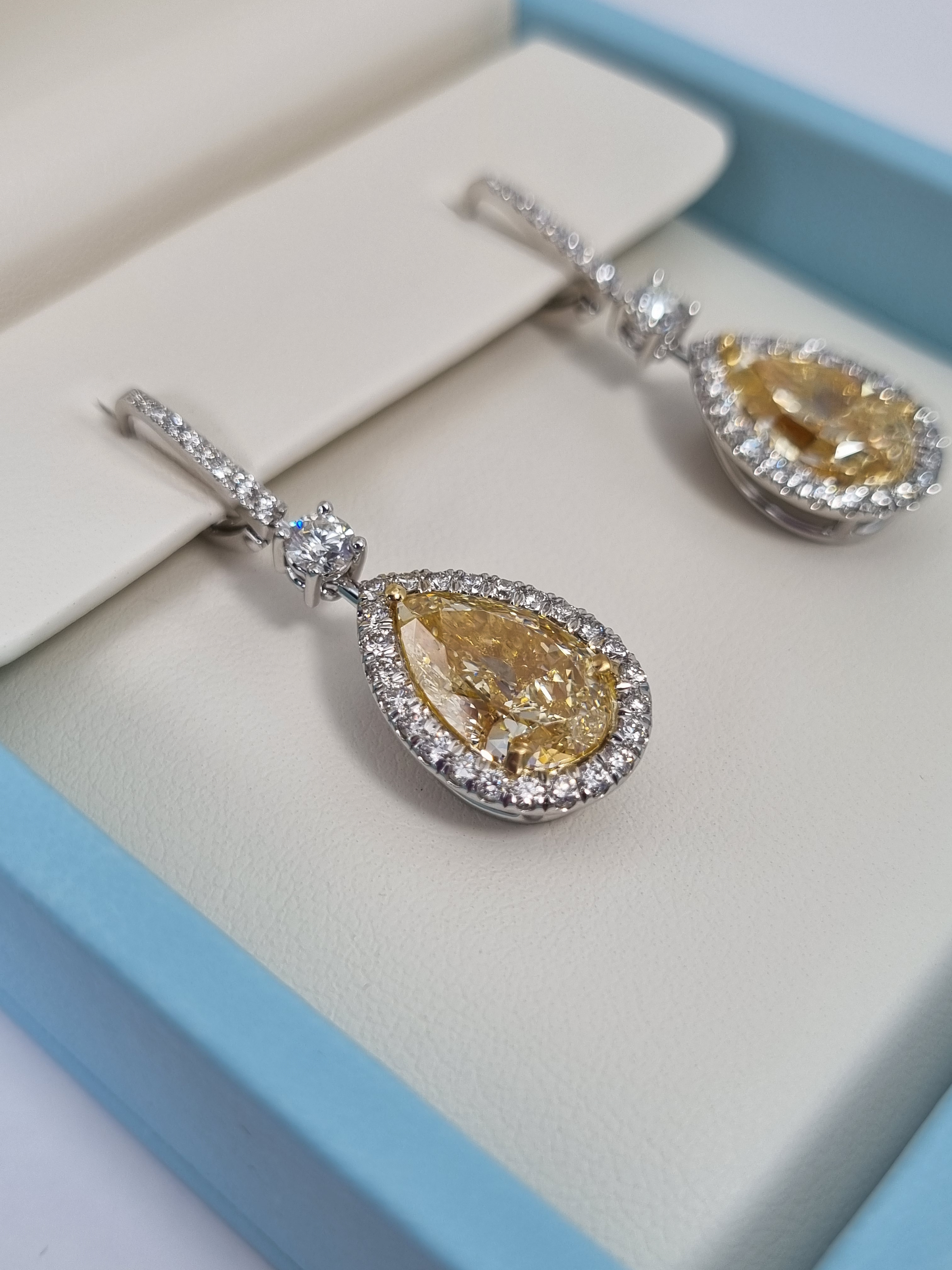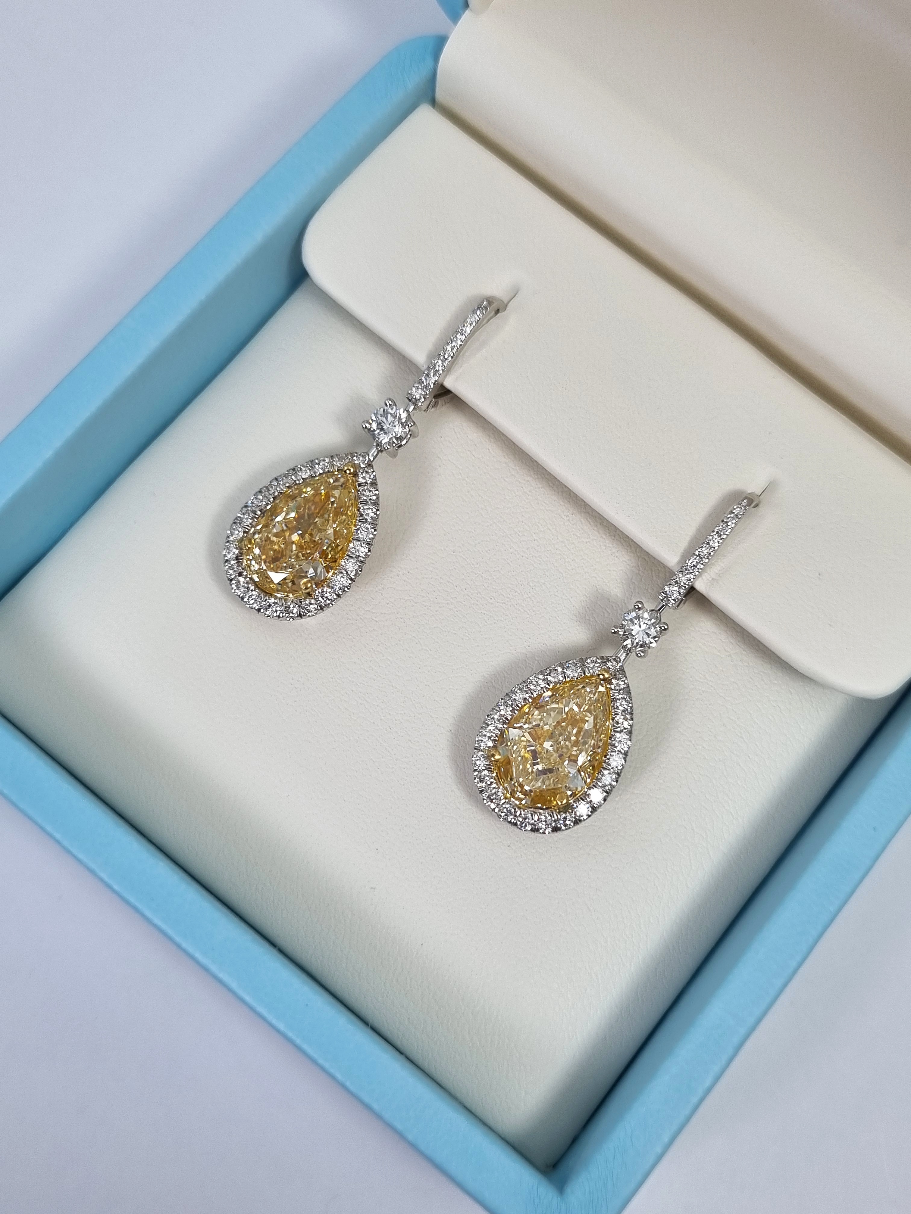 Серьги изготовлены из высококачественного белого золота 750°, что обеспечивает их долговечность и устойчивость к коррозии. В центре каждого изделия находится уникальный бриллиант "Pear" - форма, которая добавляет изделию особую изящность и элегантность. Один из бриллиантов имеет вес 5,03 ct. и обладает цветом "Fancy Light Yellow" с чистотой VS2, а другой весит 5,16 ct. и имеет цвет "W to X Range" с чистотой VS1. Такое сочетание бриллиантов создает неповторимый и роскошный внешний вид.