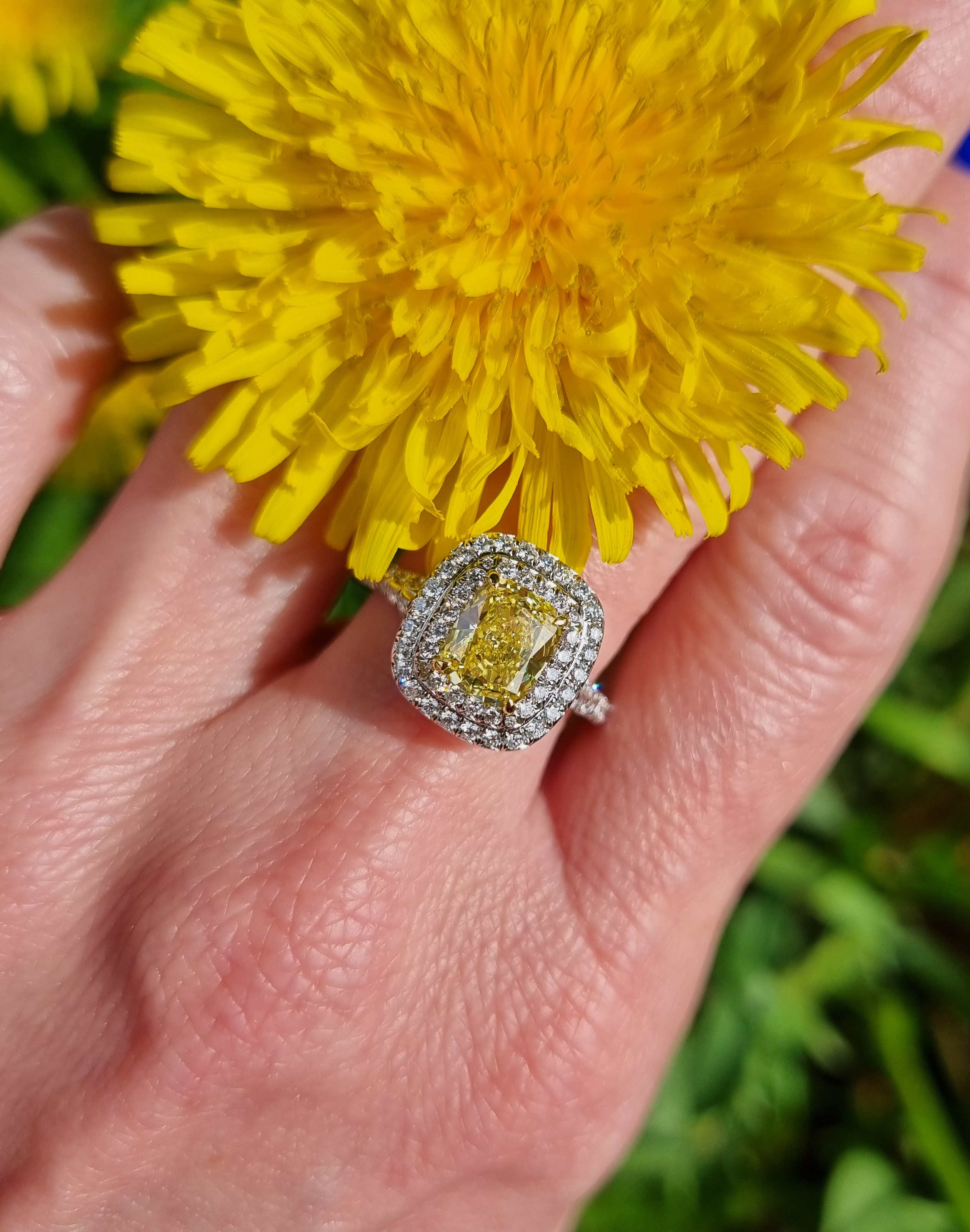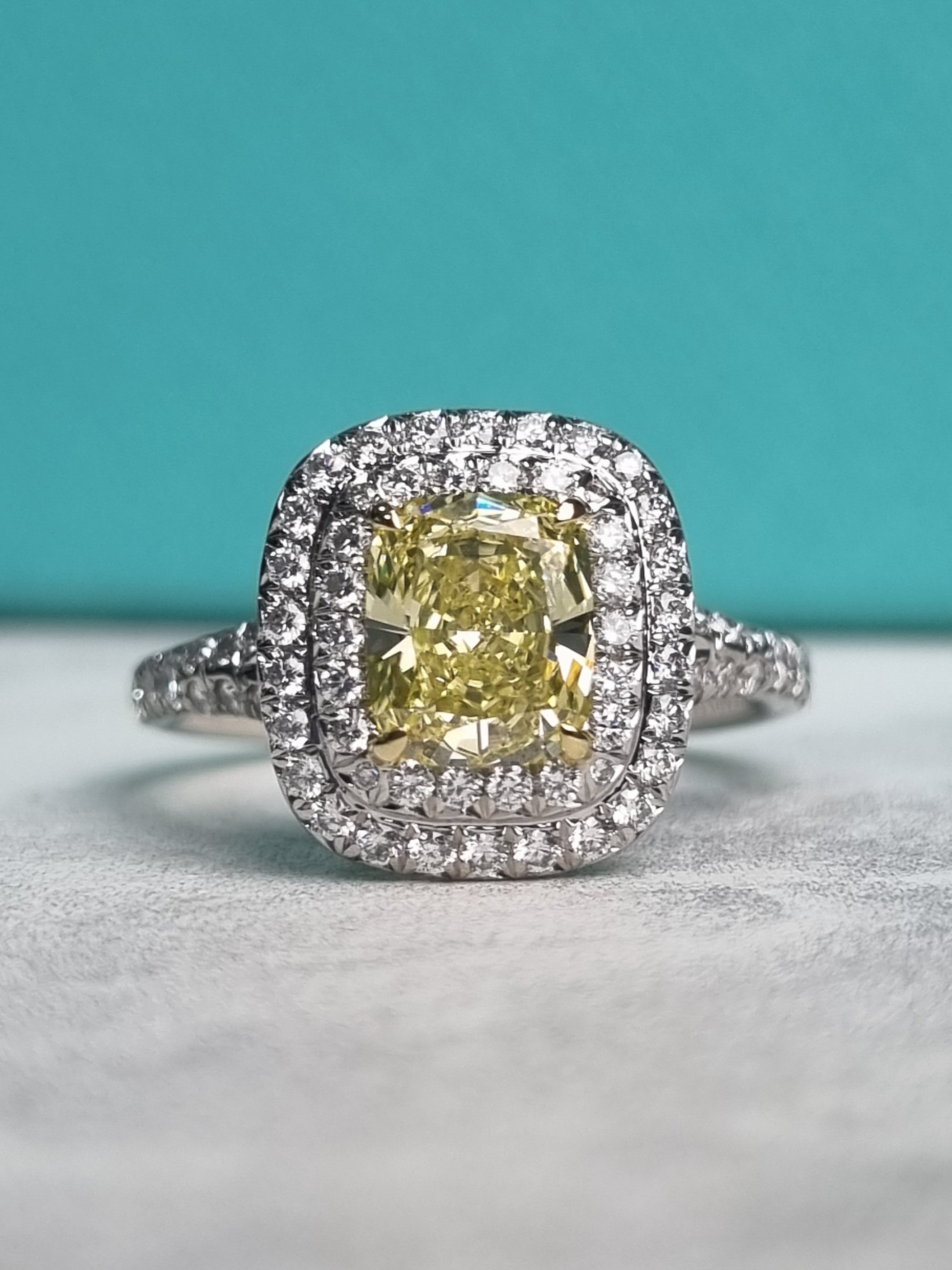 Кольцо Soleste поражает своей роскошью и изяществом. Центральный бриллиант весом 1,13 карата, имеющий форму кушон и интенсивно-желтый цвет, является настоящим шедевром. Этот камень не просто украшает кольцо, а делает его настоящим произведением искусства. Бриллиант имеет сертификат, подтверждающий его подлинность и качество.