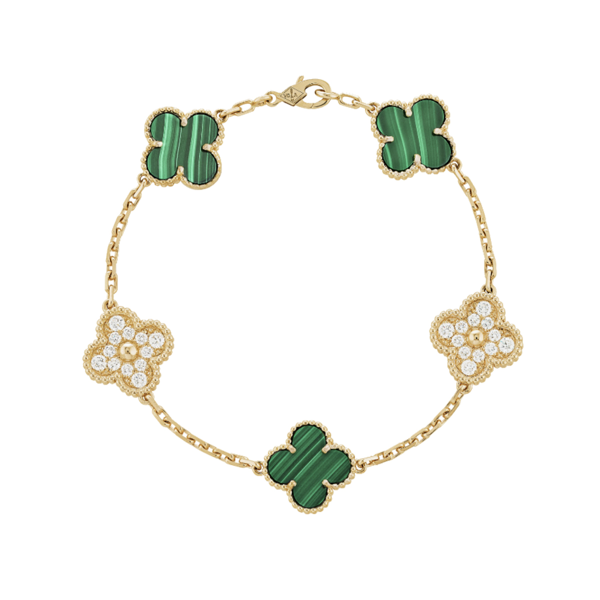 Браслет выполнен из желтого золота 750 пробы, что придает ему особую прочность и долговечность. Размер изделия составляет 19 см, что делает его идеальным для любого запястья. Особое внимание привлекает вставка малахита, который своим глубоким зеленым оттенком добавляет браслету неповторимый шарм. Кроме того, 24 бриллианта общим весом 0,97 карата, вставленные в изделие, создают игру света и добавляют ему роскоши.