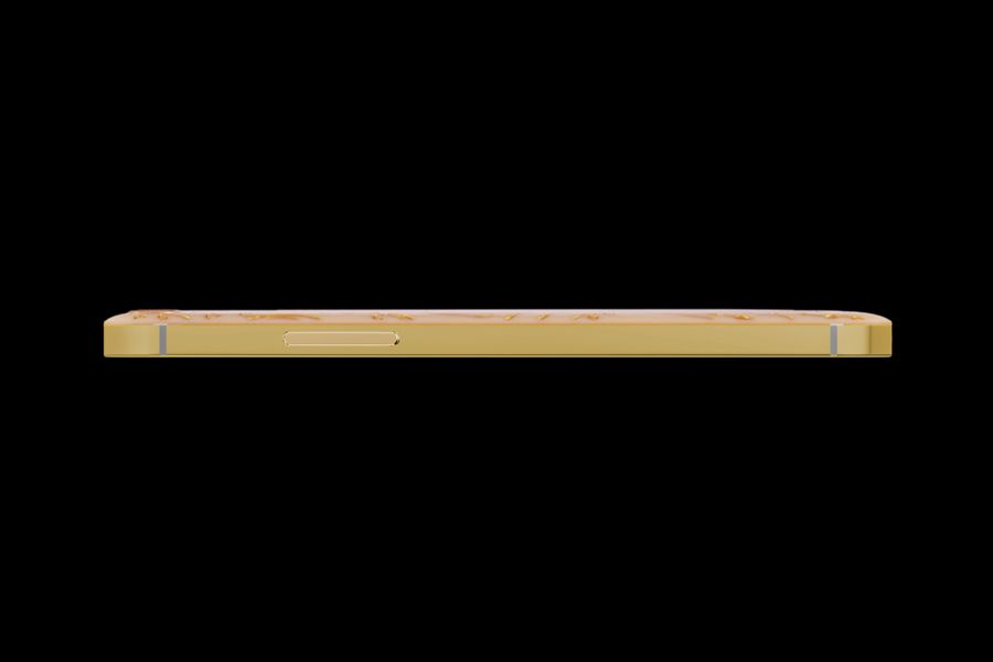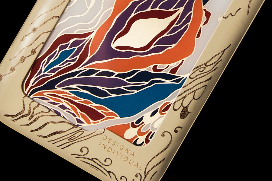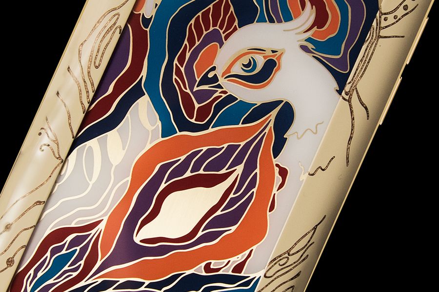 Заднаяя панель Ювелирный материал “Стальное дерево”. Бирюза с добавлением золотой пыльцы и алмазной пыли. Ромбовидный орнамент покрыт двухцветной холодной ювелирной эмалью. Окантовка вокруг камеры и болтов выполнена из глянцевого золота 18 карат